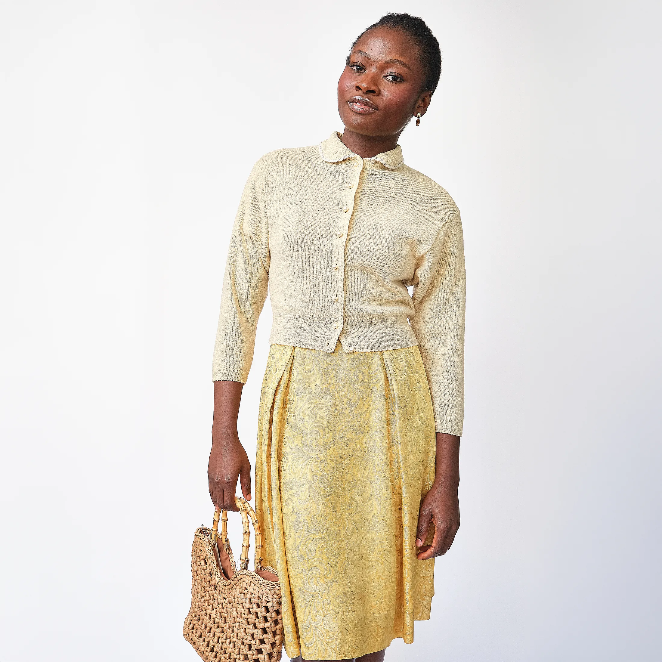 The kind of cardigan Jackie O would toss over her shoulders on the way to a private gallery viewing. This 1950s/60s-era bouclé knit cardigan by Kimberly Knitwear is sculpted in a soft cream wool blend and finished with dainty faux pearl buttons. Bracelet-length sleeves and a slightly cropped hem create a crisp, timeless line, while the texture brings just enough charm to layer into modern wardrobes. A capsule essential for the quiet collector or the polished minimalist.