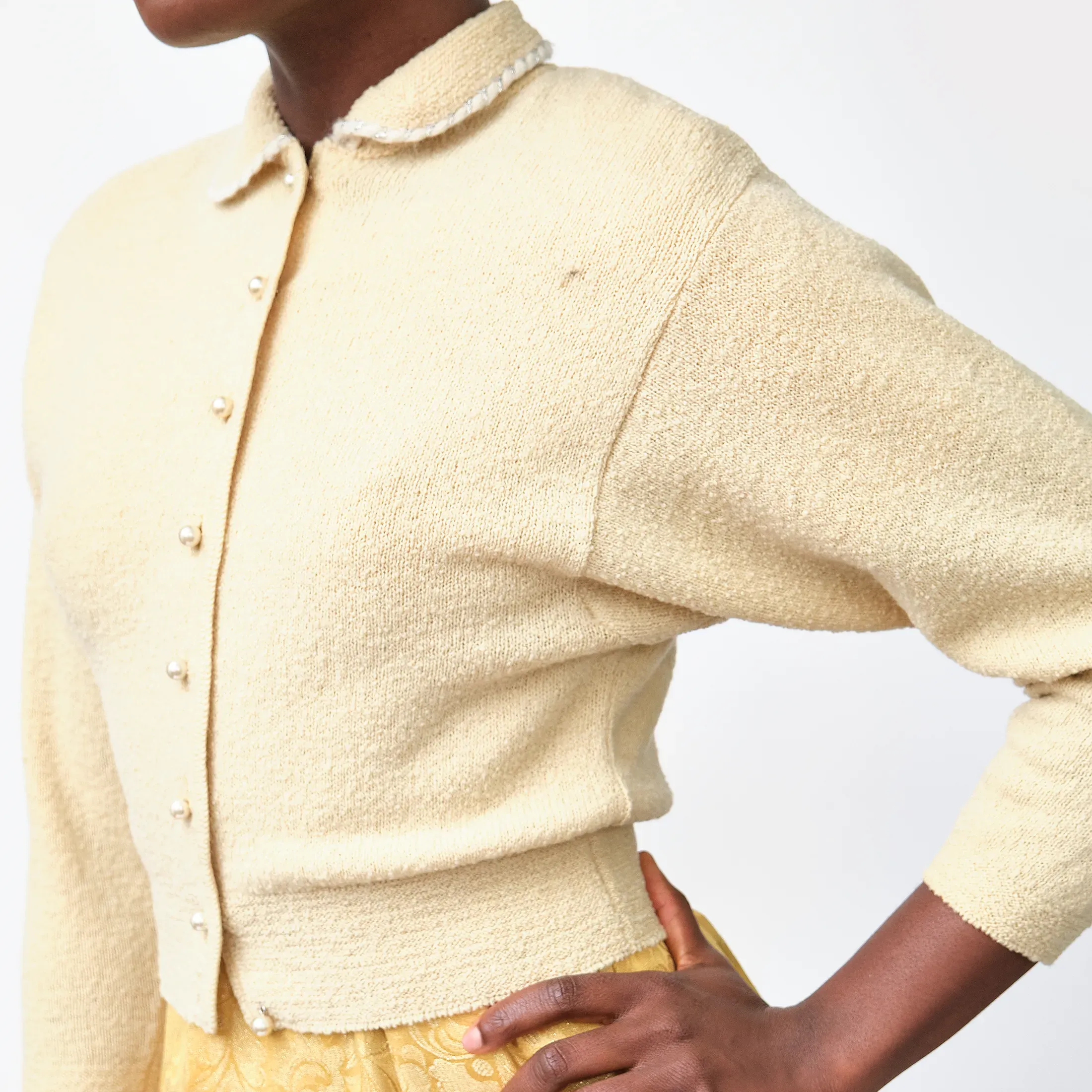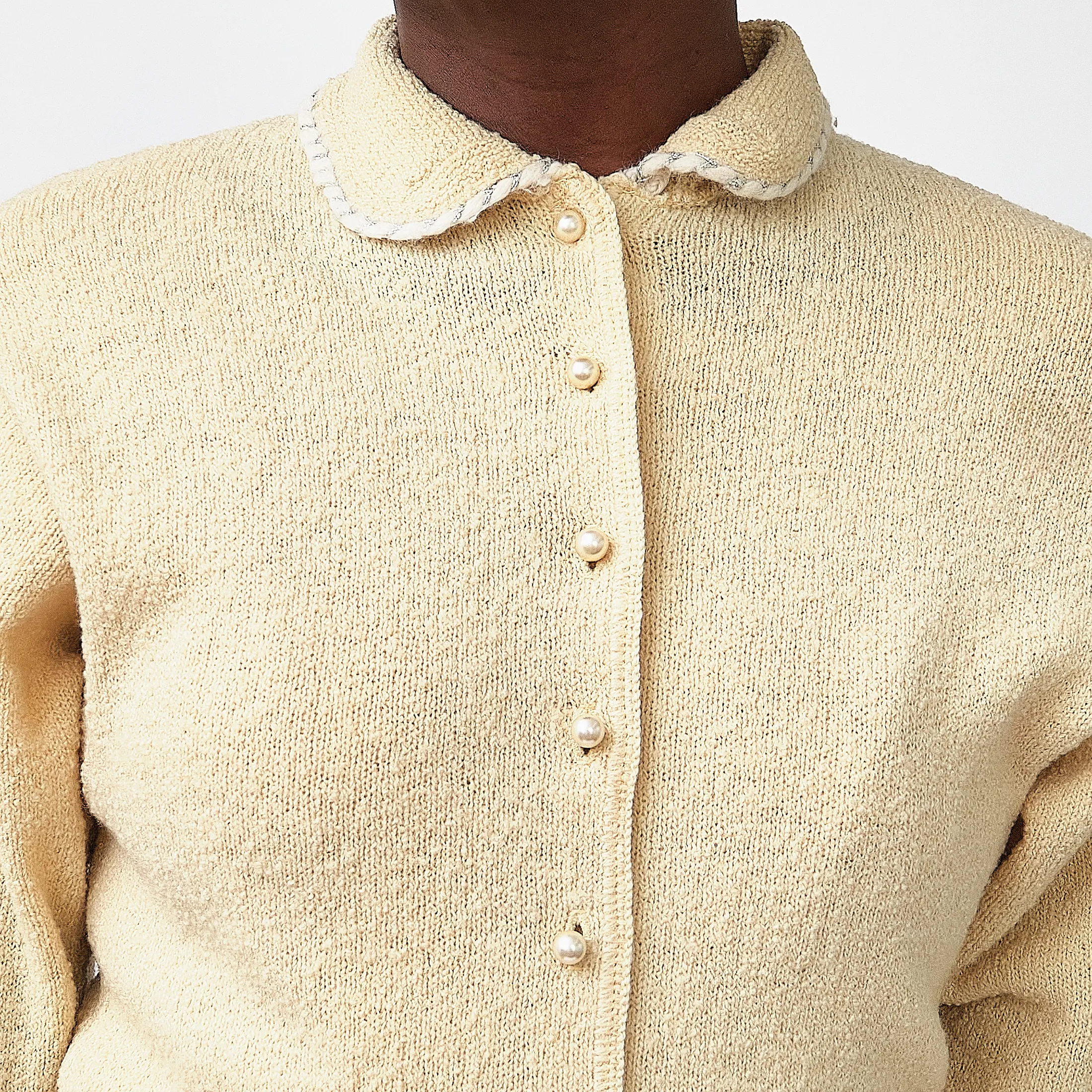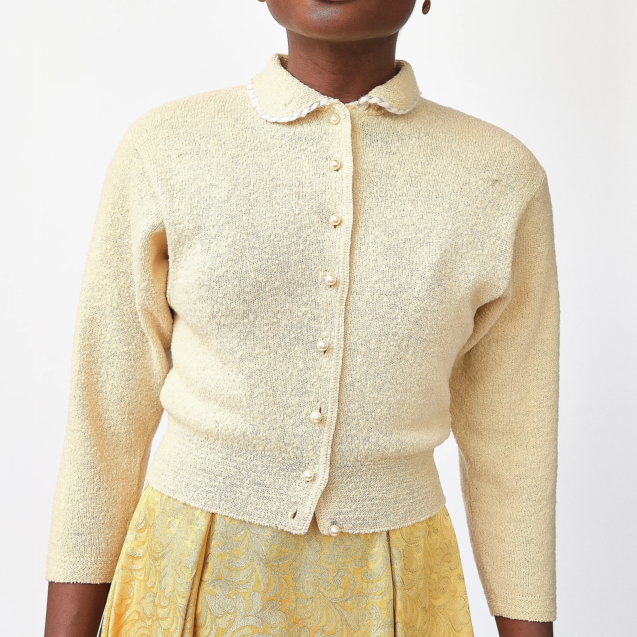 1950s Kimberly Knitwear Cream Bouclé Cardigan – Faux Pearl Button Detail