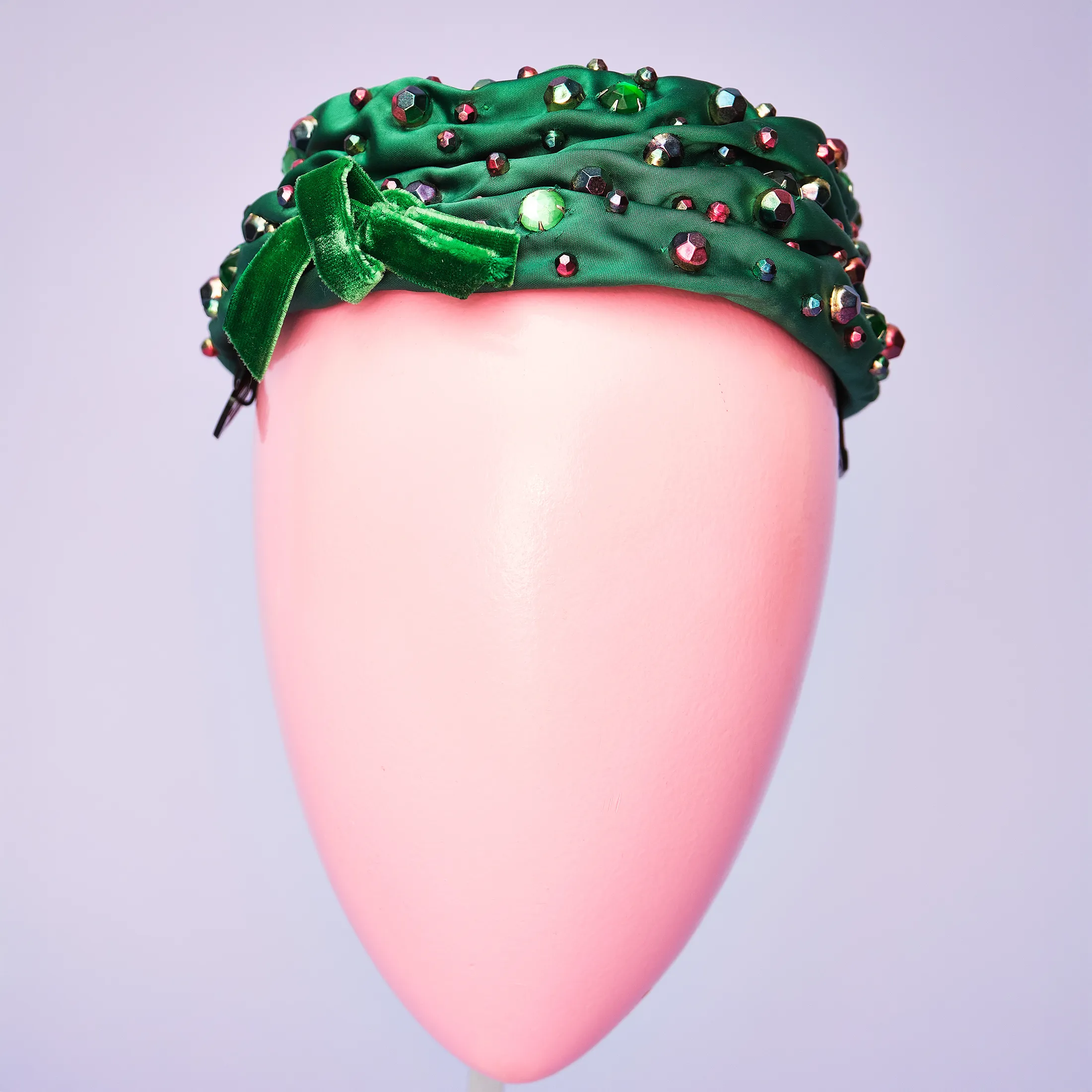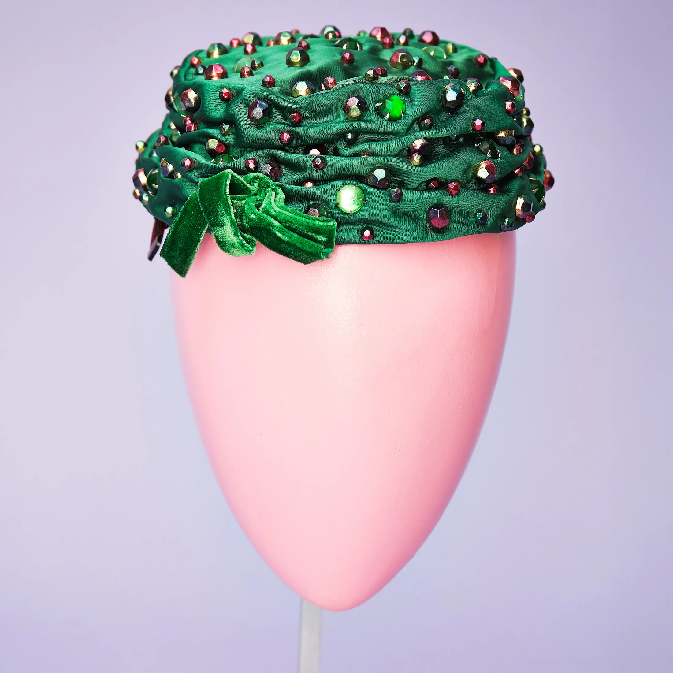 A dazzling 1950s Patrice cocktail hat in deep emerald satin, studded with oversized iridescent stones and finished with a velvet bow. Regal, rare, and ready for its next soirée.