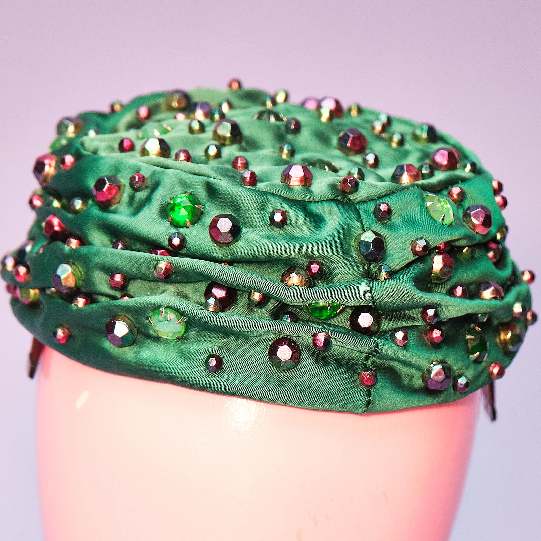 Straight from the jewel box of midcentury elegance, this 1950s emerald green satin hat by Patrice is a sculptural confection of sparkle and structure. Its ruched construction is encrusted with bracket-set iridescent stones in garnet and emerald tones—set into the fabric rather than glued—evoking the quality of true couture millinery.