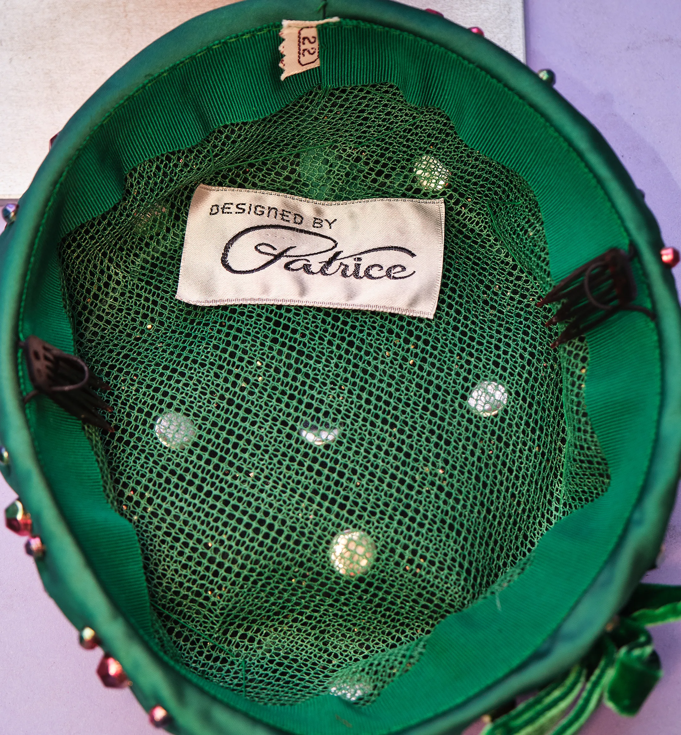 Patrice was among a wave of post-war American milliners known for dramatic but wearable cocktail hats during a time when headwear remained a social essential. While little is published about the label’s full history, surviving examples—particularly jeweled ones in excellent condition—are rare.