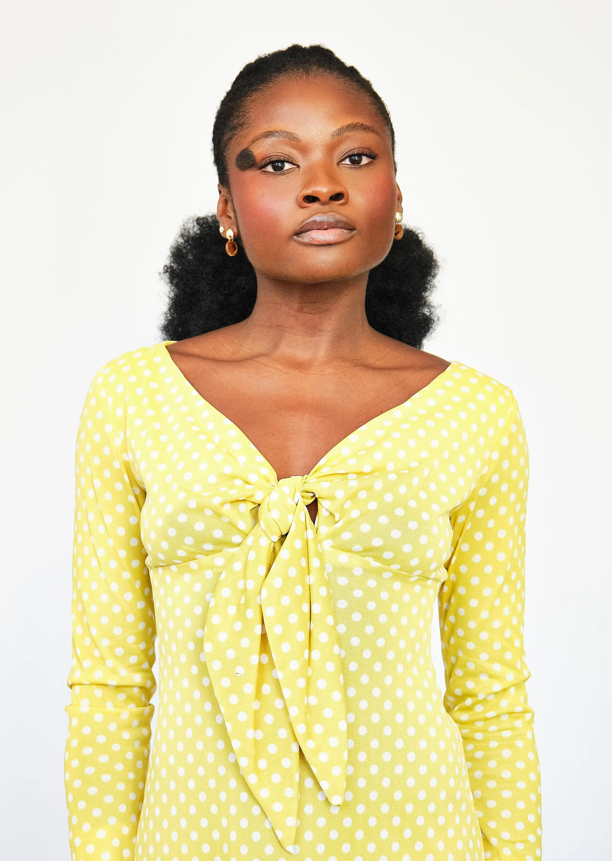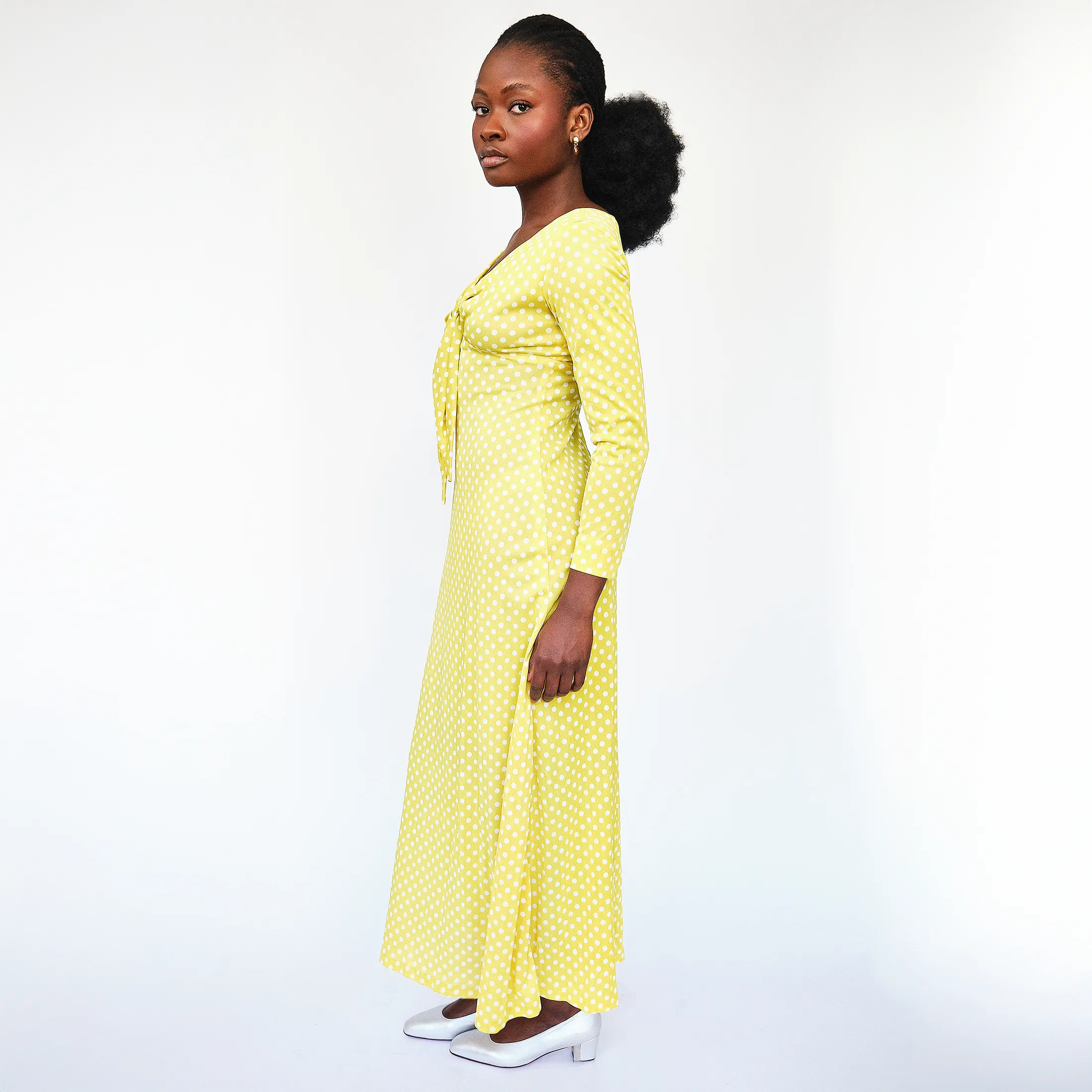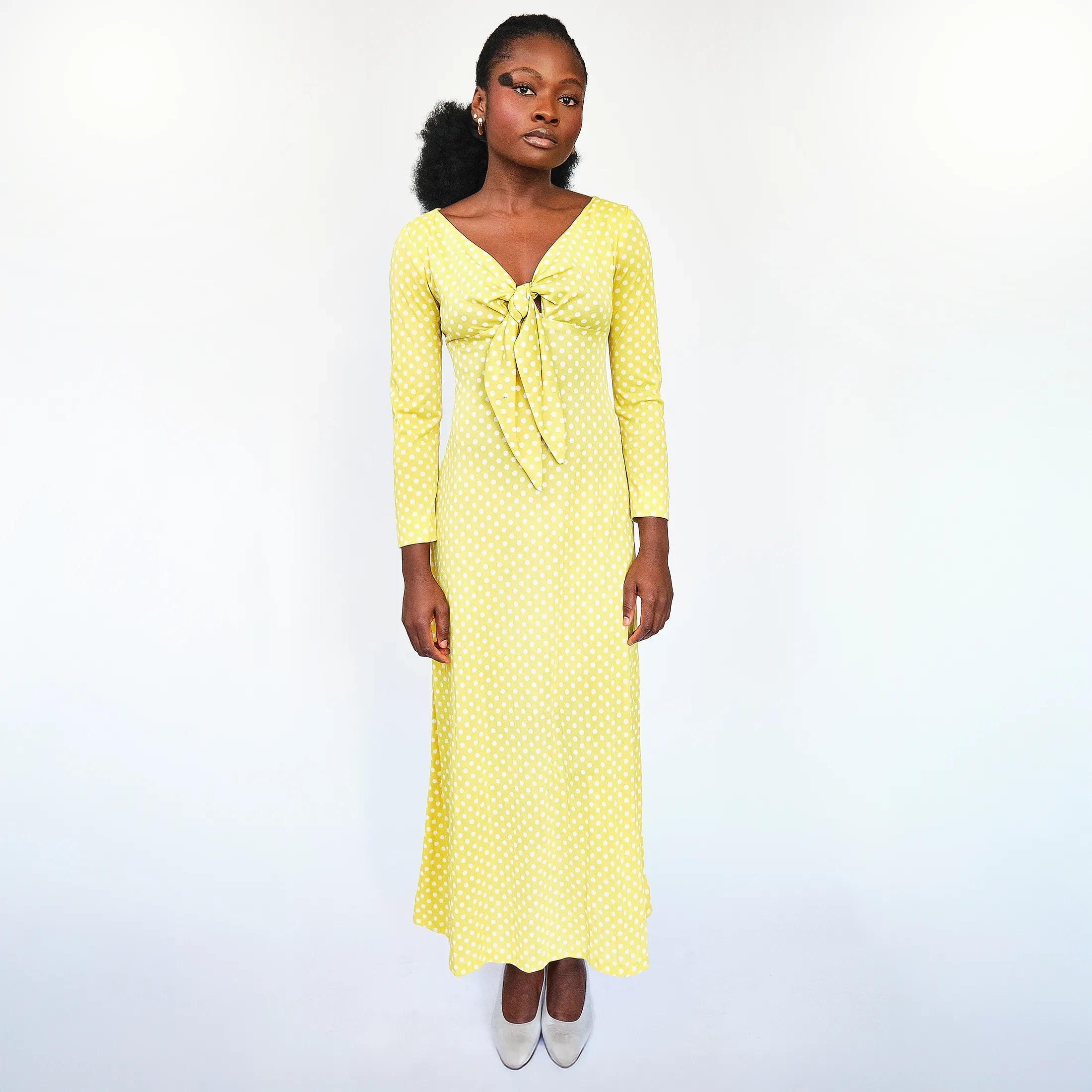 Channel your inner sixties ingénue in this sunshine-slick empire dress. Covered in a playful white polka dot print and cut in a feminine empire silhouette, this piece is a daydream spun in nylon. A gathered front-tie detail gives structure without stiffness, while the full-length skirt brings just enough sweep to nod toward mod. Made for afternoon gallery strolls in Chelsea or vintage market meanders in Williamsburg. Pairs effortlessly with block-heel pumps or your freshest sneakers for a hi-low remix.