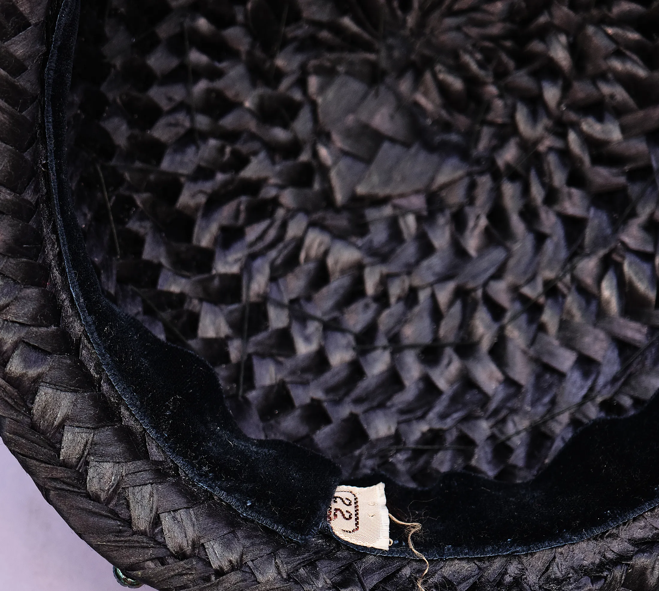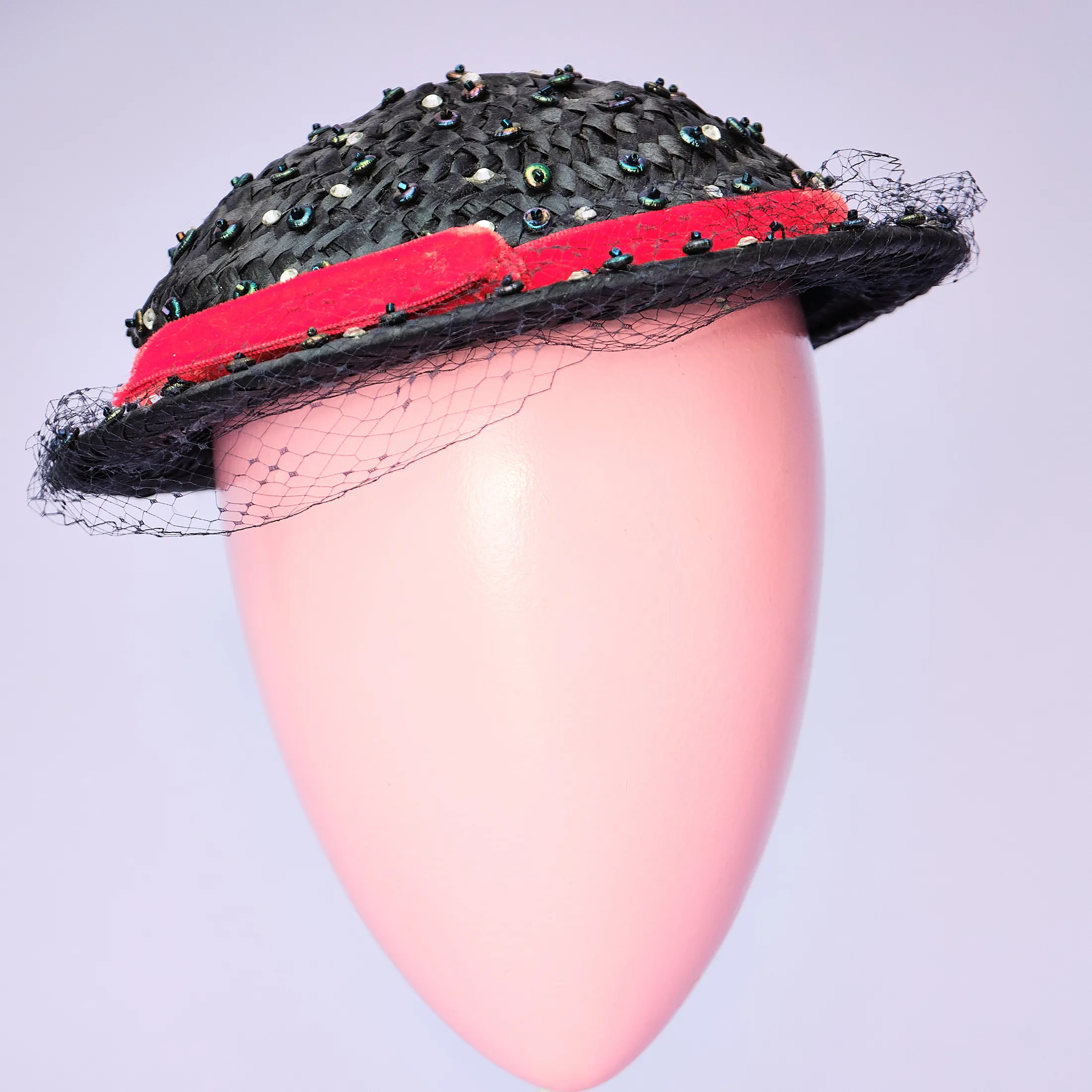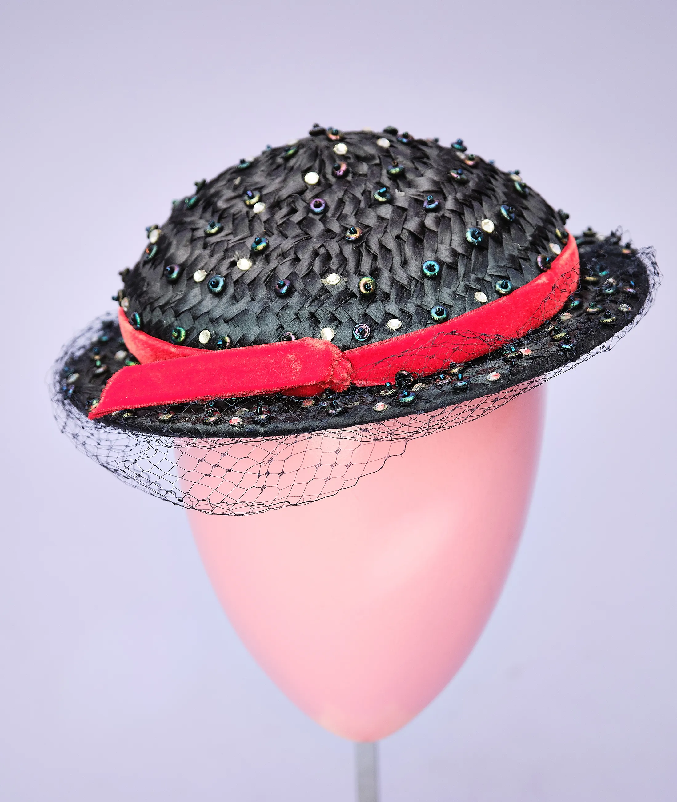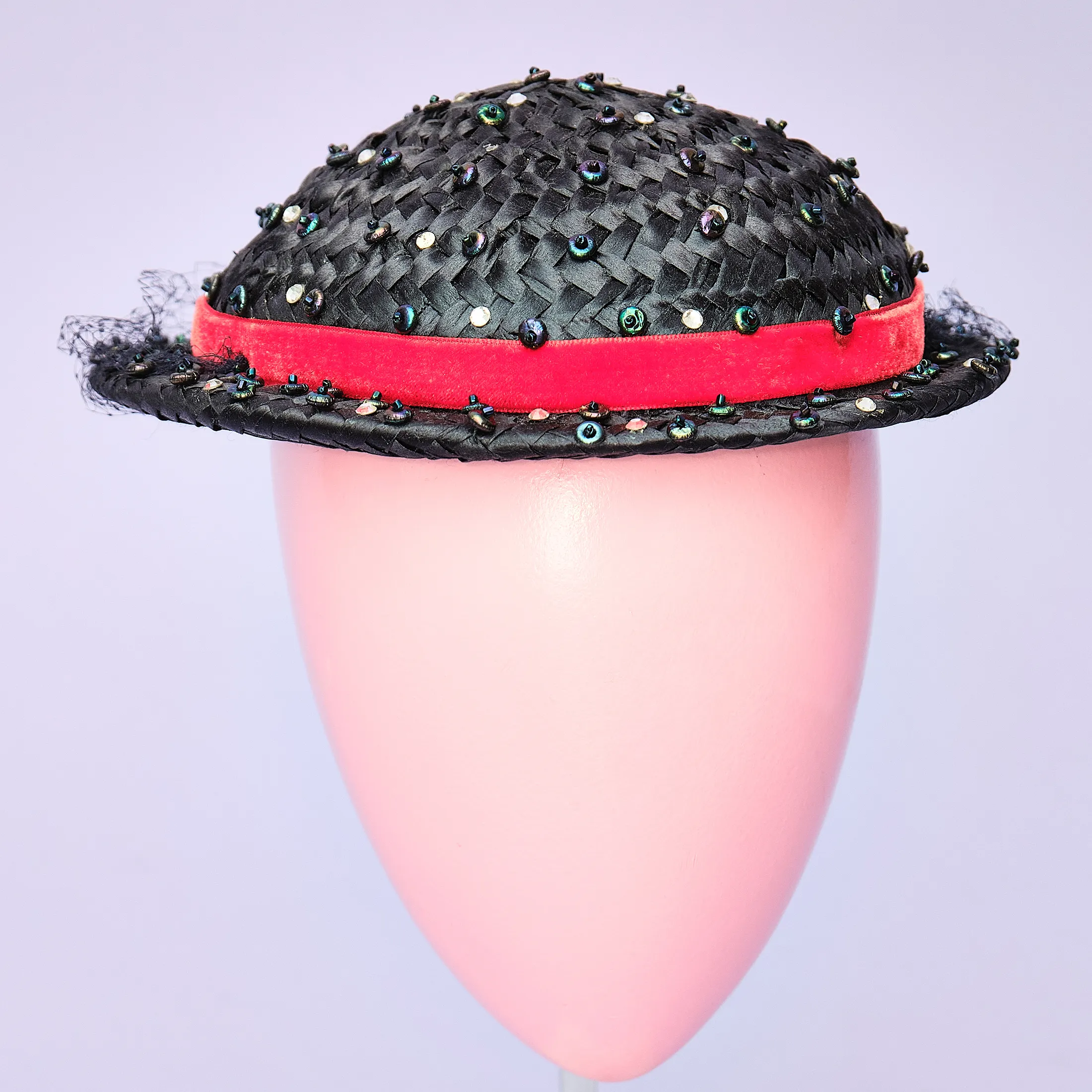 Era Notes: Based on the materials (cellulose straw, faceted plastic beads, velvet trim), rounded shape, and sizing method, this piece most likely dates to the late 1950s to early 1960s. The absence of a maker label is not uncommon in midcentury millinery, particularly in department store house brands or custom orders.