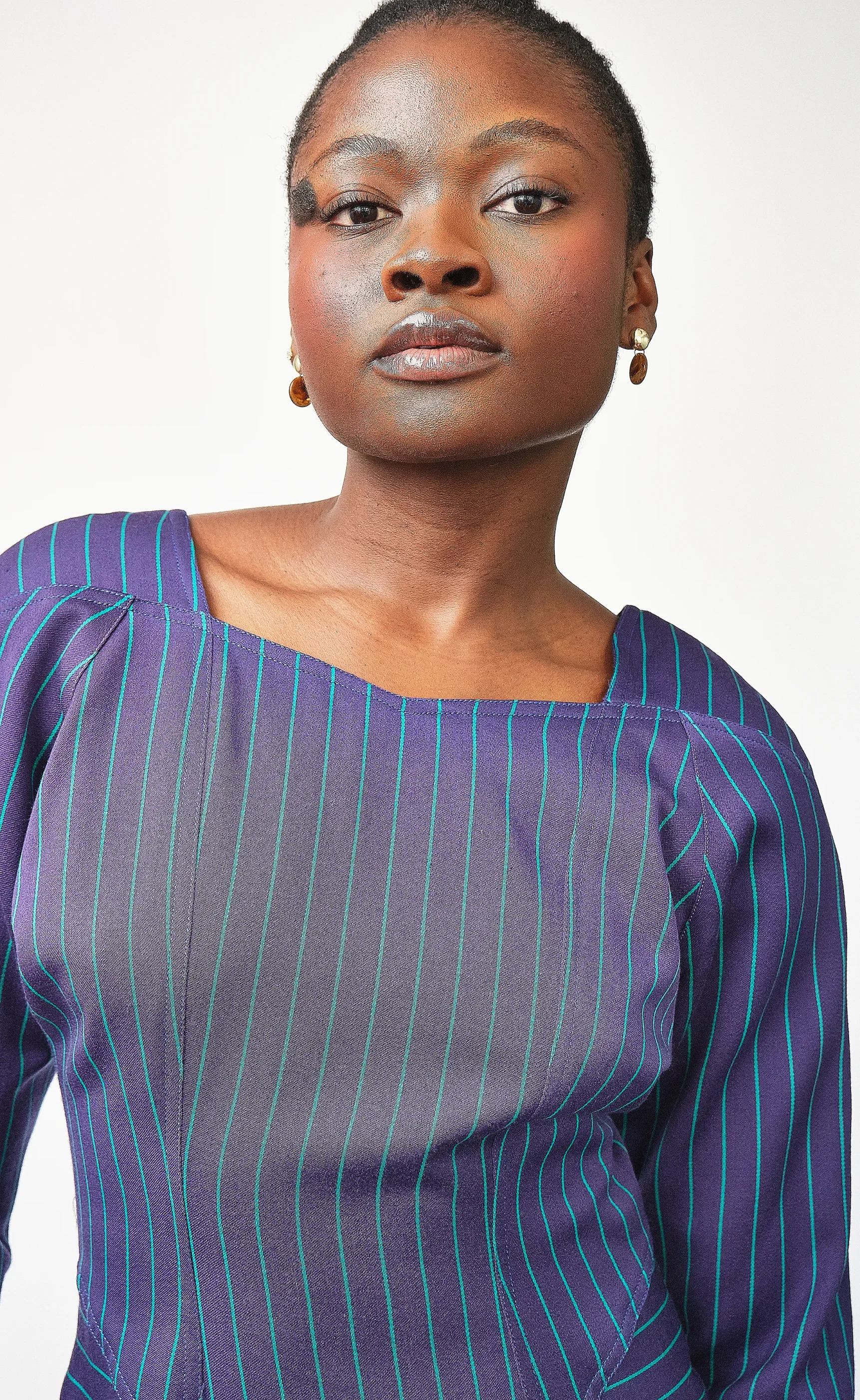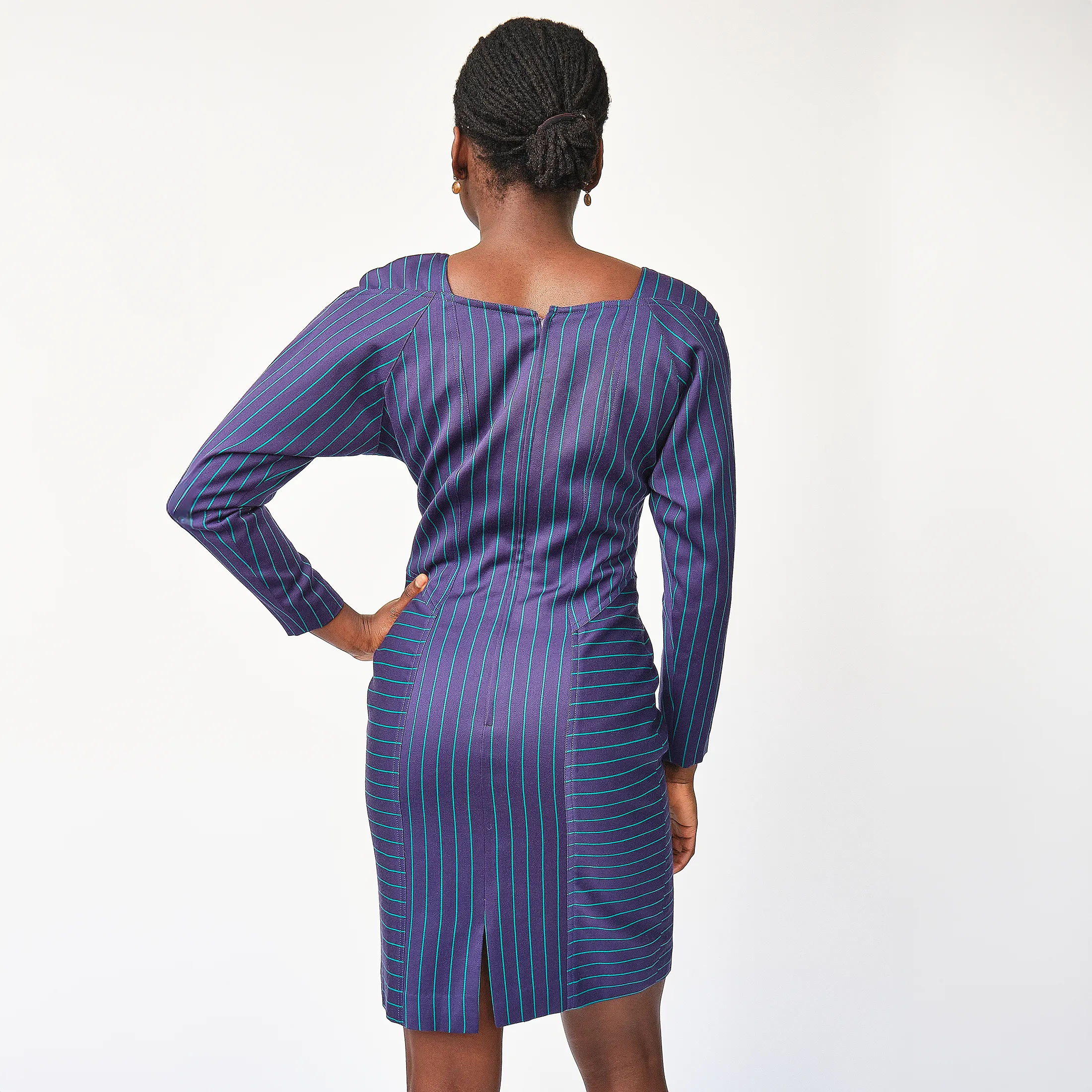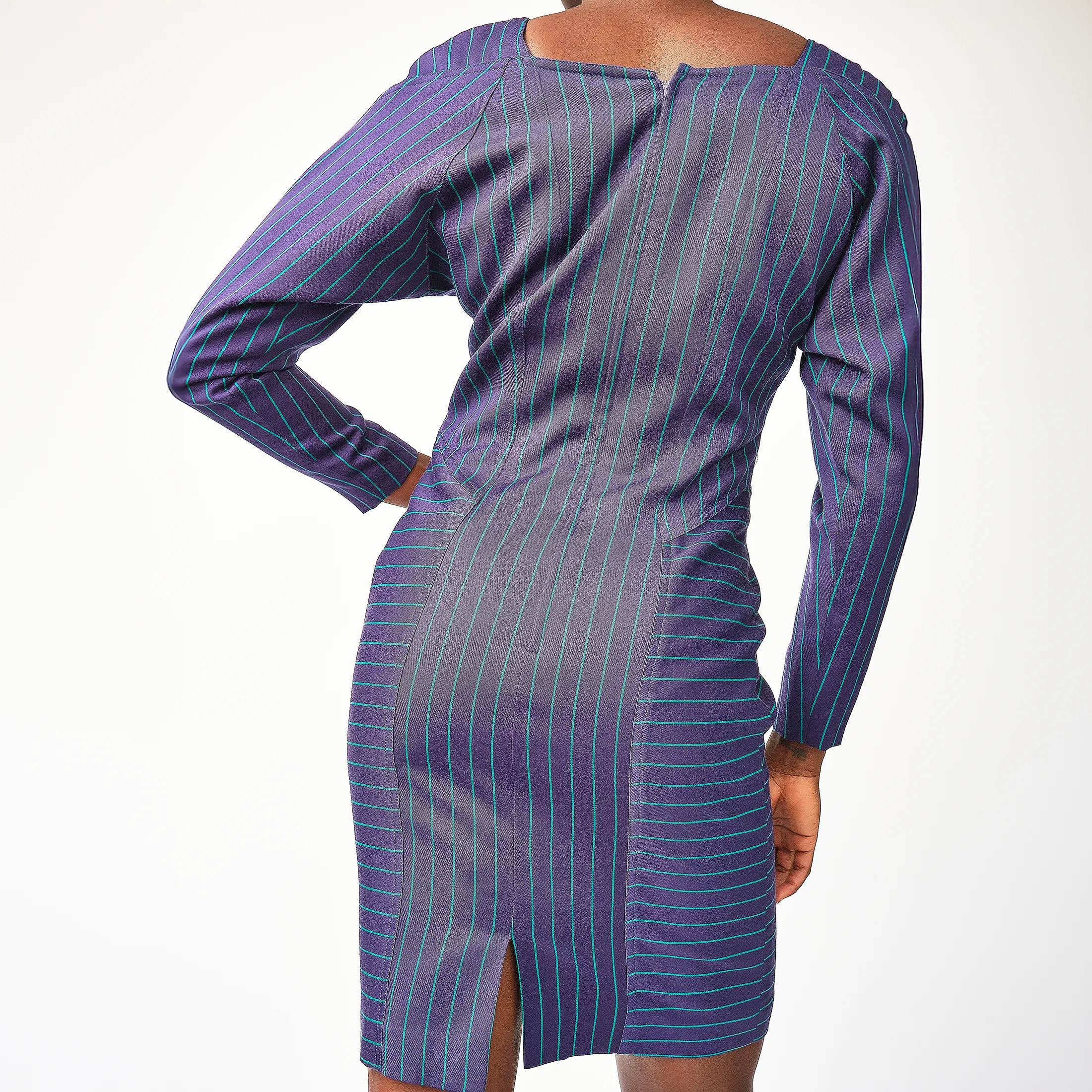 Step aside, basic boardroom—this vintage André Luciano pinstripe dress is serving elevated executive realness with a wink. Crafted from a structured midweight wool in a deep plum base with teal and cobalt blue pinstripes, this dress plays with linear direction in all the right ways: vertical at the center to elongate, diagonal at the side panels to contour, and horizontal at the hips to add architectural dimension.