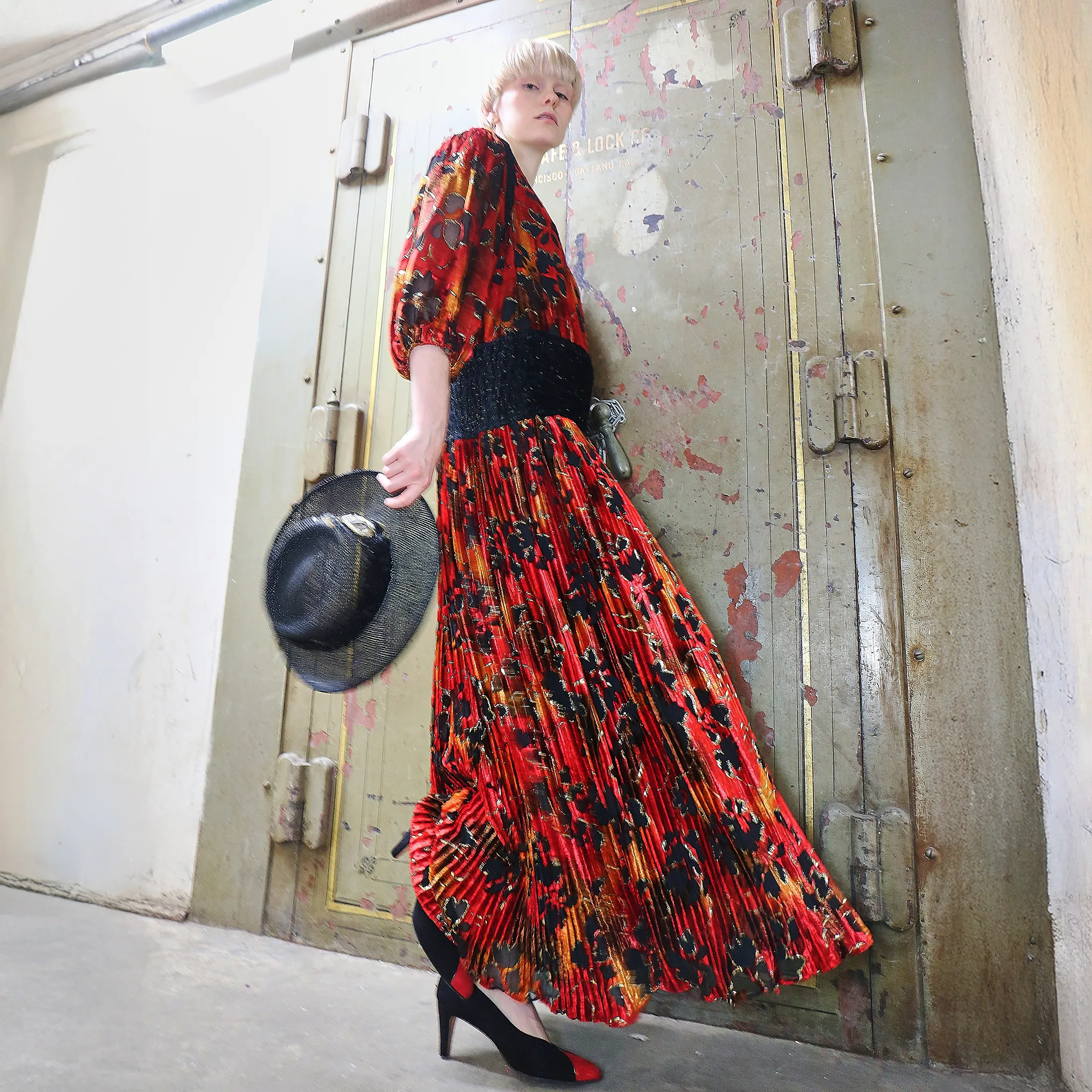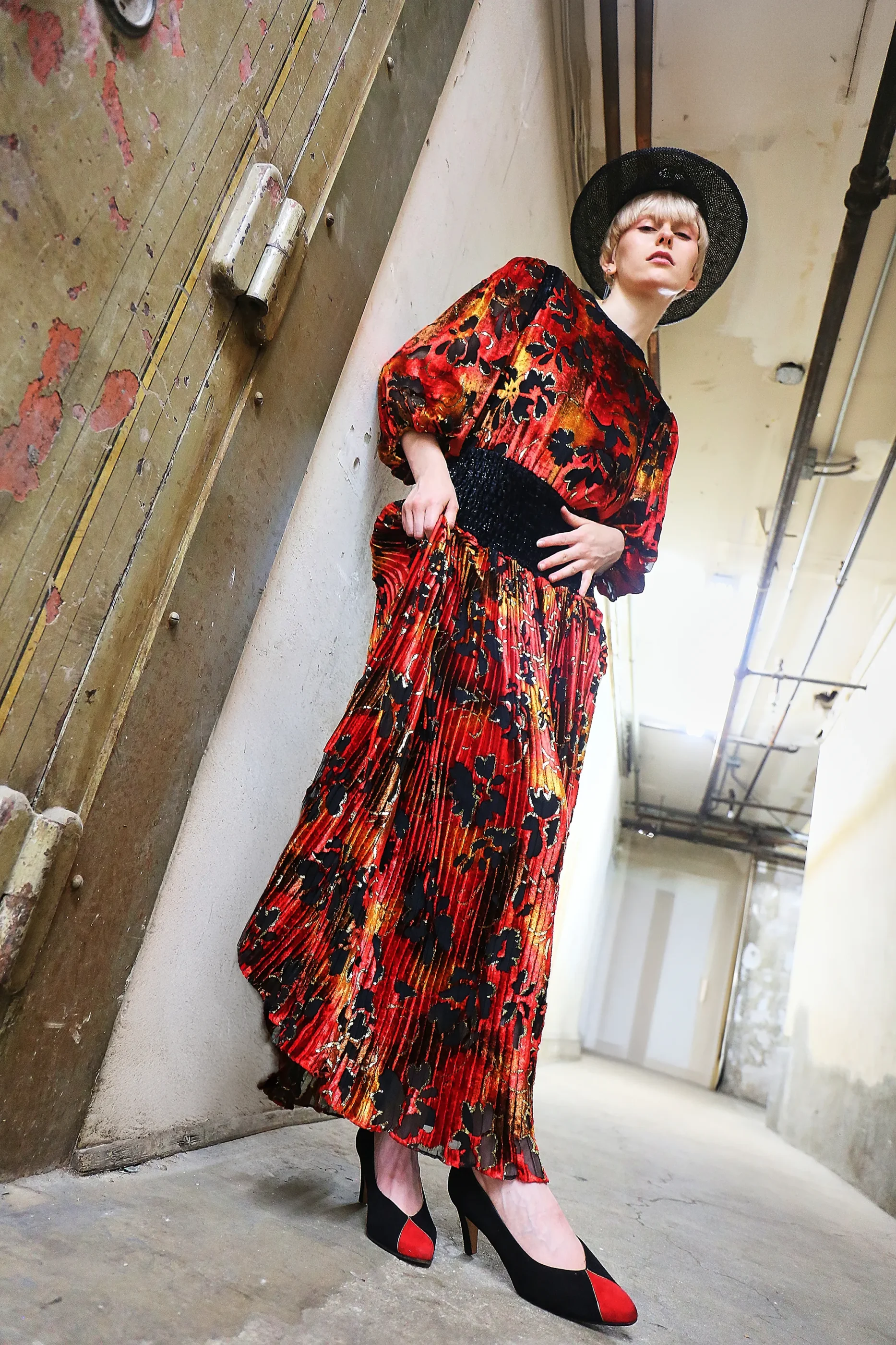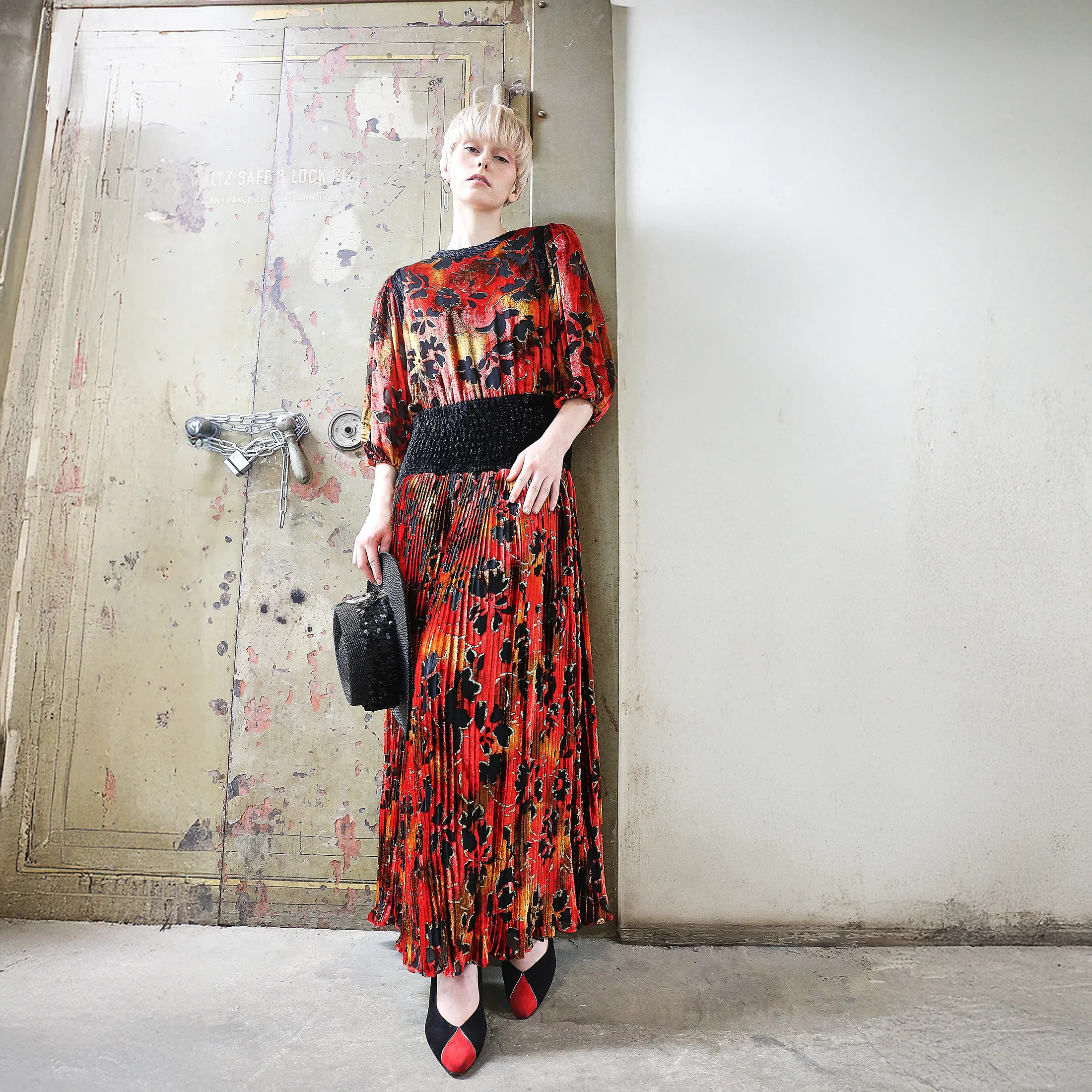 An opulent 1980s Diane Fres crushed velvet dress, featuring a painterly floral pattern in black, crimson, and marigold tones. Metallic gold lamé thread adds subtle dimension and movement to the pleated fabric. Known for her glamorous yet wearable silhouettes, Diane Fres designed for the woman who collected beauty as much as she wore it.