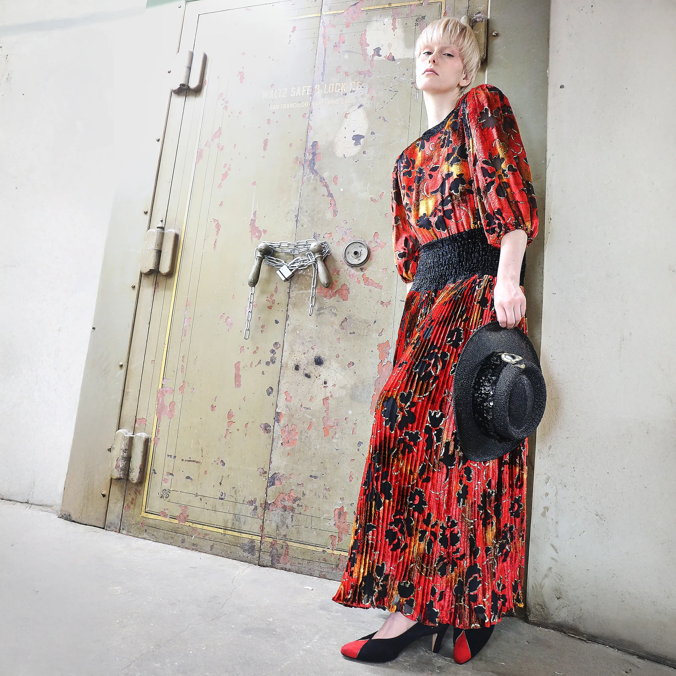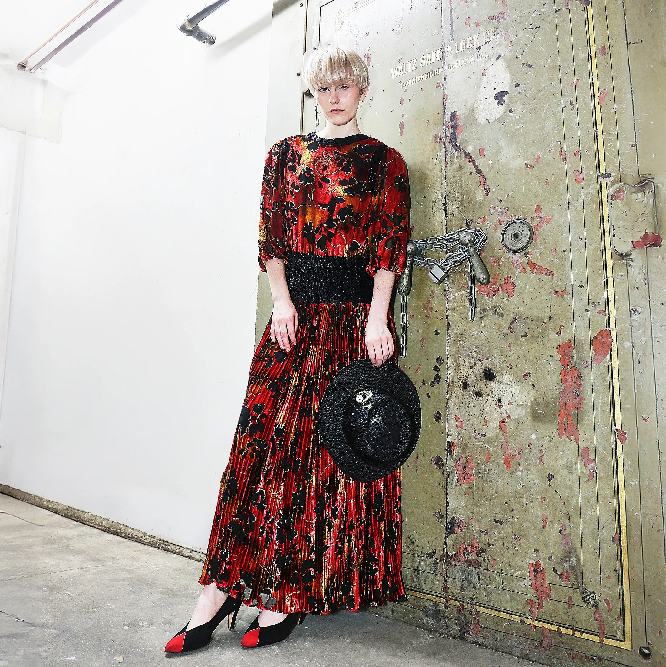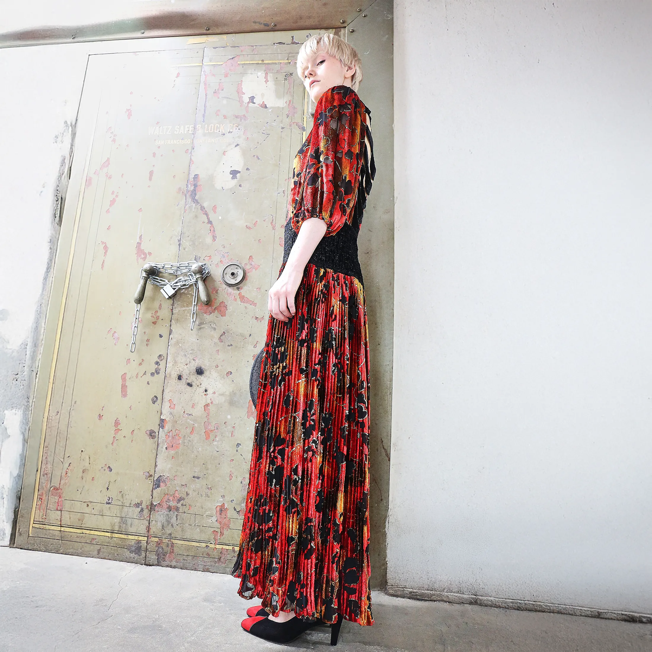 An opulent 1980s Diane Fres crushed velvet dress, featuring a painterly floral pattern in black, crimson, and marigold tones. Metallic gold lamé thread adds subtle dimension and movement to the pleated fabric. Known for her glamorous yet wearable silhouettes, Diane Fres designed for the woman who collected beauty as much as she wore it.