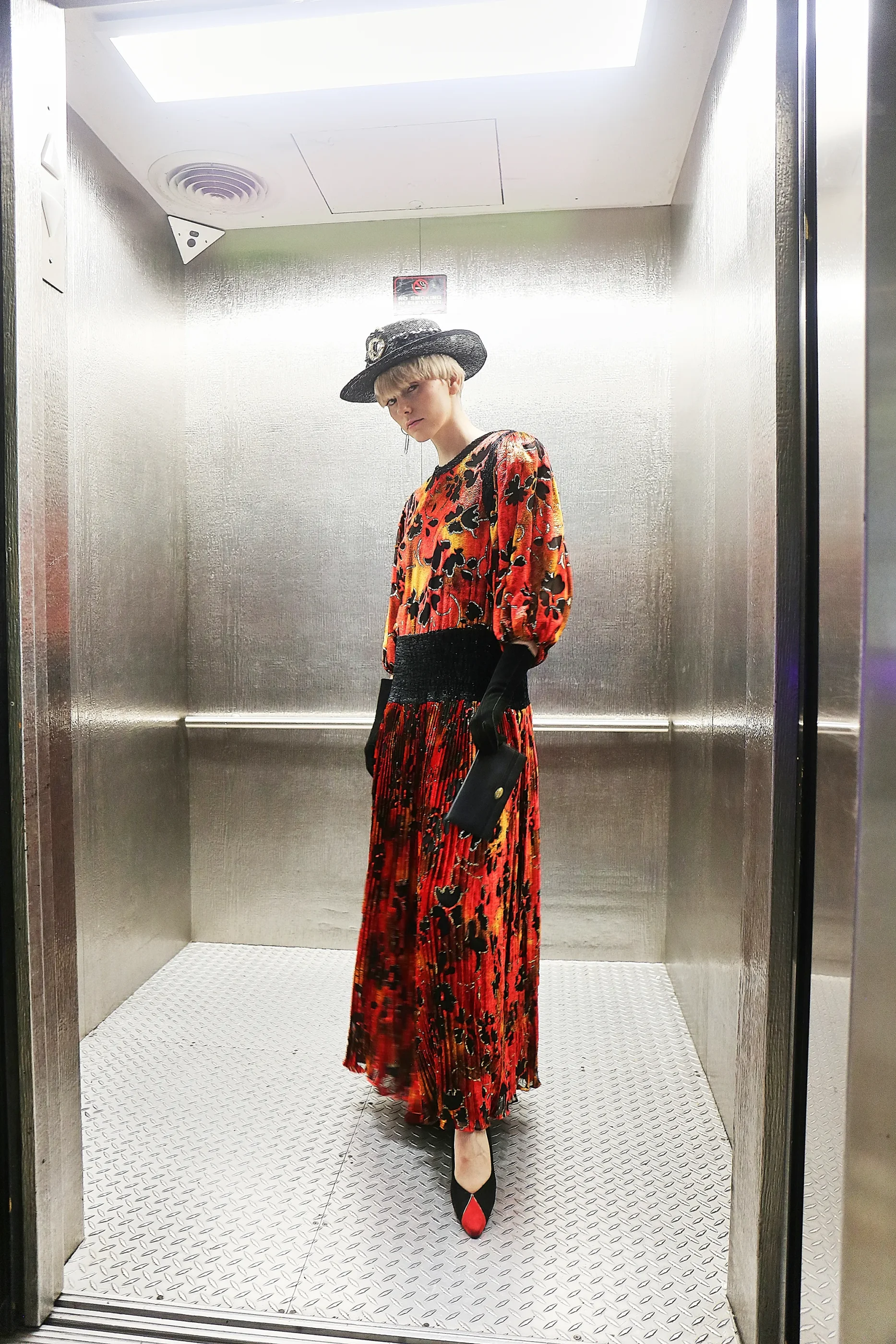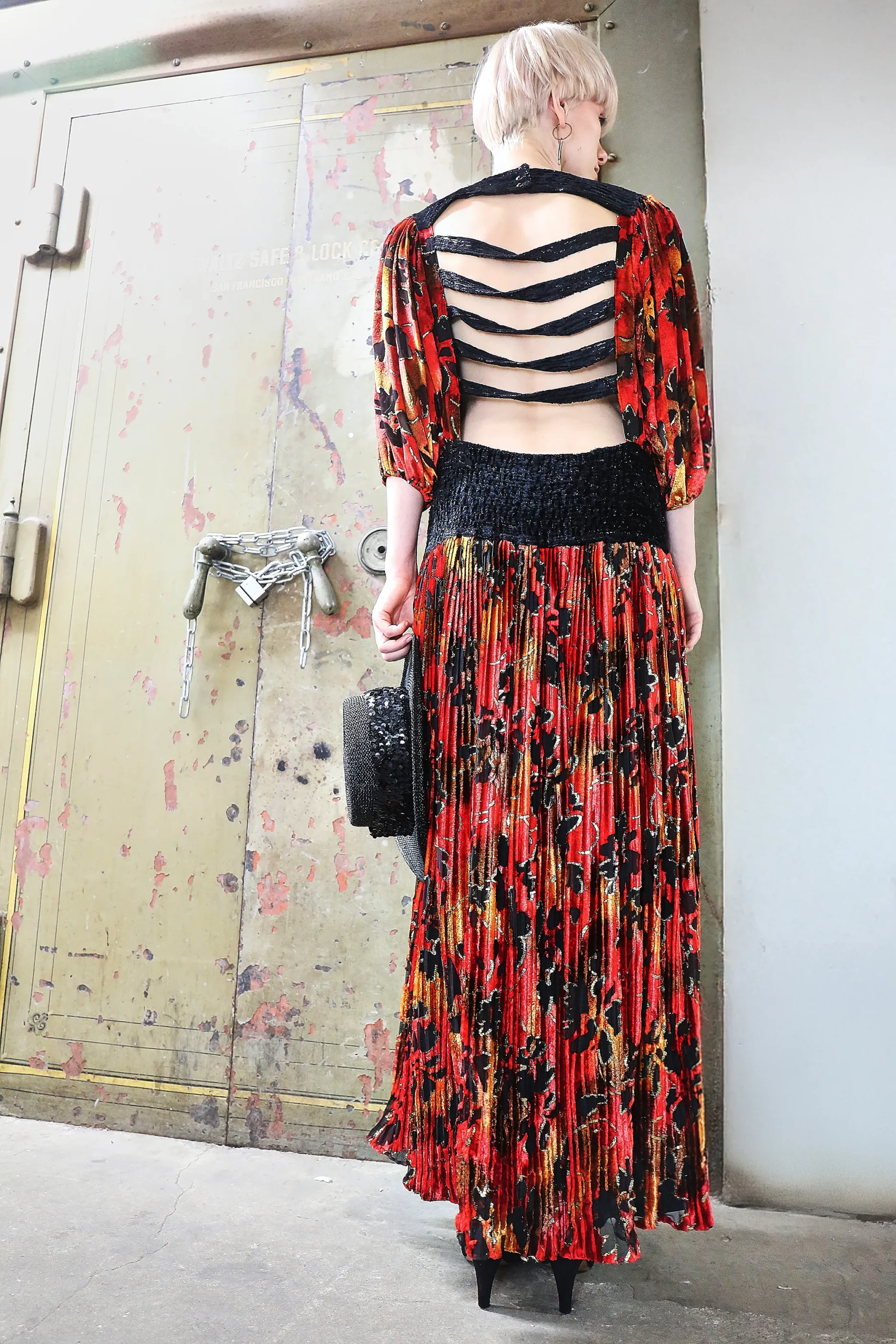 This particular piece exemplifies her signature approach—melding bohemian sensuality with bold, architectural design. The rear cutout with strappy detailing contrasts against the softly structured bishop sleeves and sharply pleated skirt, creating an interplay of texture and silhouette that defines Fres’s best work.