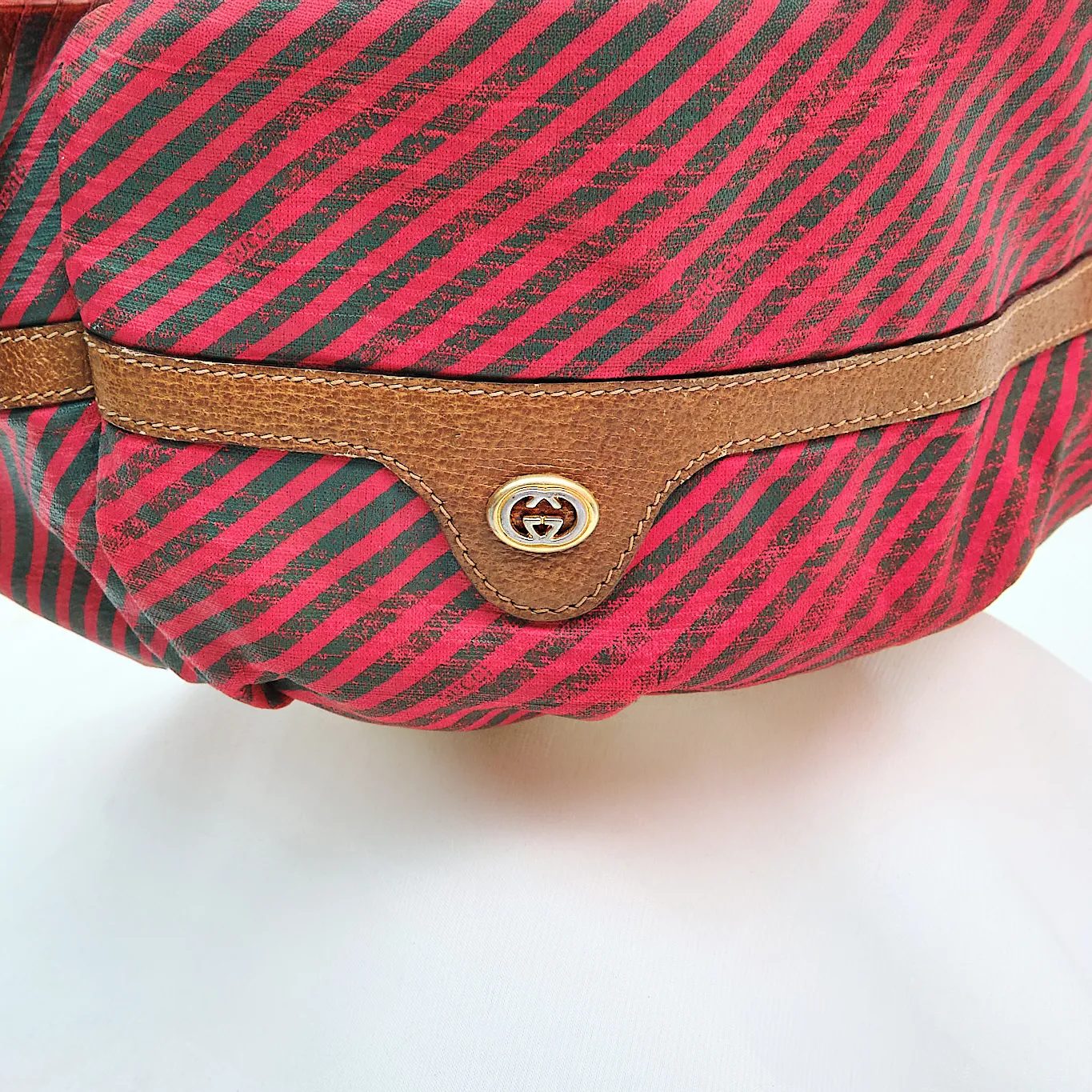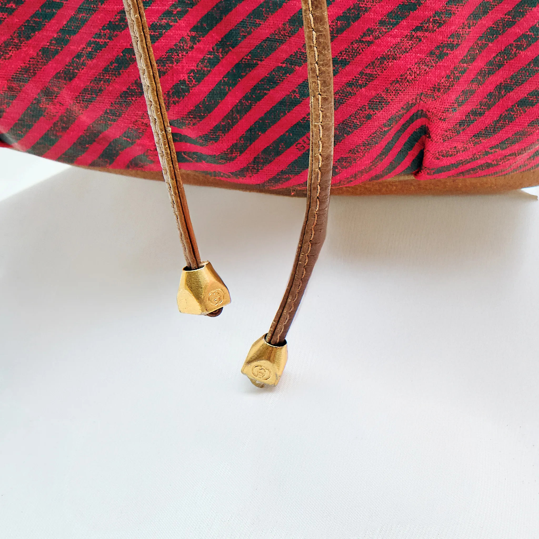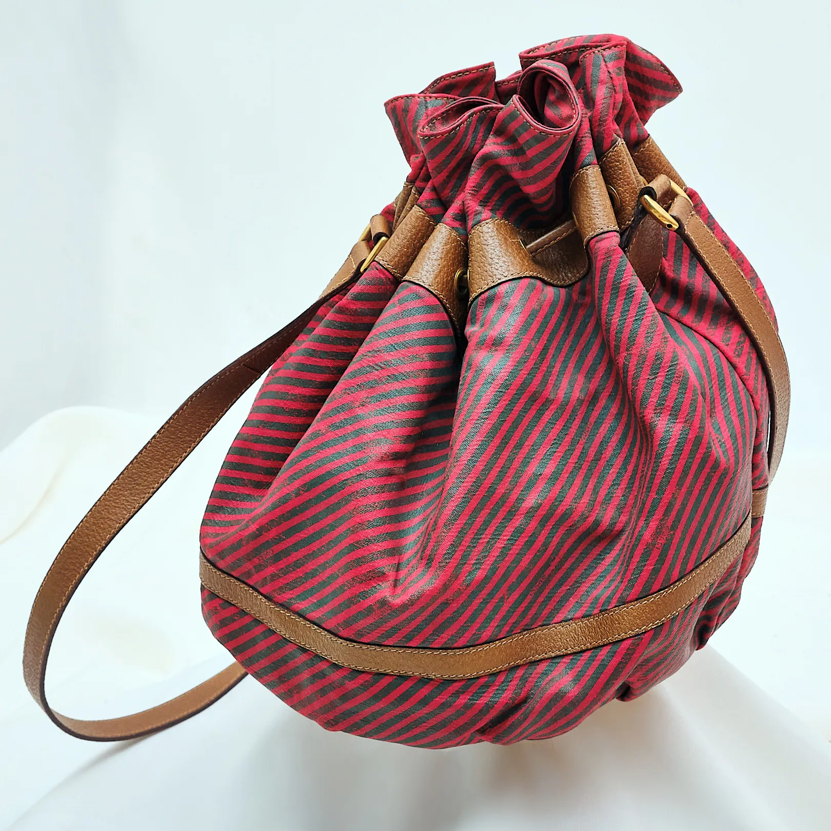 This vintage Gucci bucket bag is a bold and collectible piece from the iconic Italian fashion house. Crafted in a striking red and green diagonal stripe canvas with supple tan leather trim, this bag embodies the effortless chic that Gucci is known for.