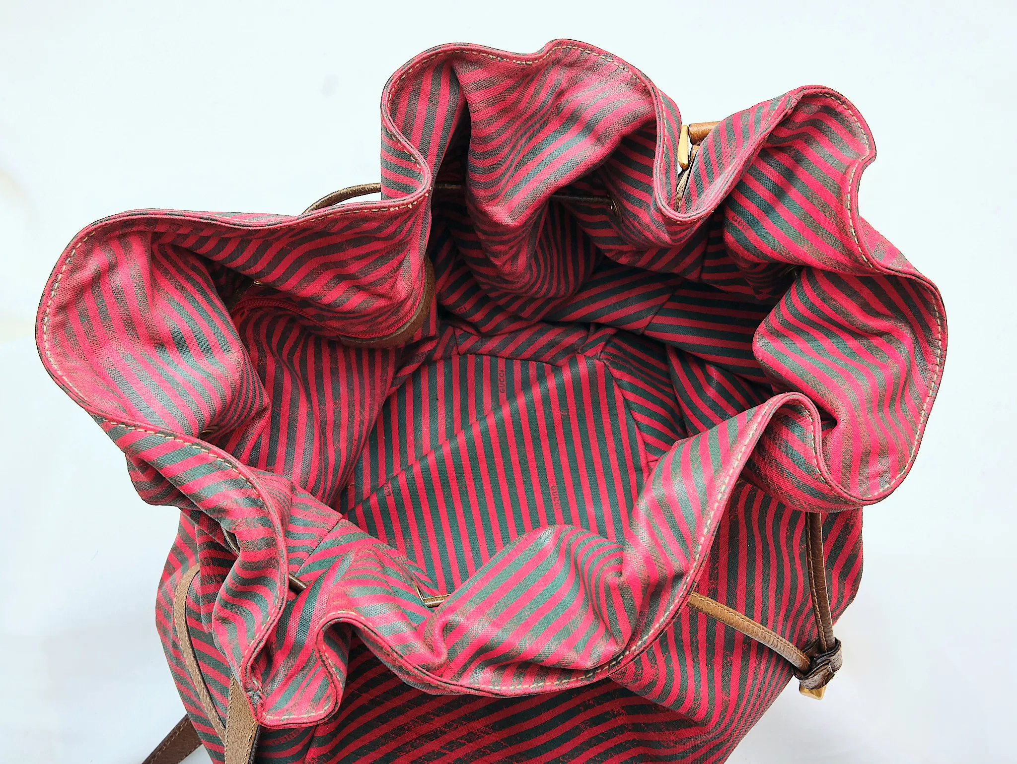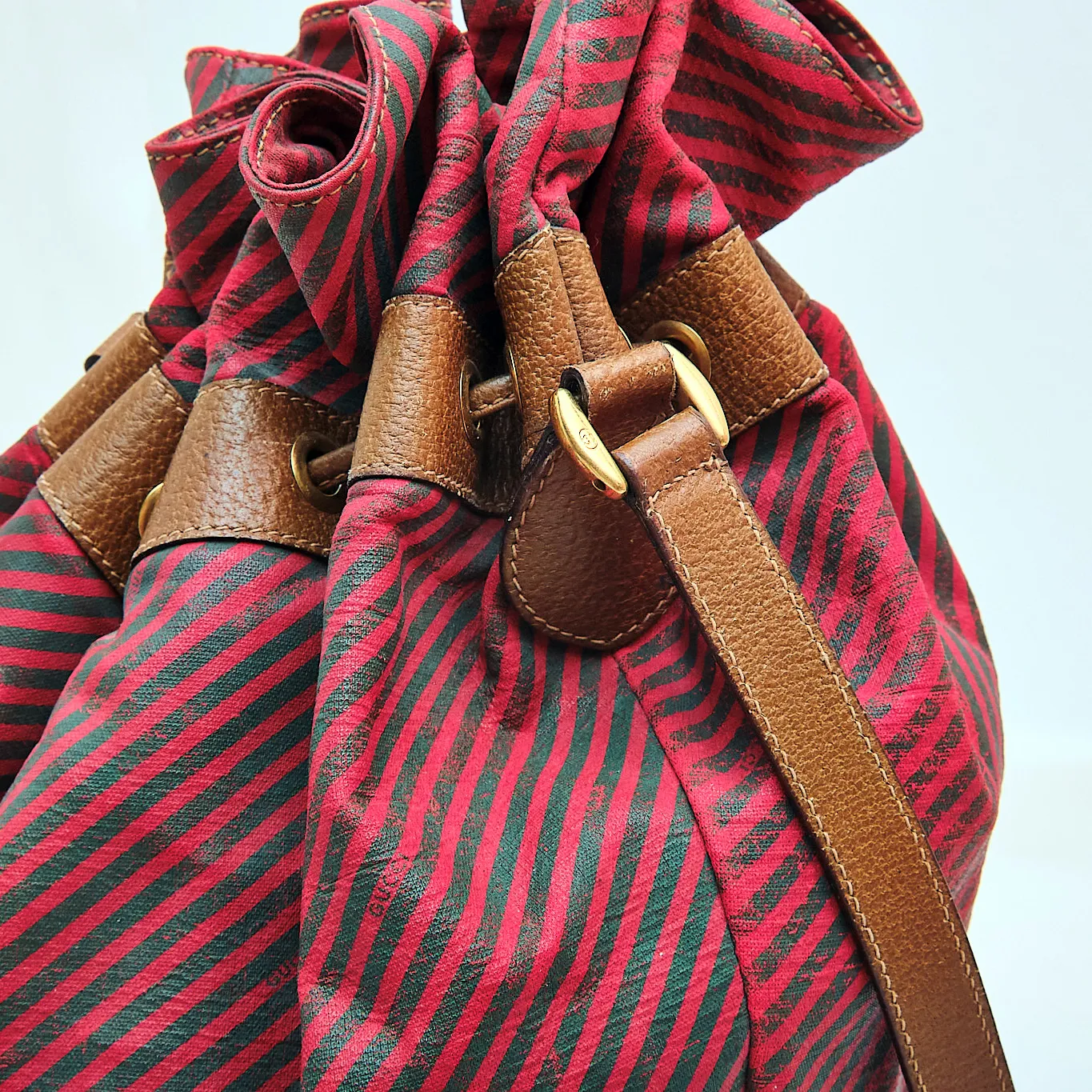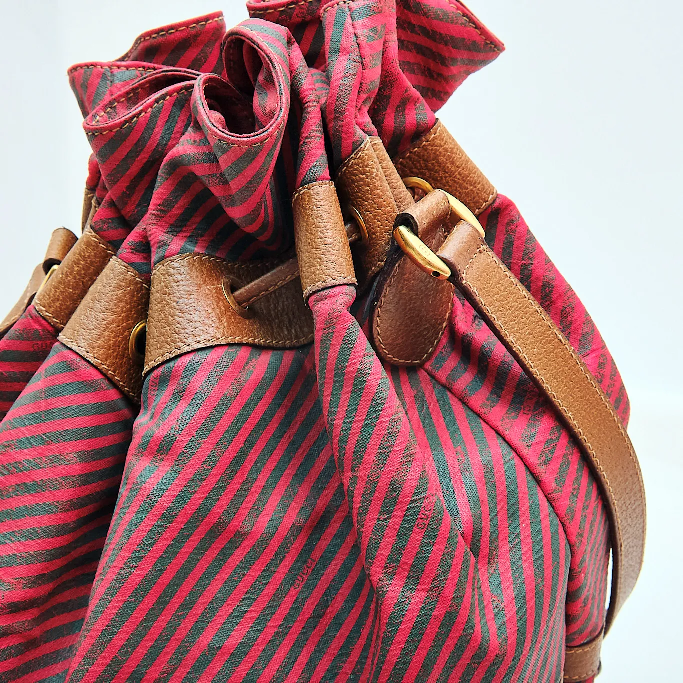 1980s Gucci Red & Green Striped Bucket Bag with Leather Trim