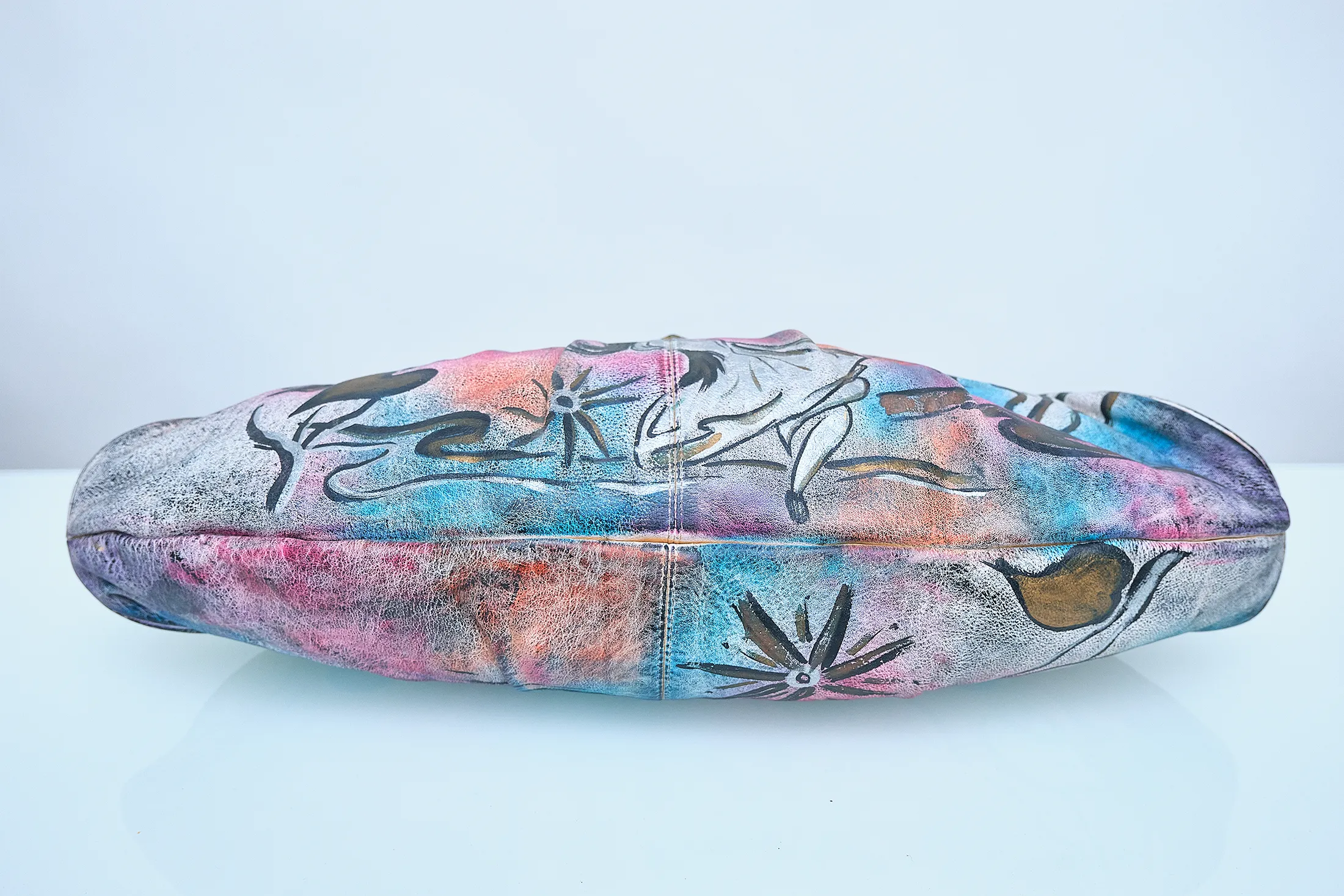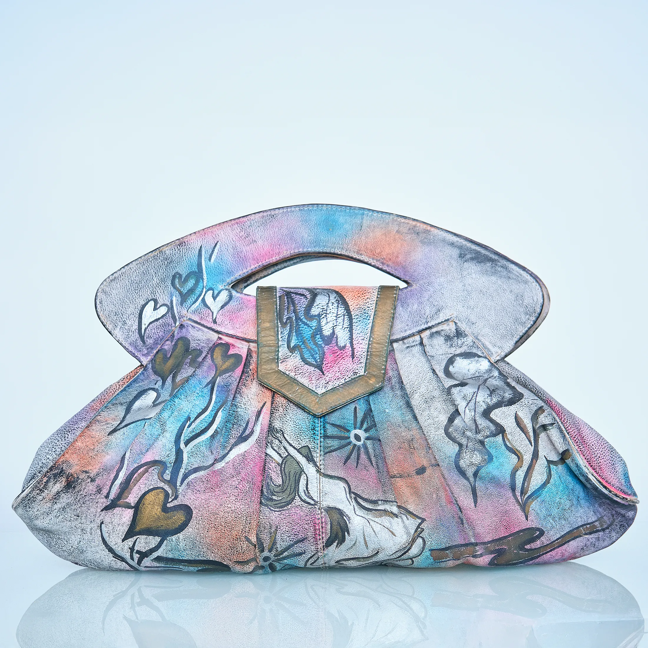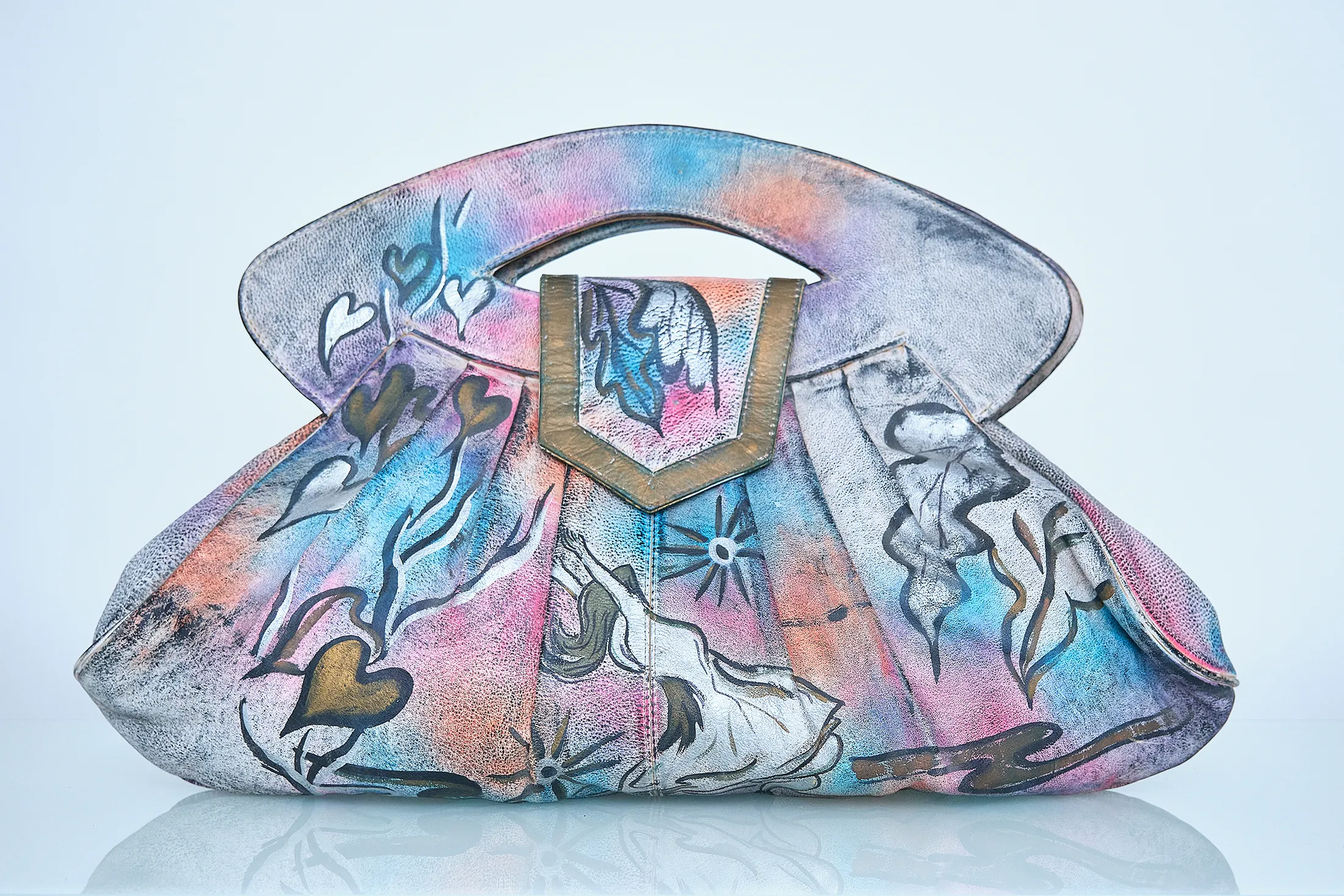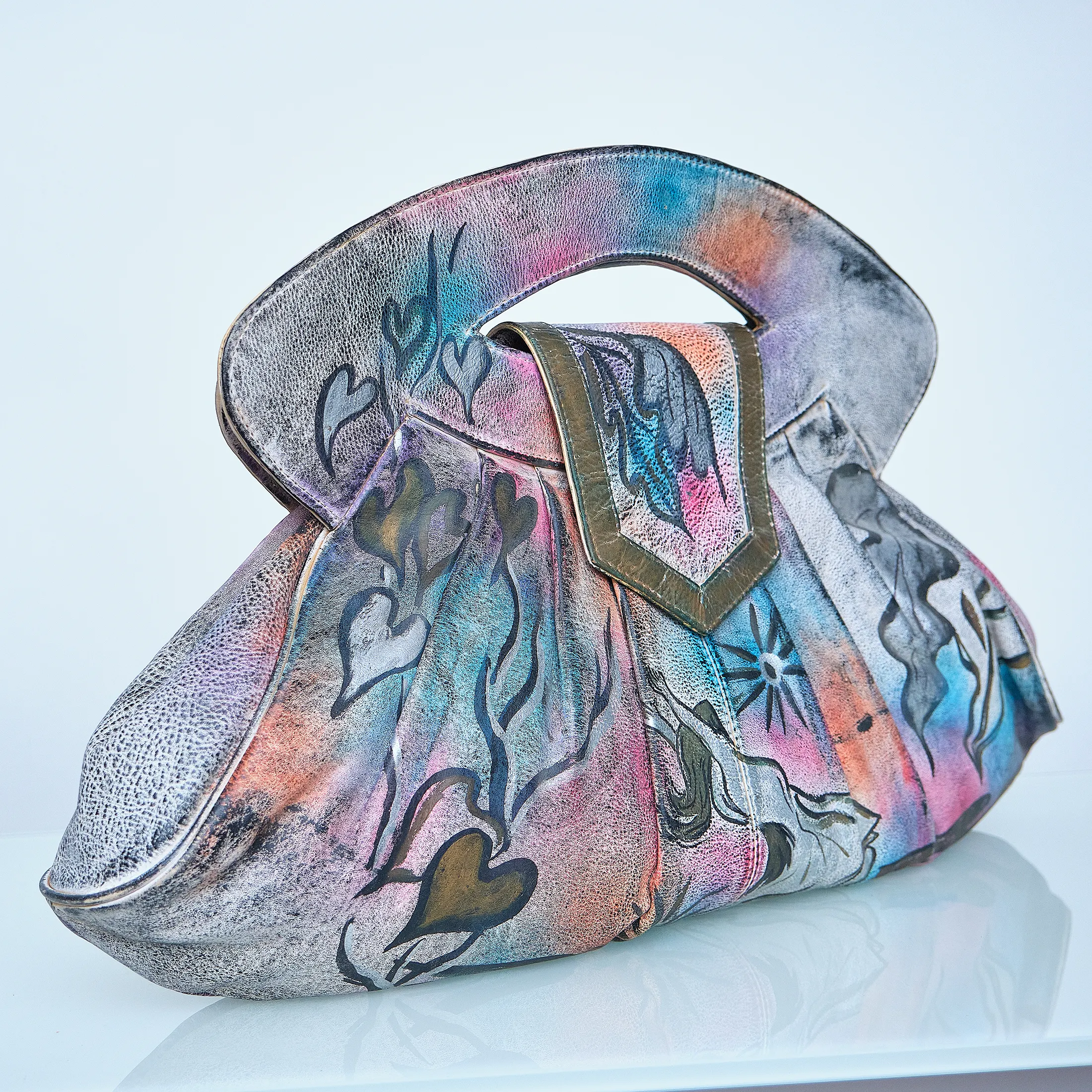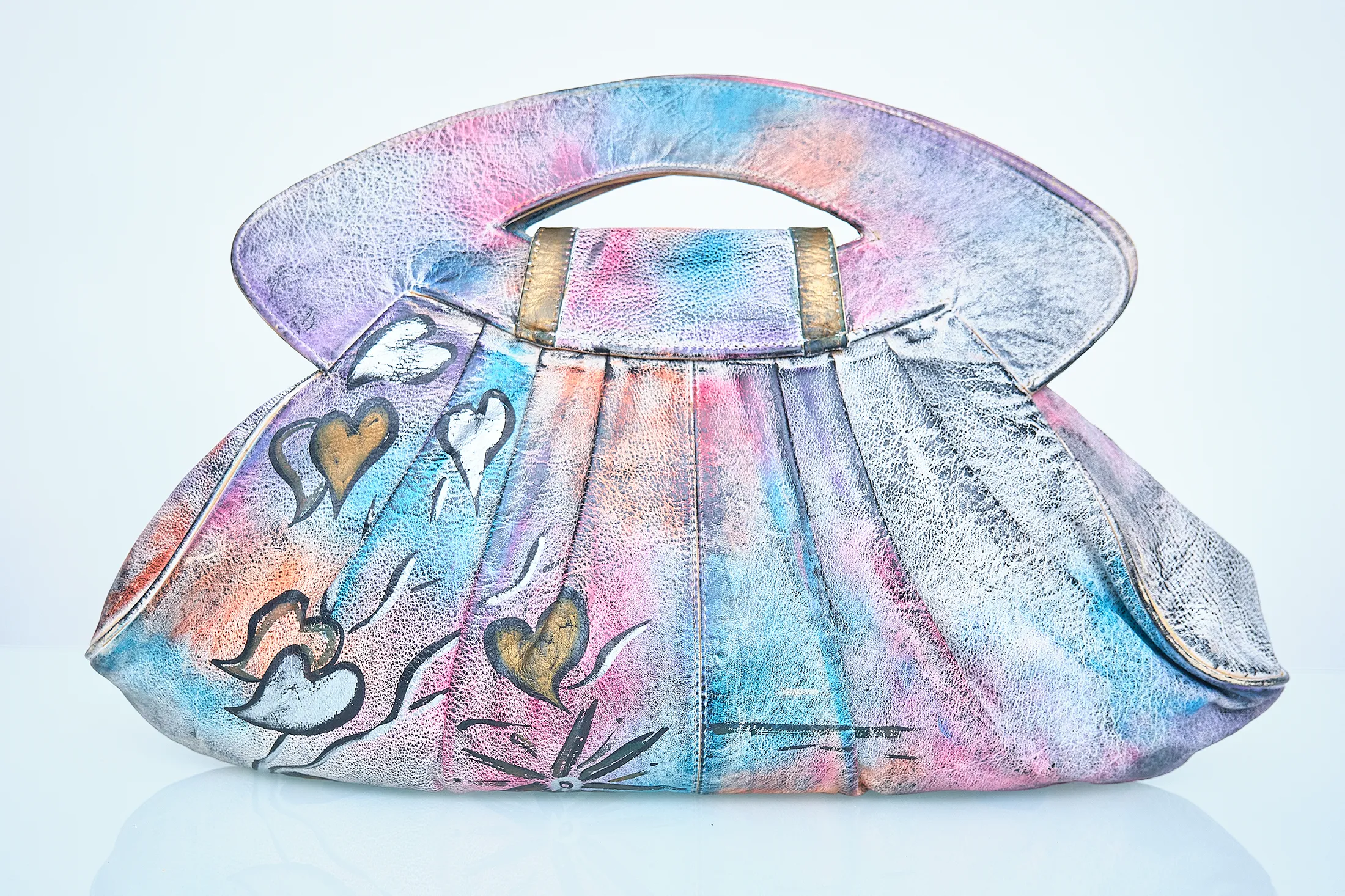 This rare 1980s Sova leather bag is a sculptural statement piece, crafted in a unique pillow silhouette with bold, angular cut-out handles. The bag is handpainted in an expressive, multicolored abstract motif featuring hearts, florals, and cosmic-inspired accents in shades of pastel pink, turquoise, lavender, gold, and black. Each bag in this line was uniquely hand-finished, making no two exactly alike.