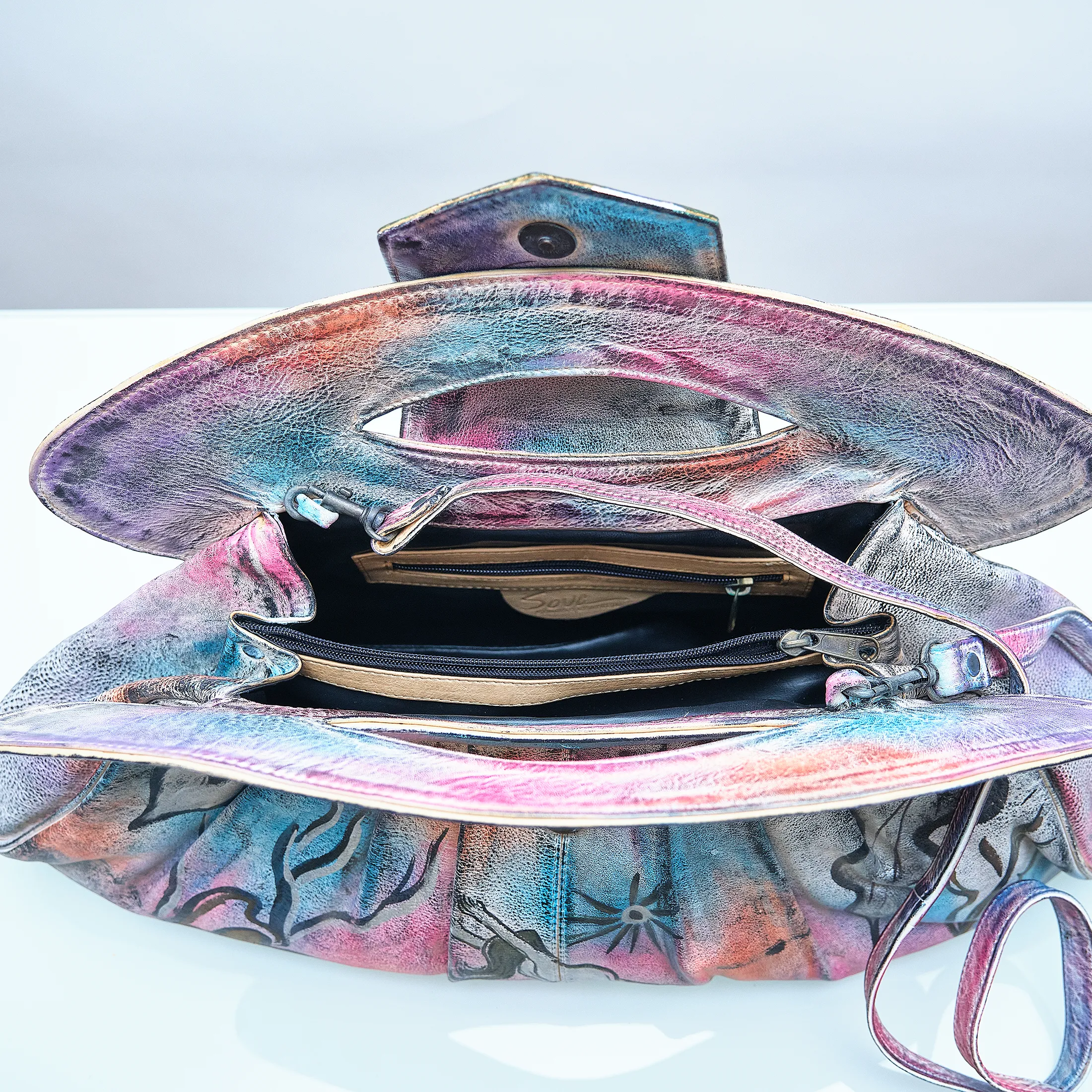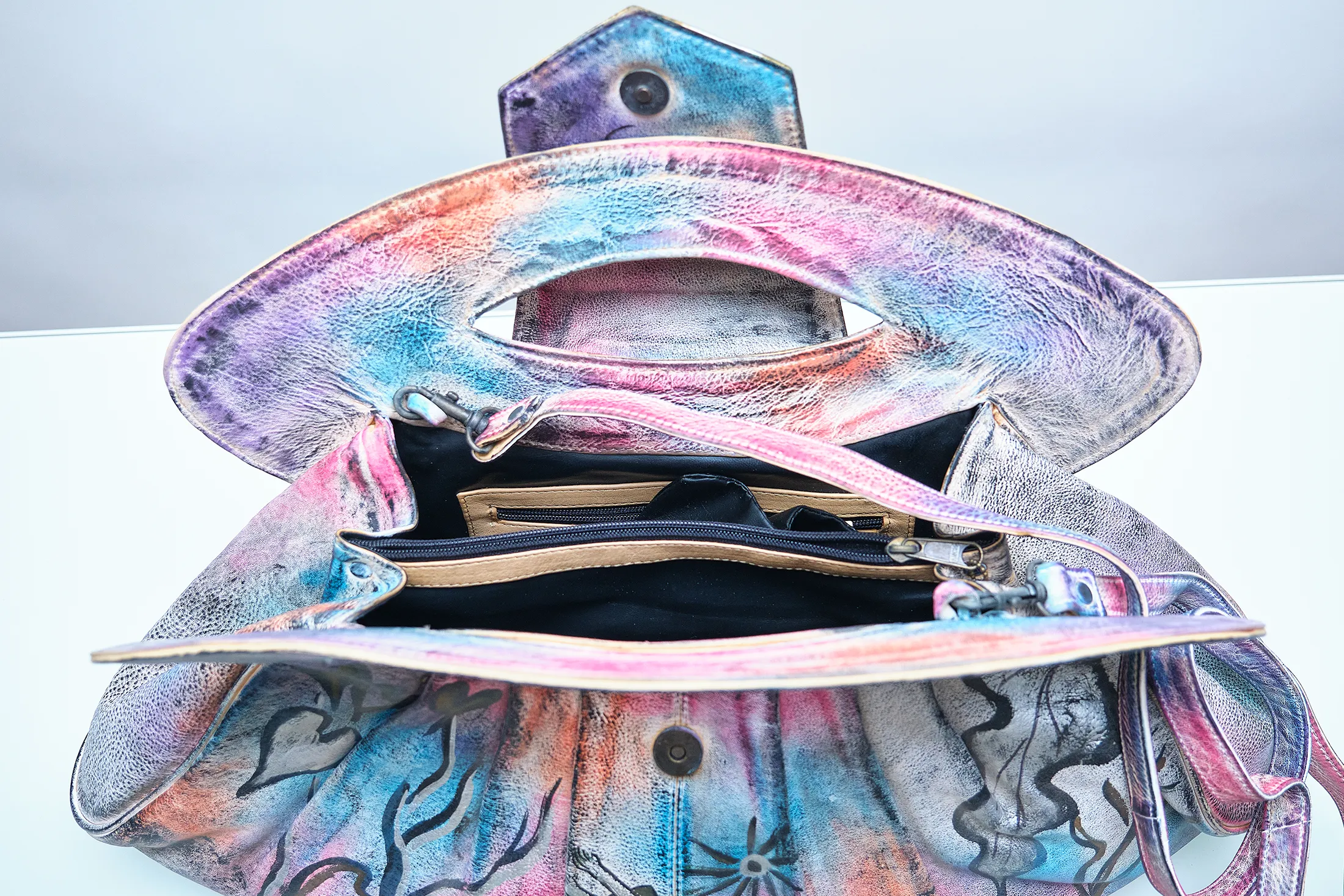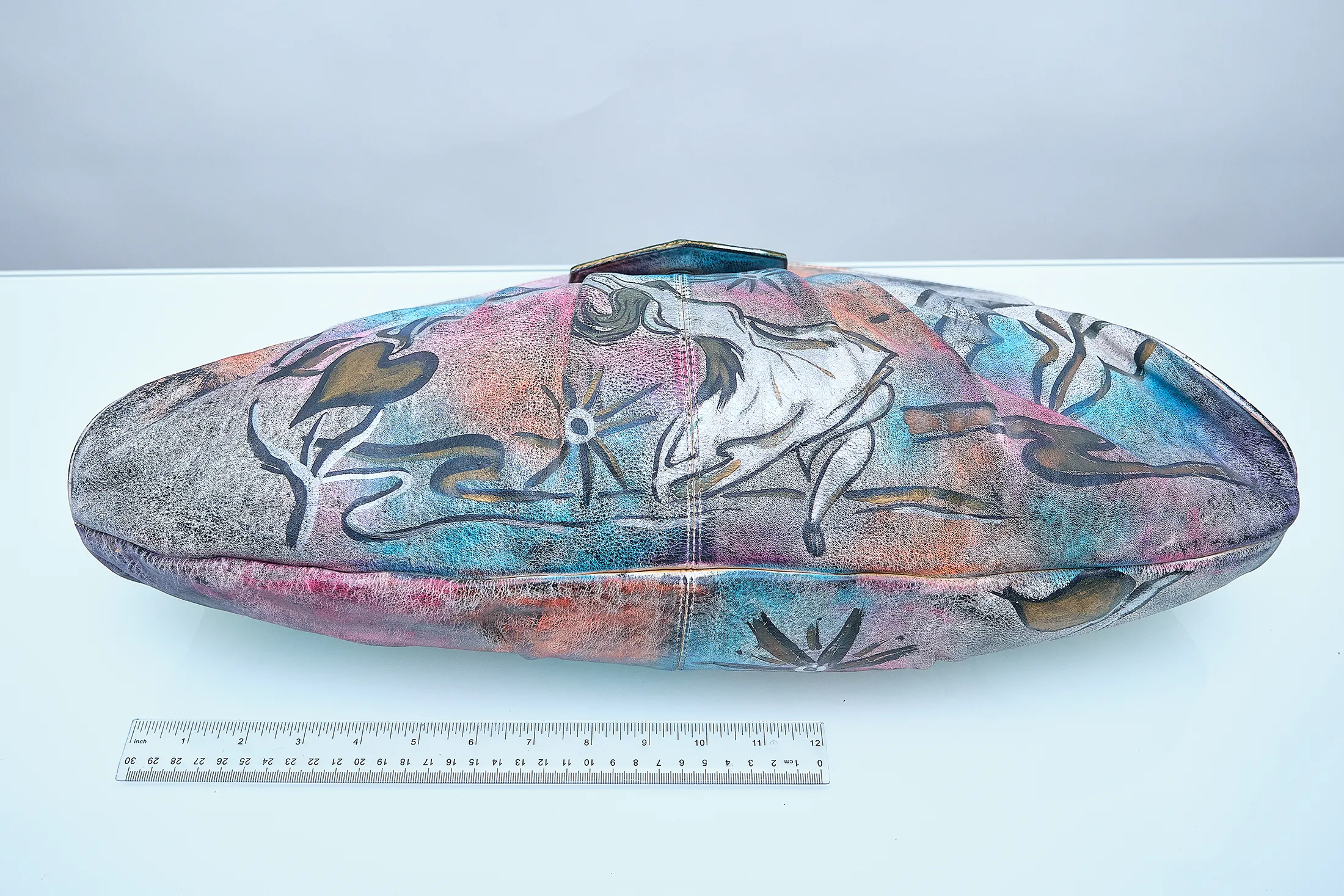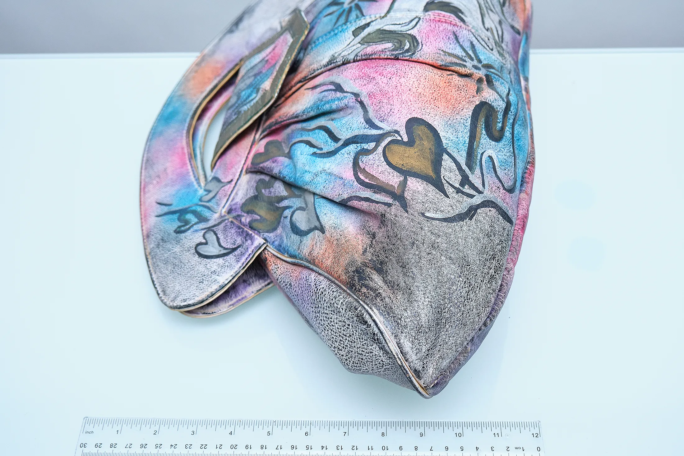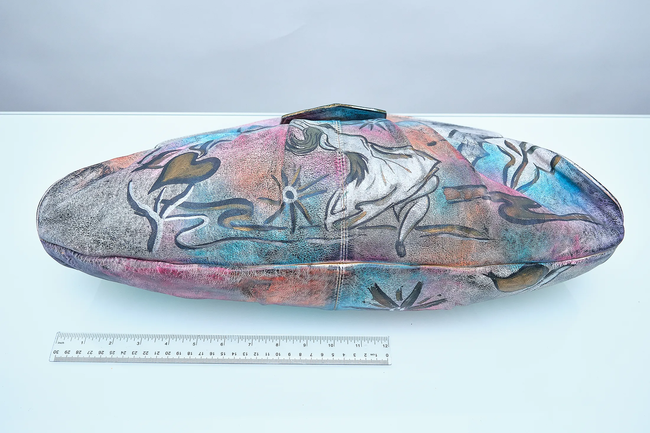 This rare 1980s Sova leather bag is a sculptural statement piece, crafted in a unique pillow silhouette with bold, angular cut-out handles. The bag is handpainted in an expressive, multicolored abstract motif featuring hearts, florals, and cosmic-inspired accents in shades of pastel pink, turquoise, lavender, gold, and black. Each bag in this line was uniquely hand-finished, making no two exactly alike.