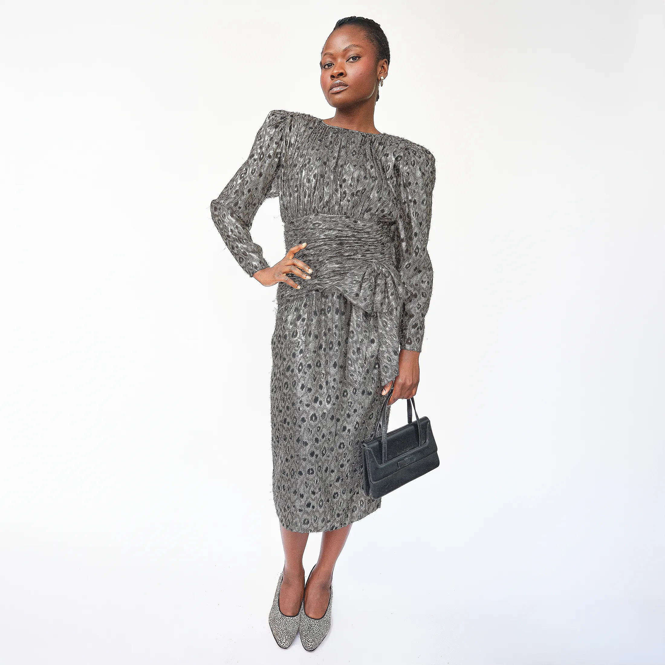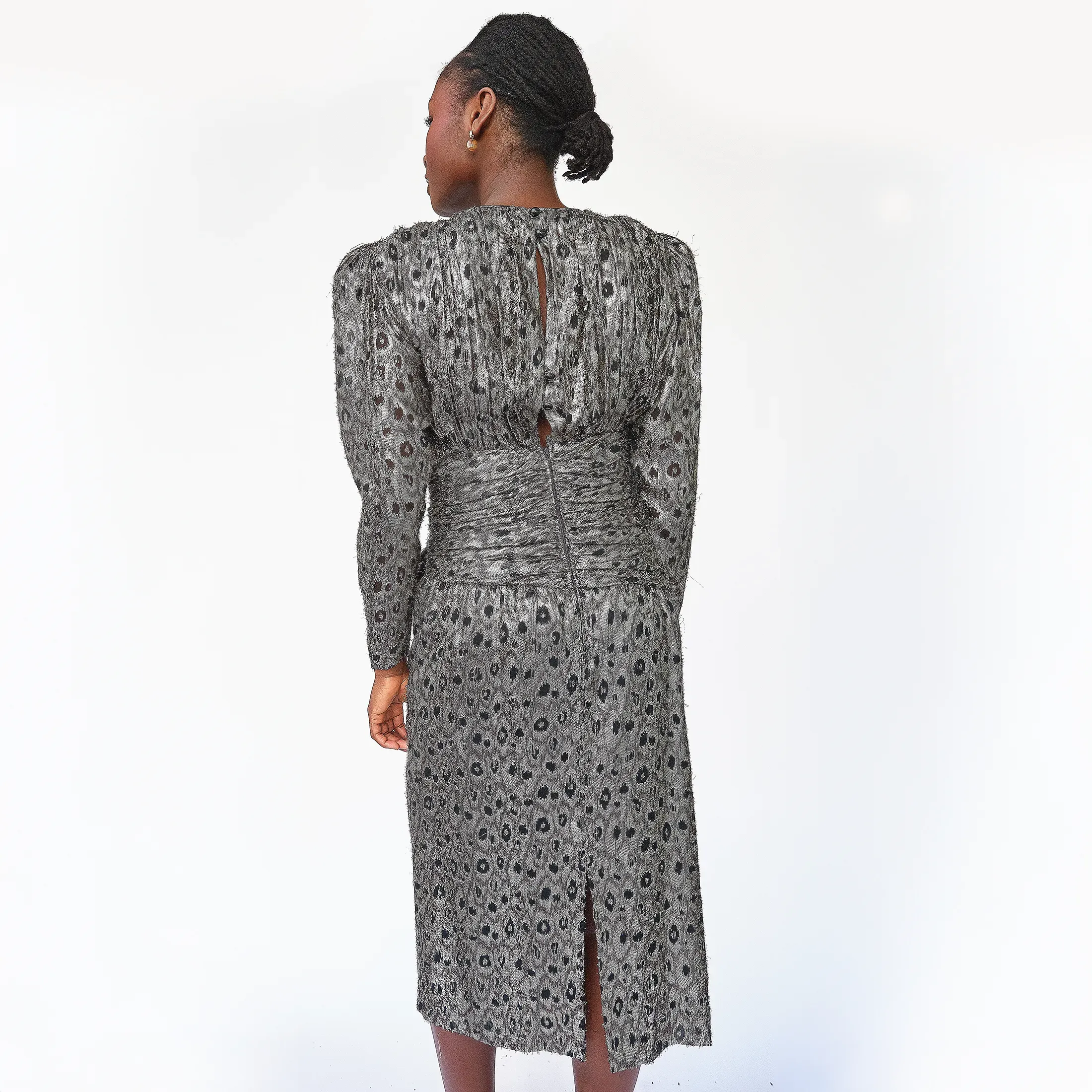 Strong shoulder pads define the silhouette, while a sculptural hip bow and slim midi hem add visual structure. The silver leopard jacquard shimmers with a holographic sheen, catching the light at every turn. Fully lined. Zip back with hook-eye closures and delicate keyhole accents. No tag size present, but fits like a modern size 2.