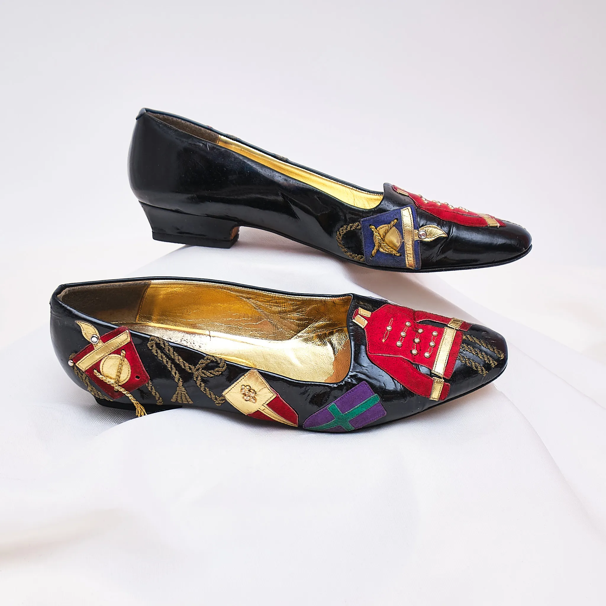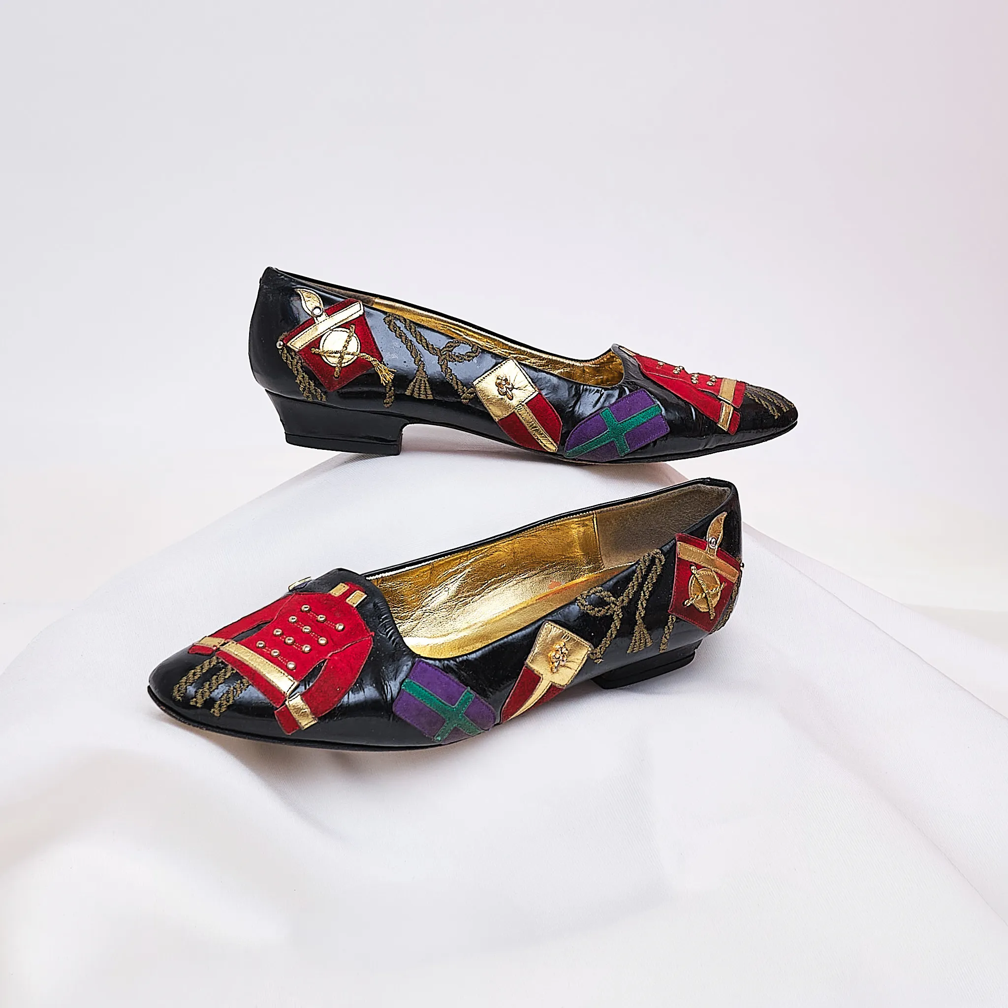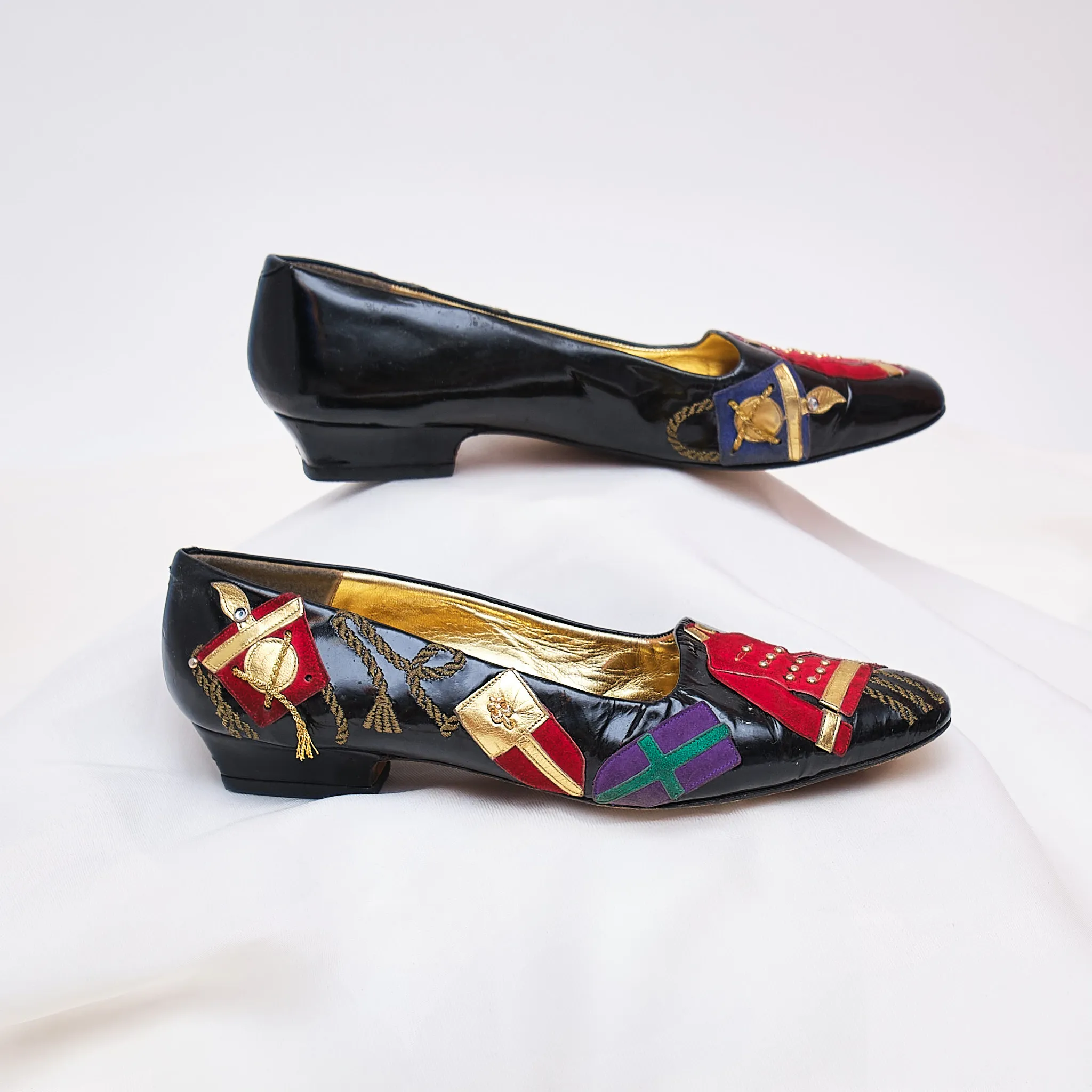 Step into vintage prestige with these rare 1980s Margaret Jerrold novelty flats, crafted in glossy black patent leather with bold suede crest appliqués in red, gold, purple, and green. Regal shield motifs and embroidered rope detailing capture the era’s playful yet elevated design aesthetic, making these shoes a collector’s piece and a statement addition to any wardrobe.
