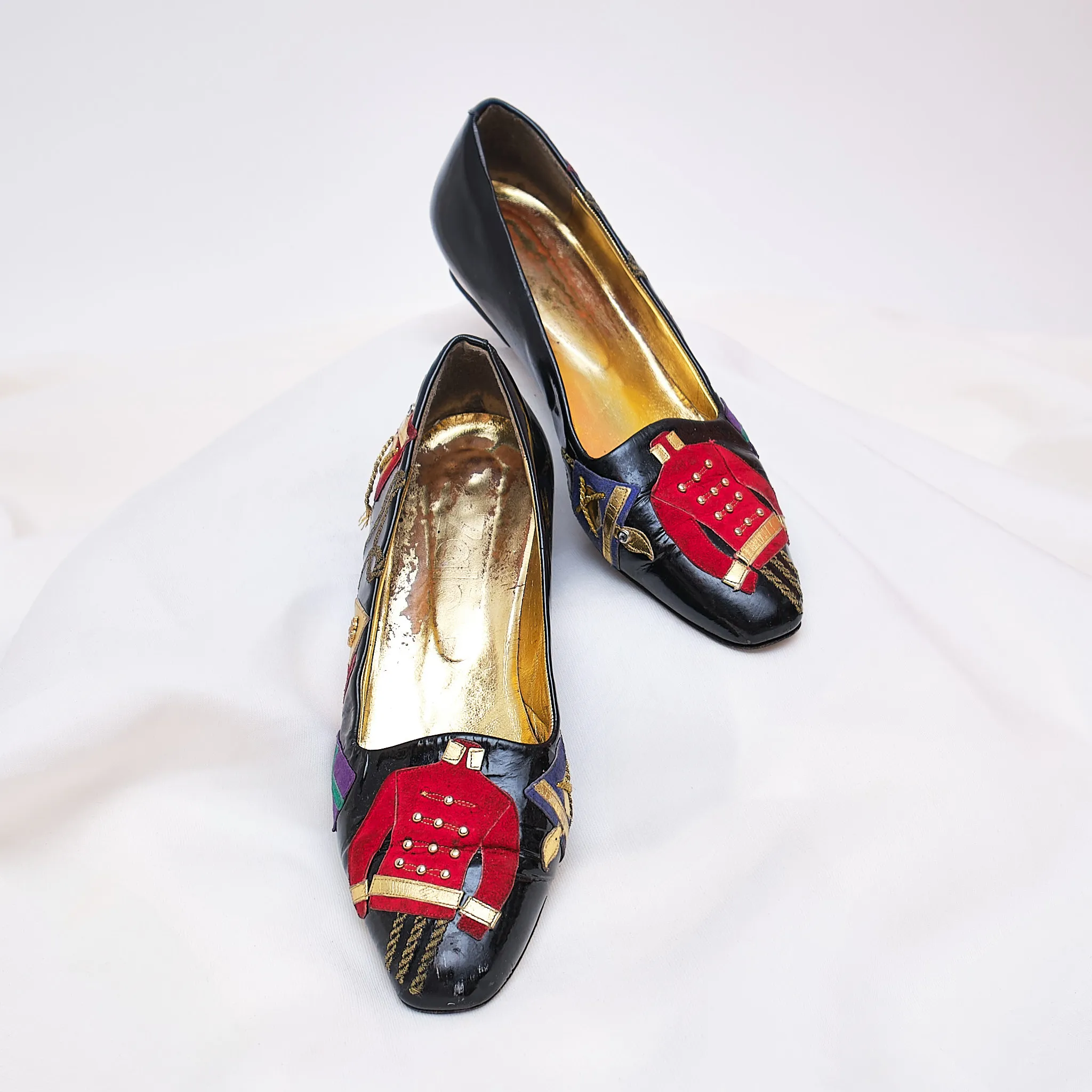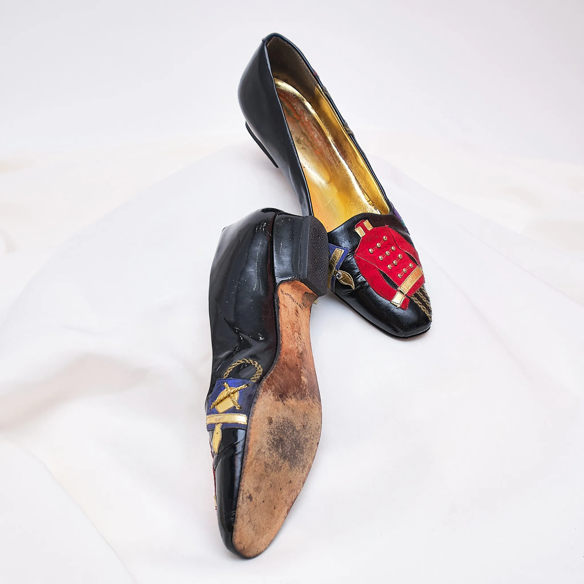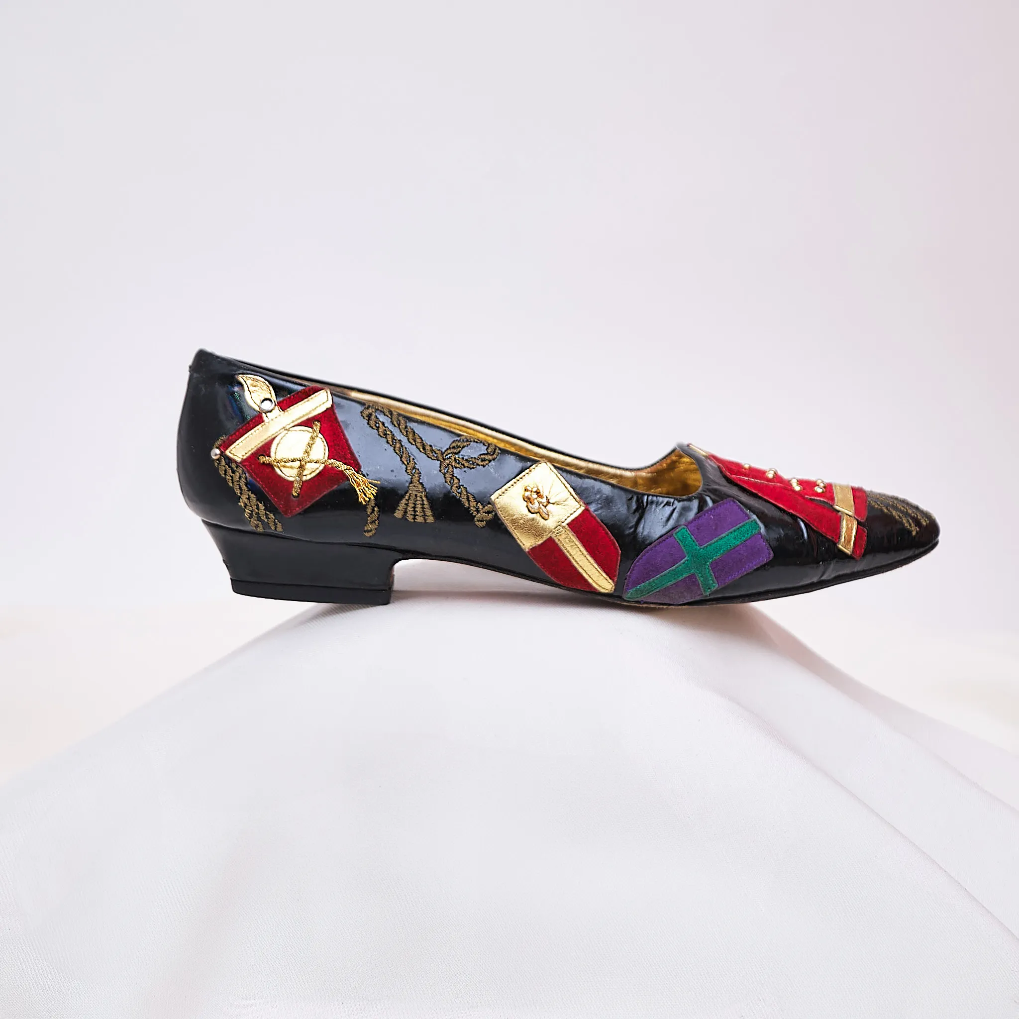 Step into vintage prestige with these rare 1980s Margaret Jerrold novelty flats, crafted in glossy black patent leather with bold suede crest appliqués in red, gold, purple, and green. Regal shield motifs and embroidered rope detailing capture the era’s playful yet elevated design aesthetic, making these shoes a collector’s piece and a statement addition to any wardrobe.