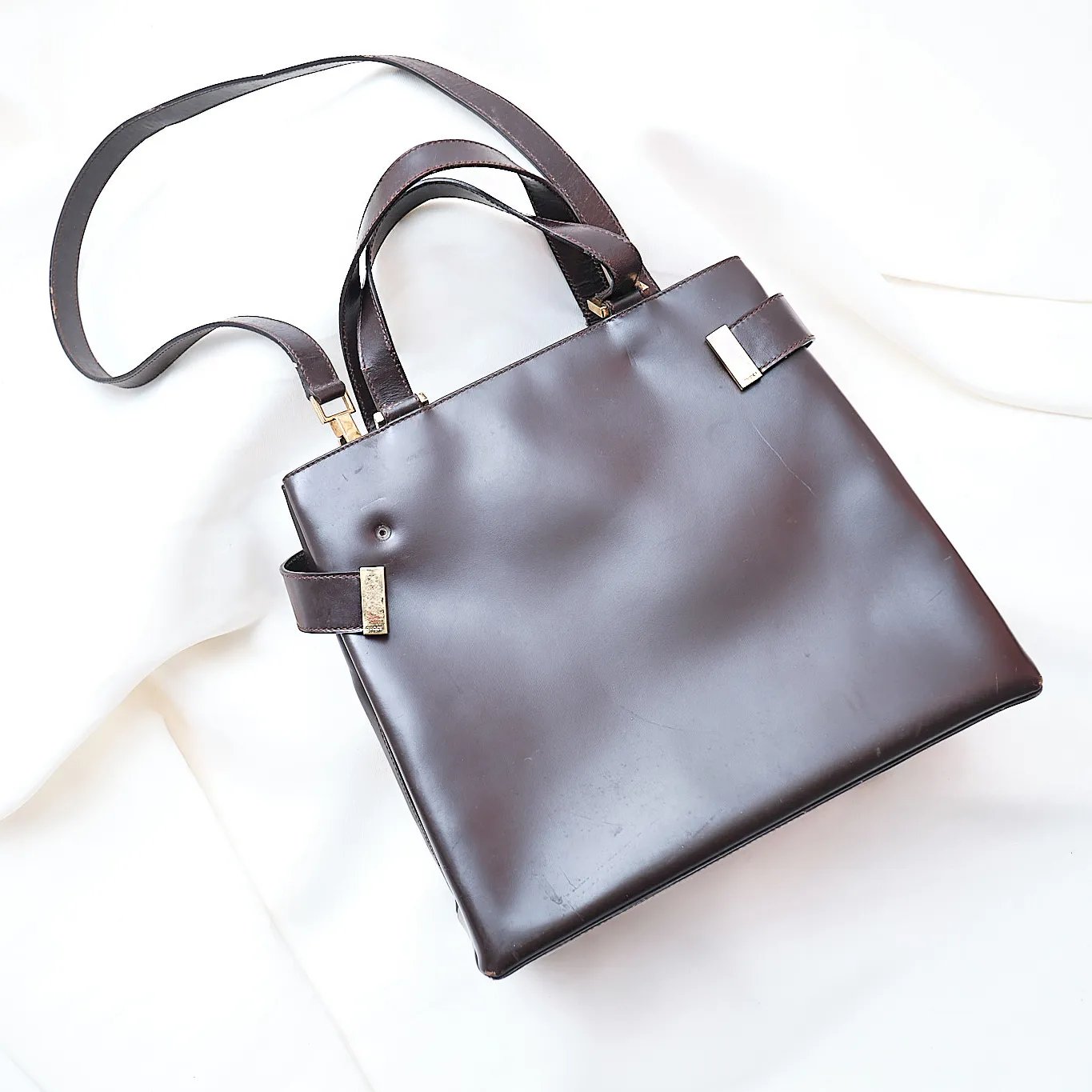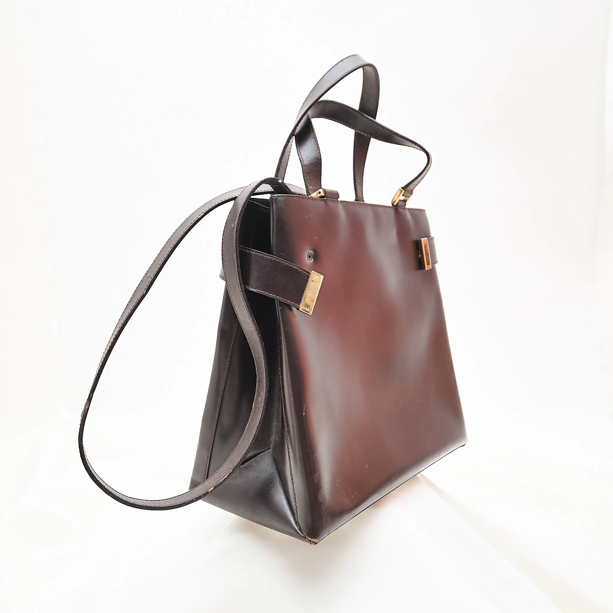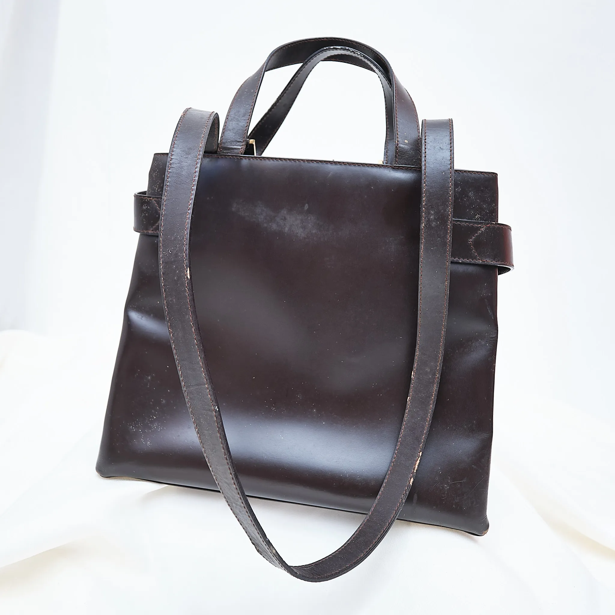 Condition: Fair vintage condition. The leather shows creasing, scratches, and needs cleaning/restoration. Fully usable as-is but best suited for someone who appreciates a well-loved designer piece with potential for a refresh.
