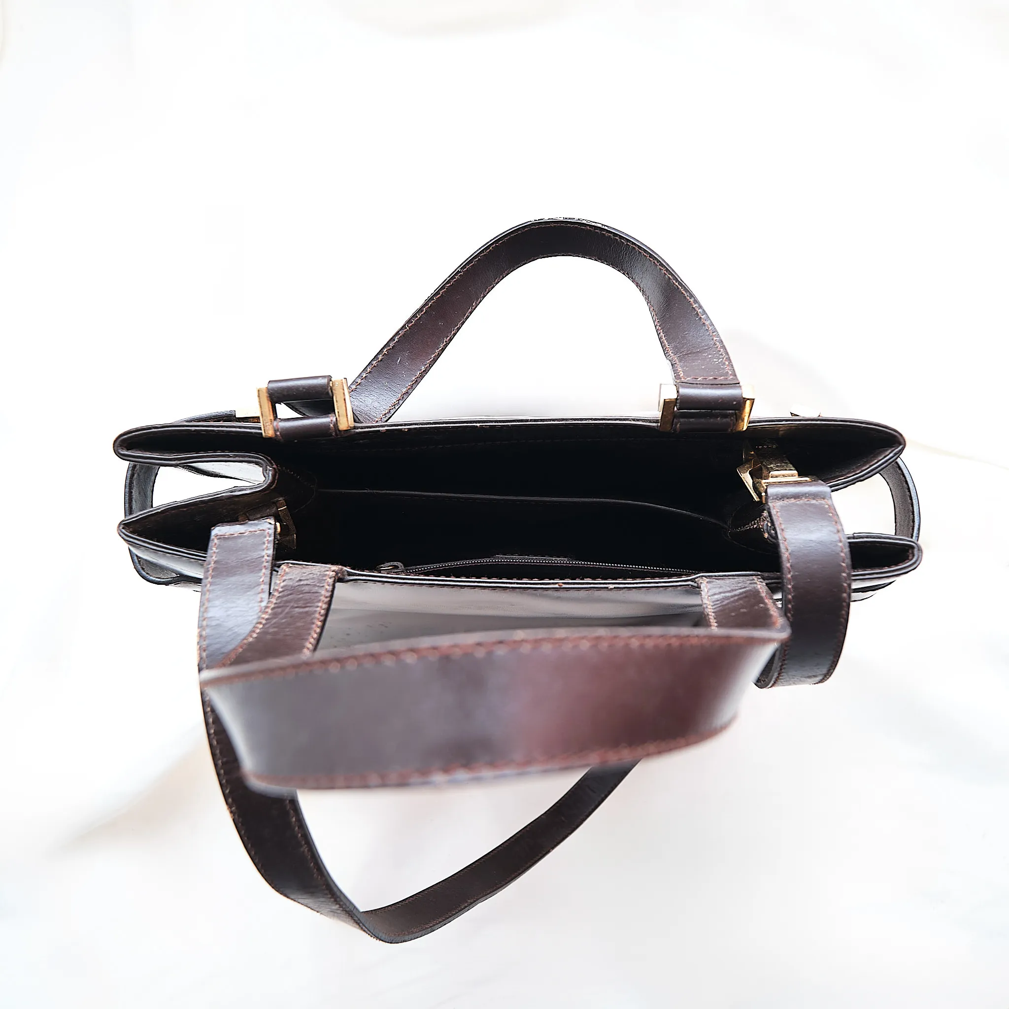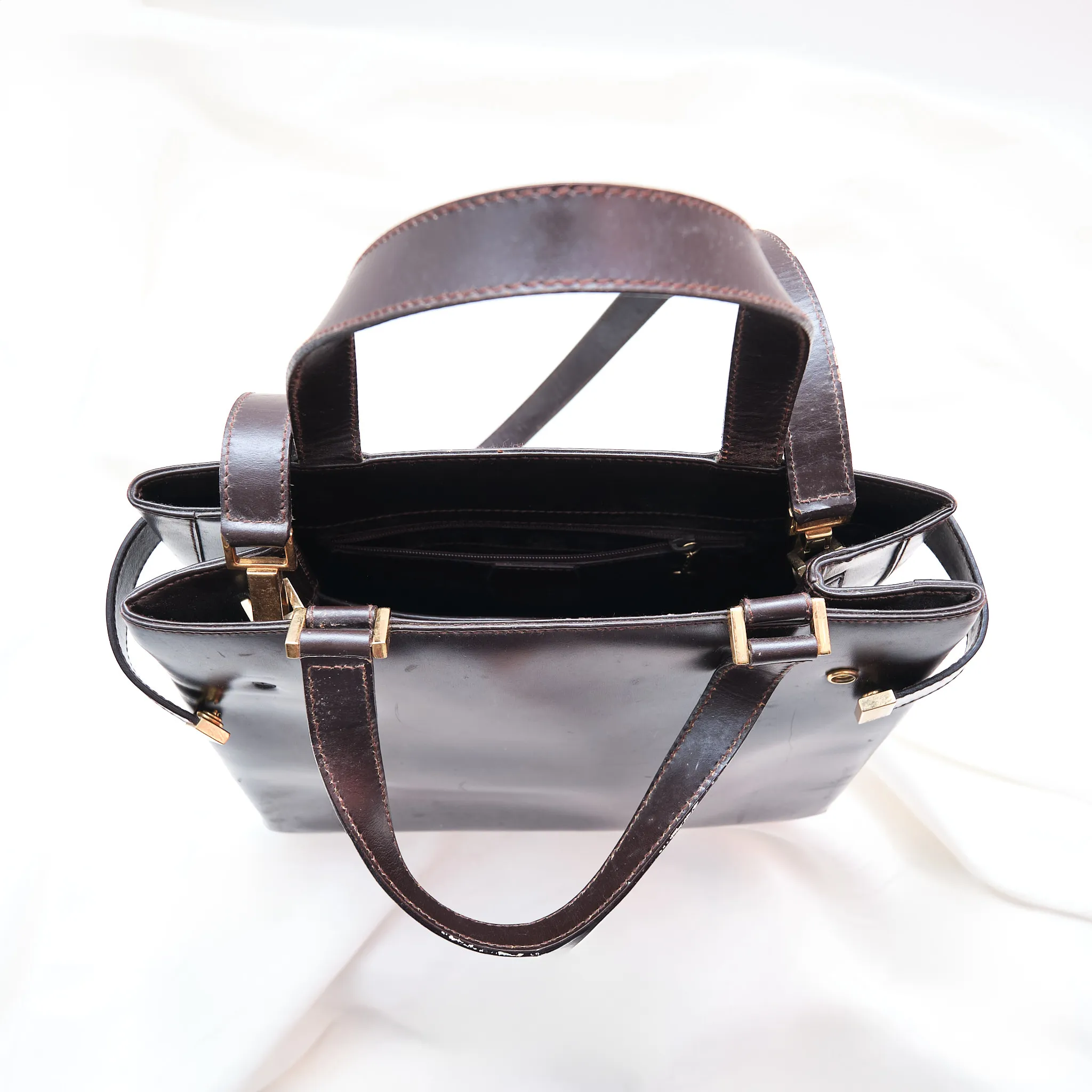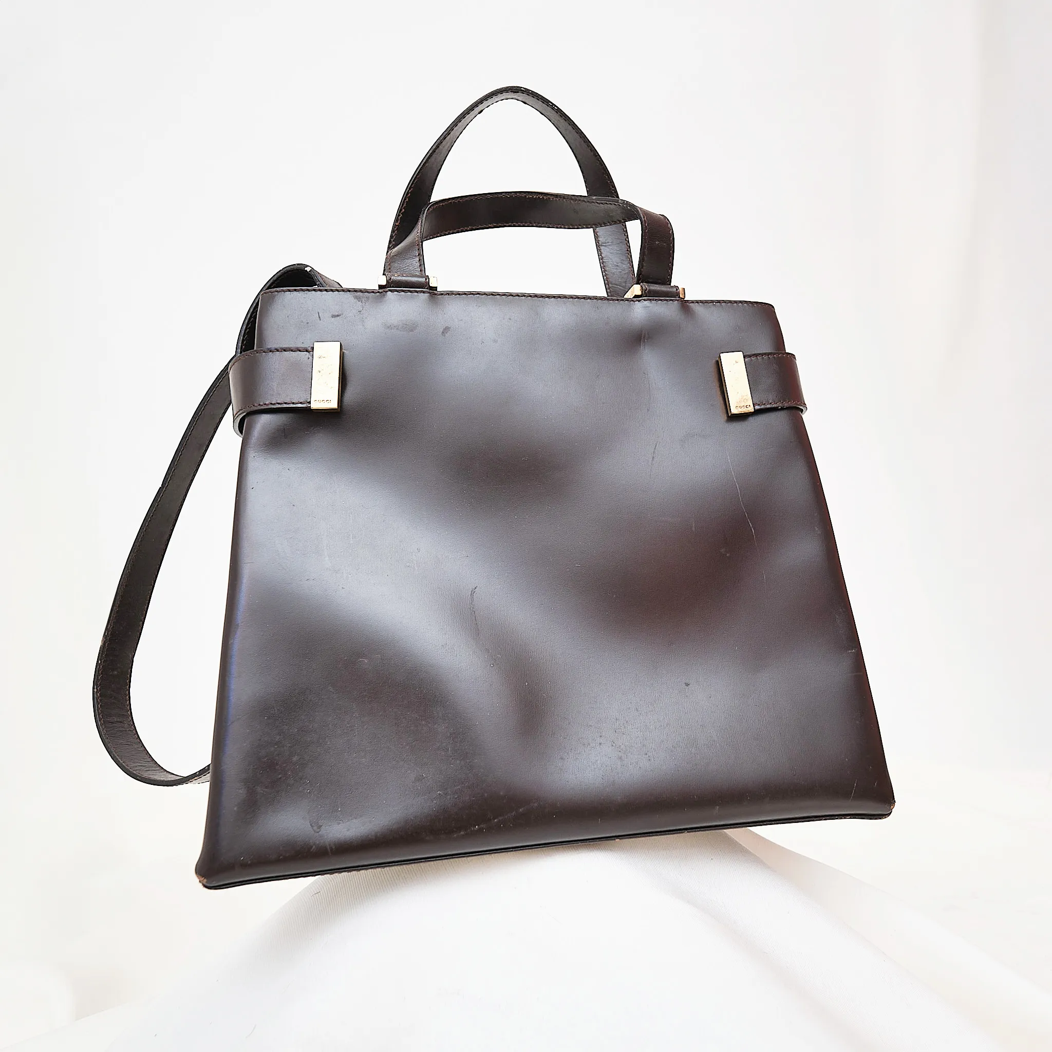 Condition: Fair vintage condition. The leather shows creasing, scratches, and needs cleaning/restoration. Fully usable as-is but best suited for someone who appreciates a well-loved designer piece with potential for a refresh.