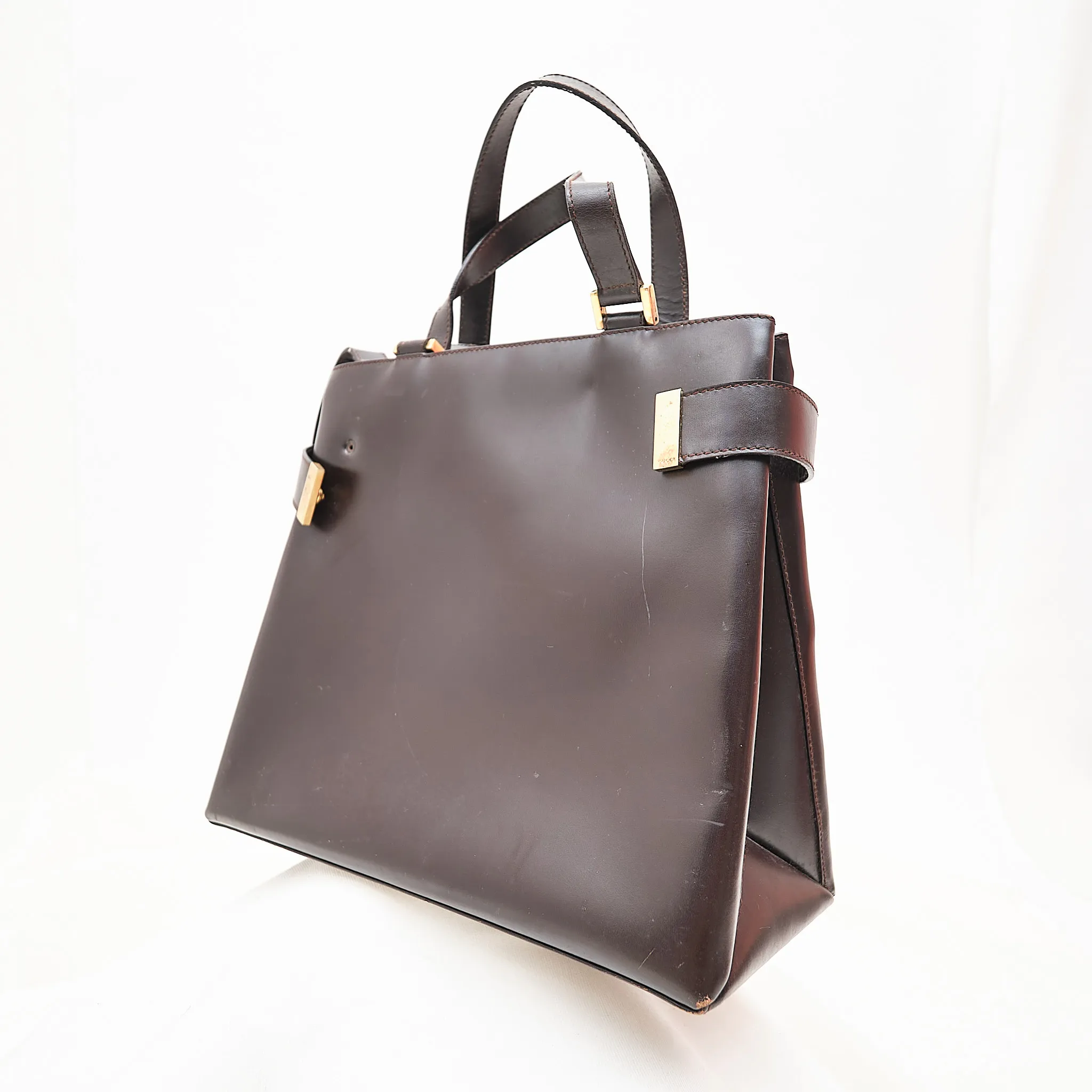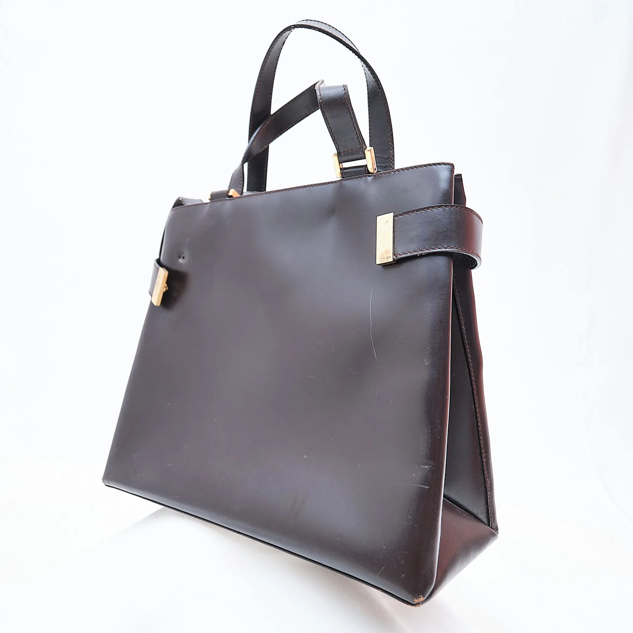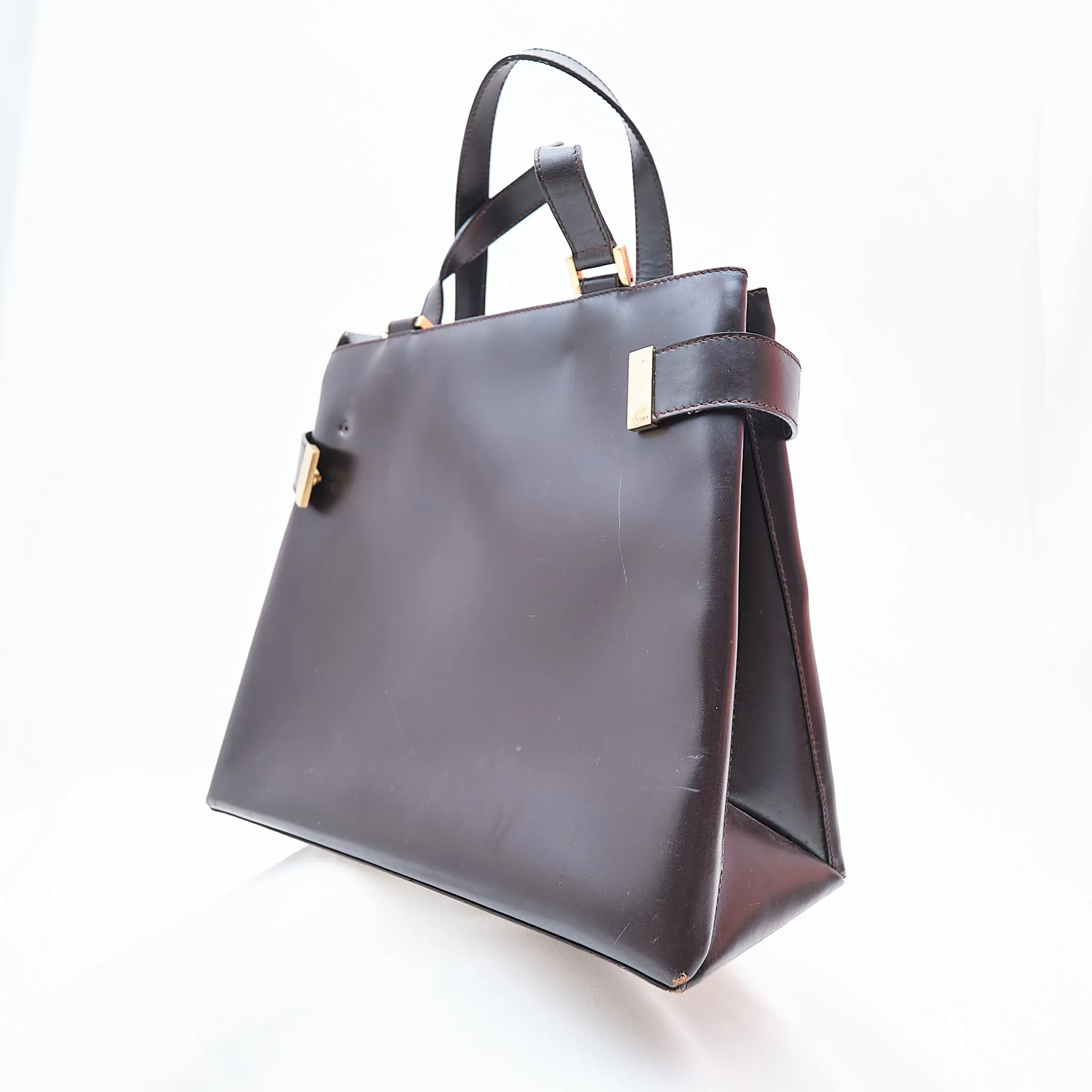 A rare and collectible piece from the Tom Ford era at Gucci, this 1990s structured satchel embodies understated sophistication. Crafted in rich brown leather with gold-tone accents, it features double top handles, an optional crossbody strap, protective base feet, and a spacious multi-compartment interior with zip pocket.