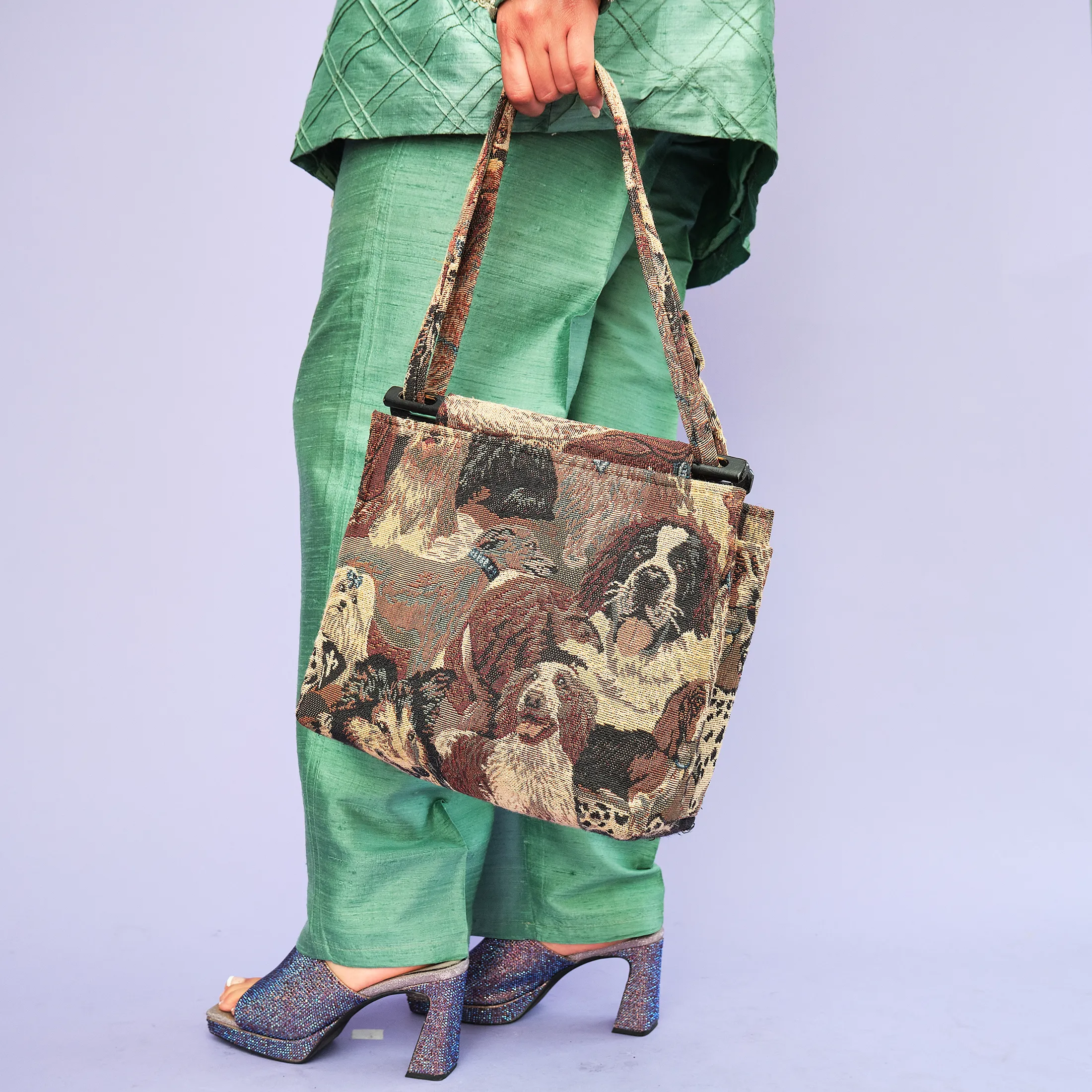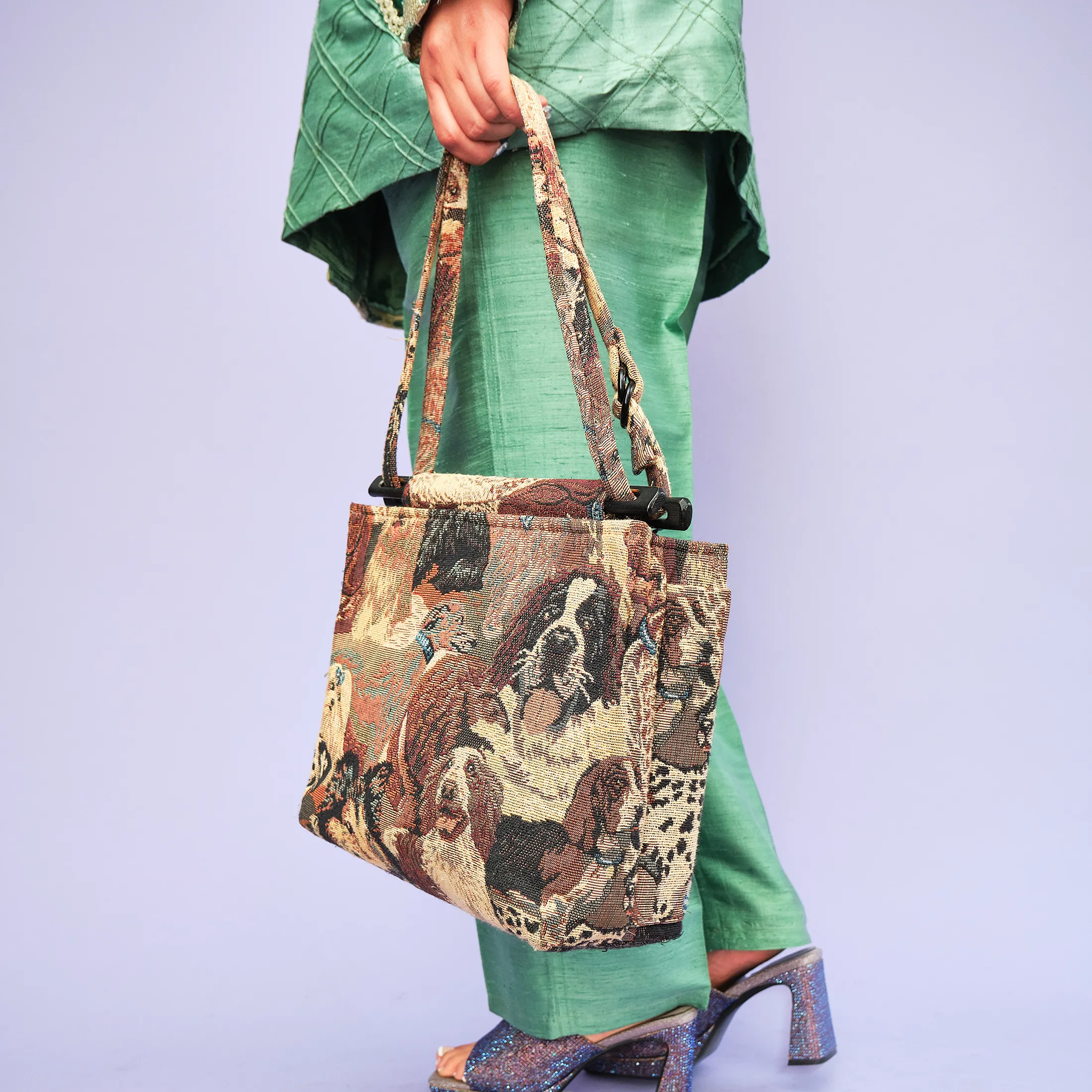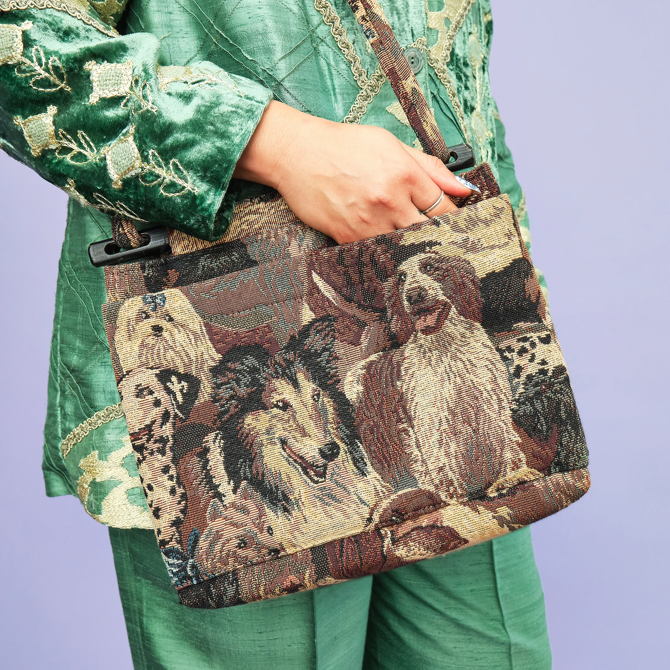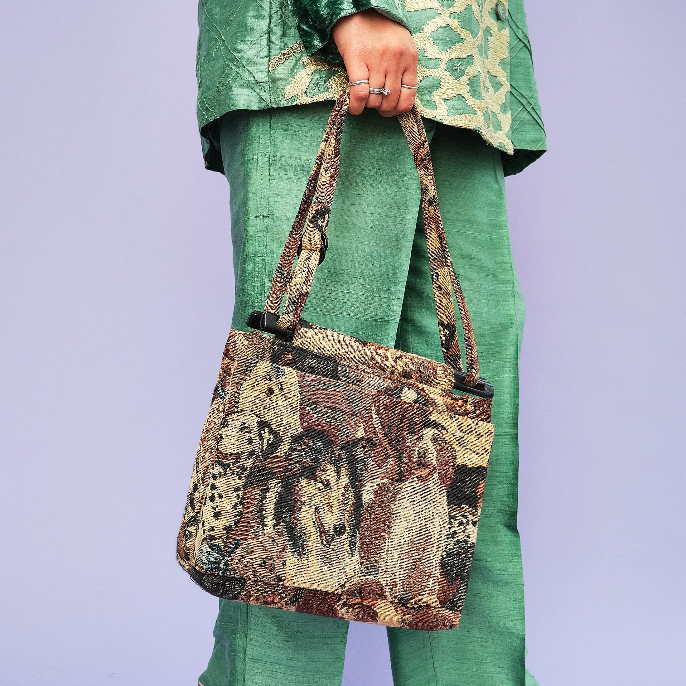 This delightfully nostalgic 1990s tapestry bag features a detailed jacquard weave depicting a lineup of cheerful dogs—including a Collie, Dalmatian, Saint Bernard, and more—rendered in rich earth tones. The structure is softly boxy, with an easy double-strap shoulder design and plastic loop hardware that adds to its vintage charm. A single pocket keeps your essentials handy without interrupting the visual flow of the canines.