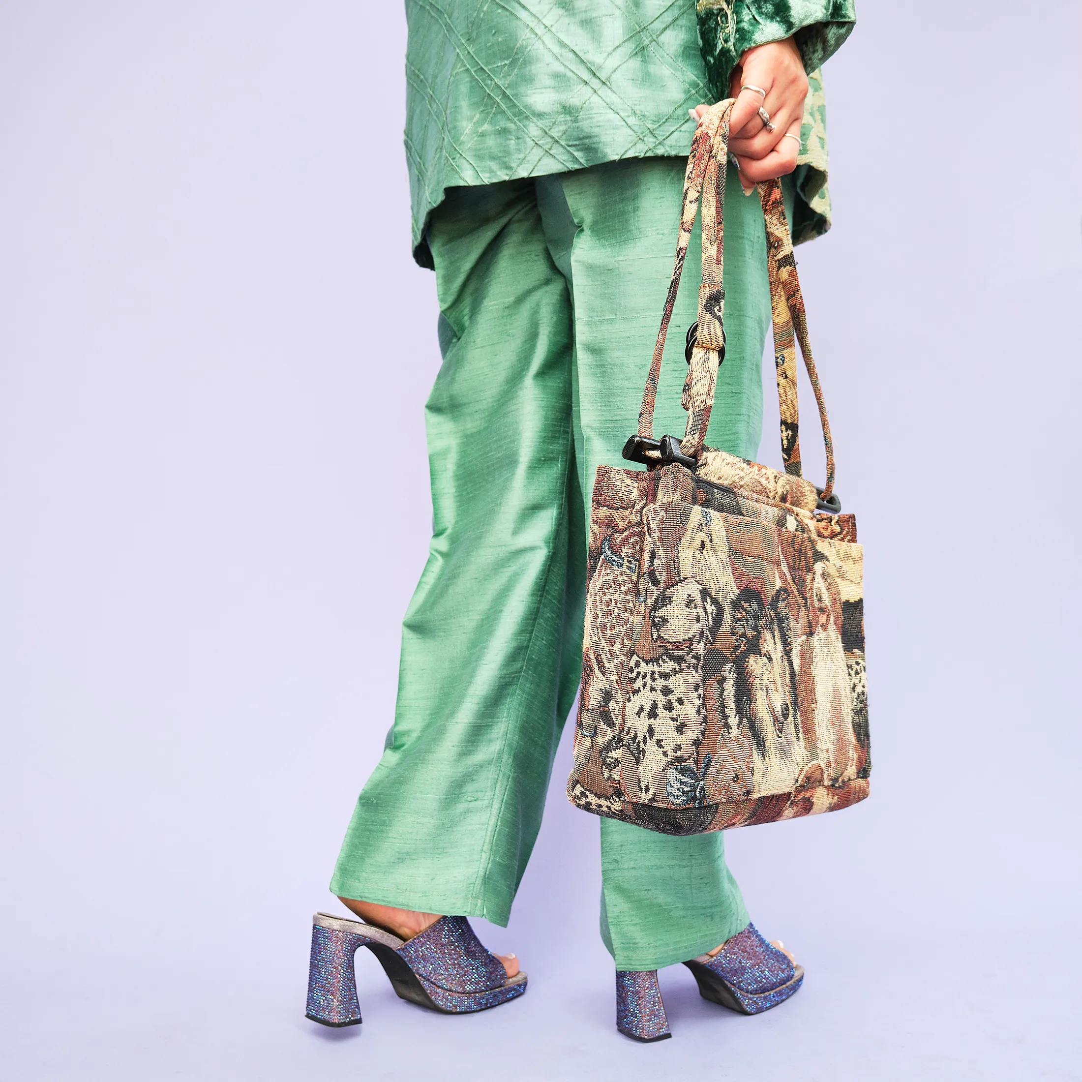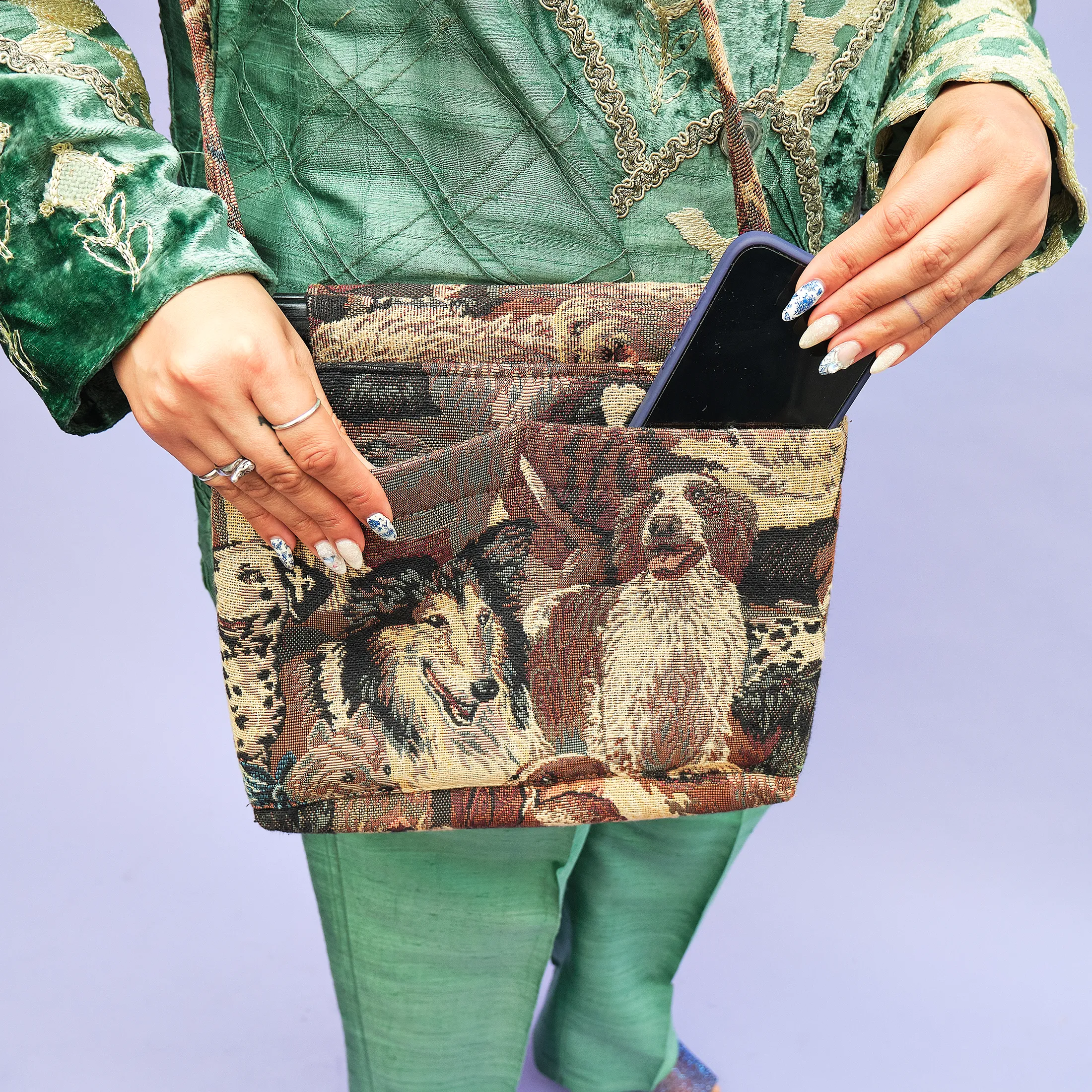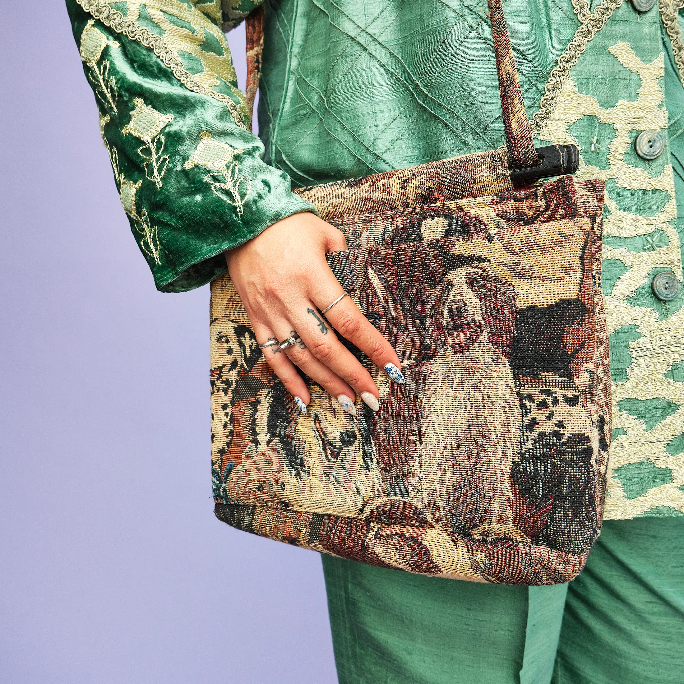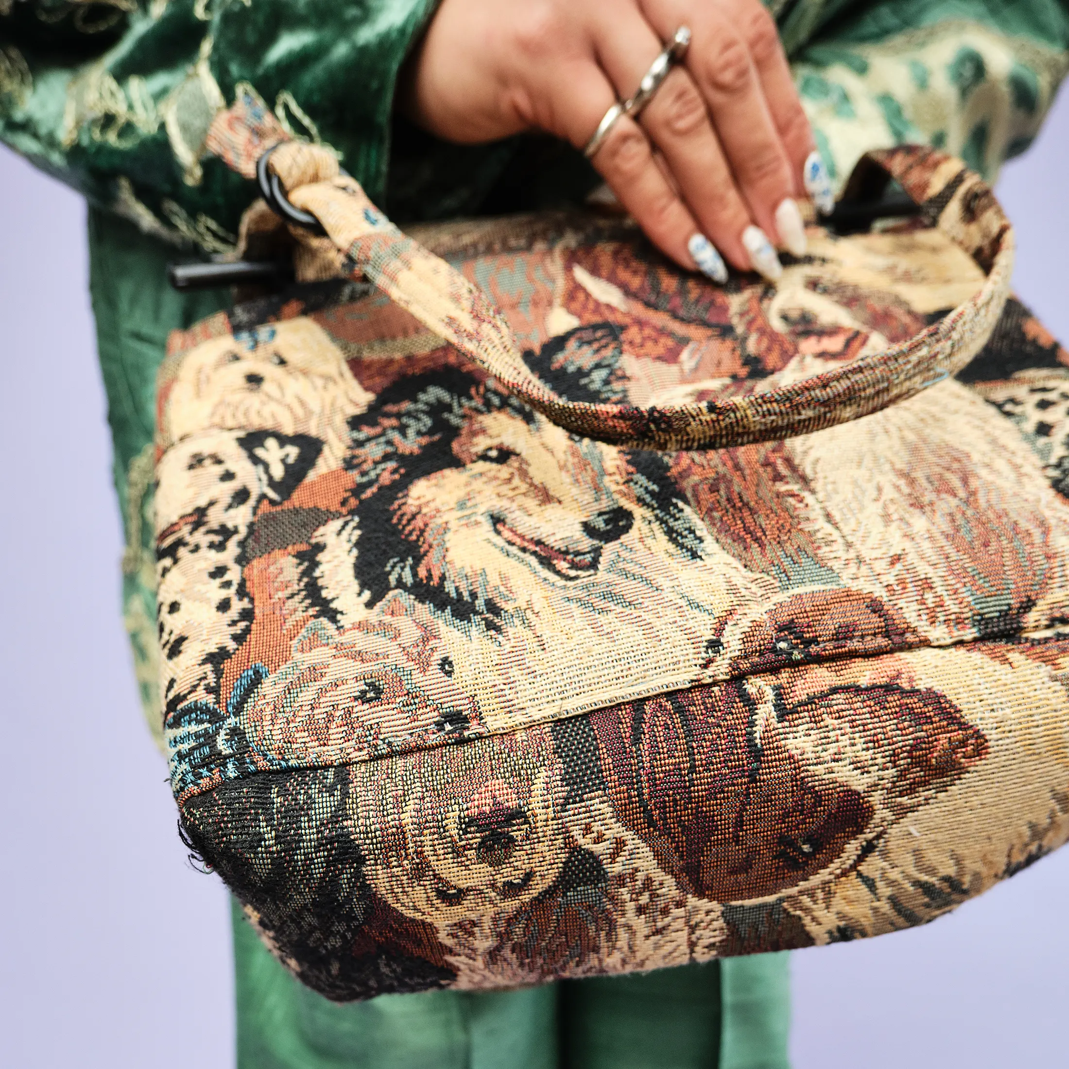 This delightfully nostalgic 1990s tapestry bag features a detailed jacquard weave depicting a lineup of cheerful dogs—including a Collie, Dalmatian, Saint Bernard, and more—rendered in rich earth tones. The structure is softly boxy, with an easy double-strap shoulder design and plastic loop hardware that adds to its vintage charm. A single pocket keeps your essentials handy without interrupting the visual flow of the canines.