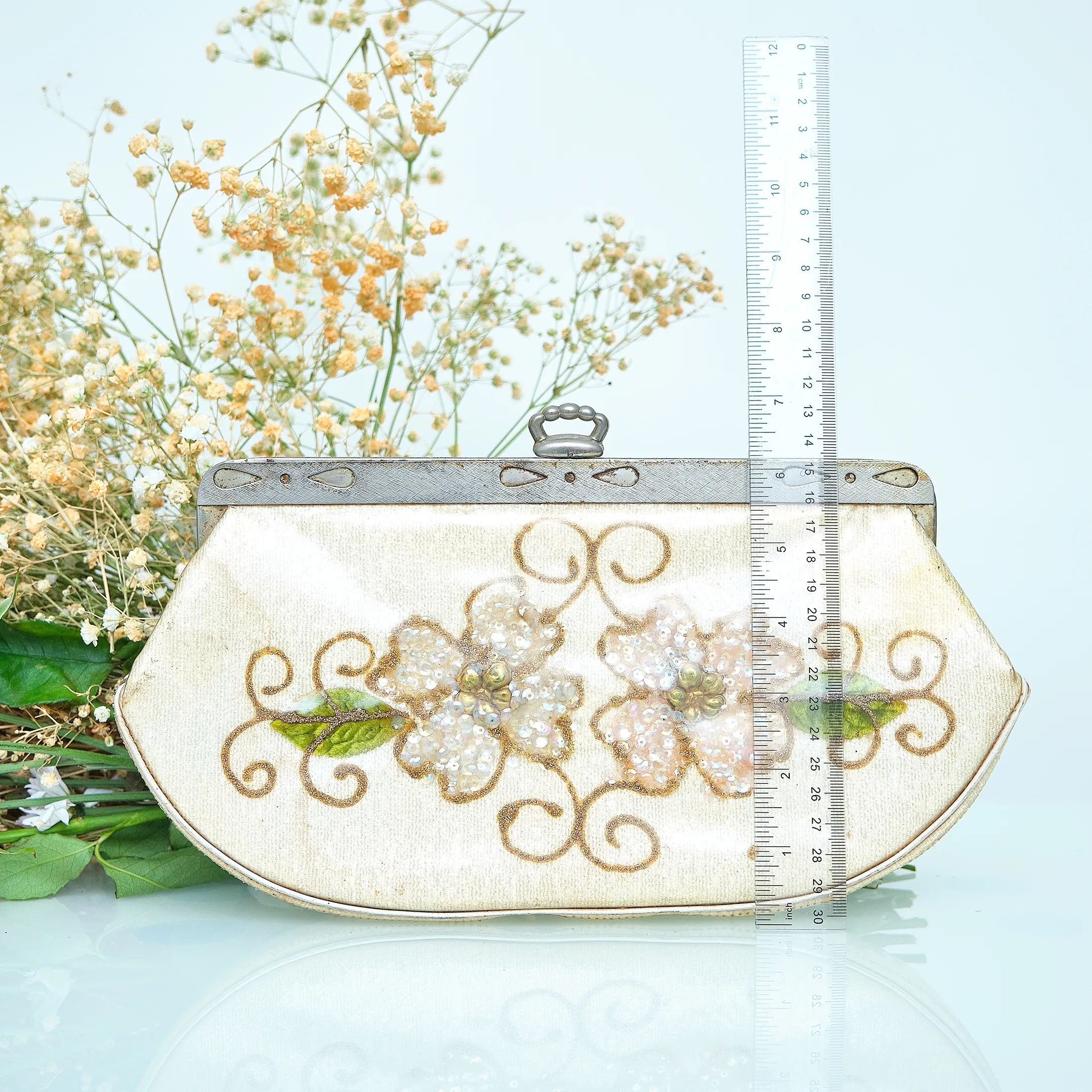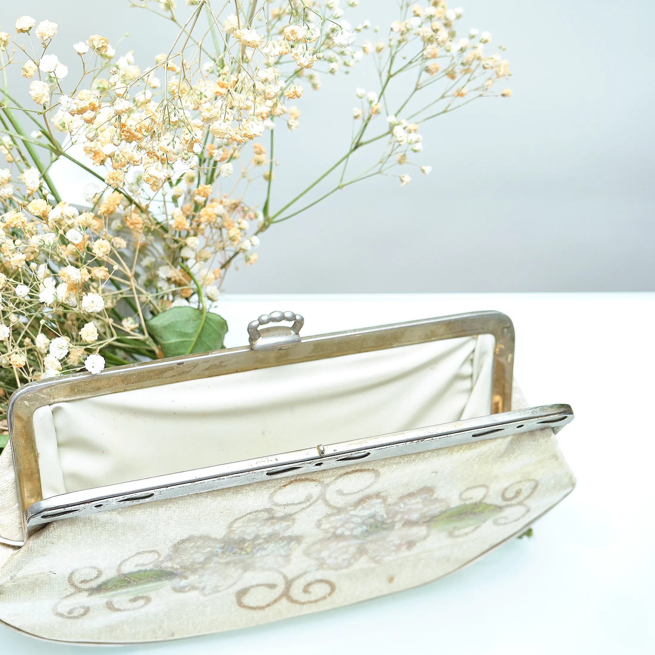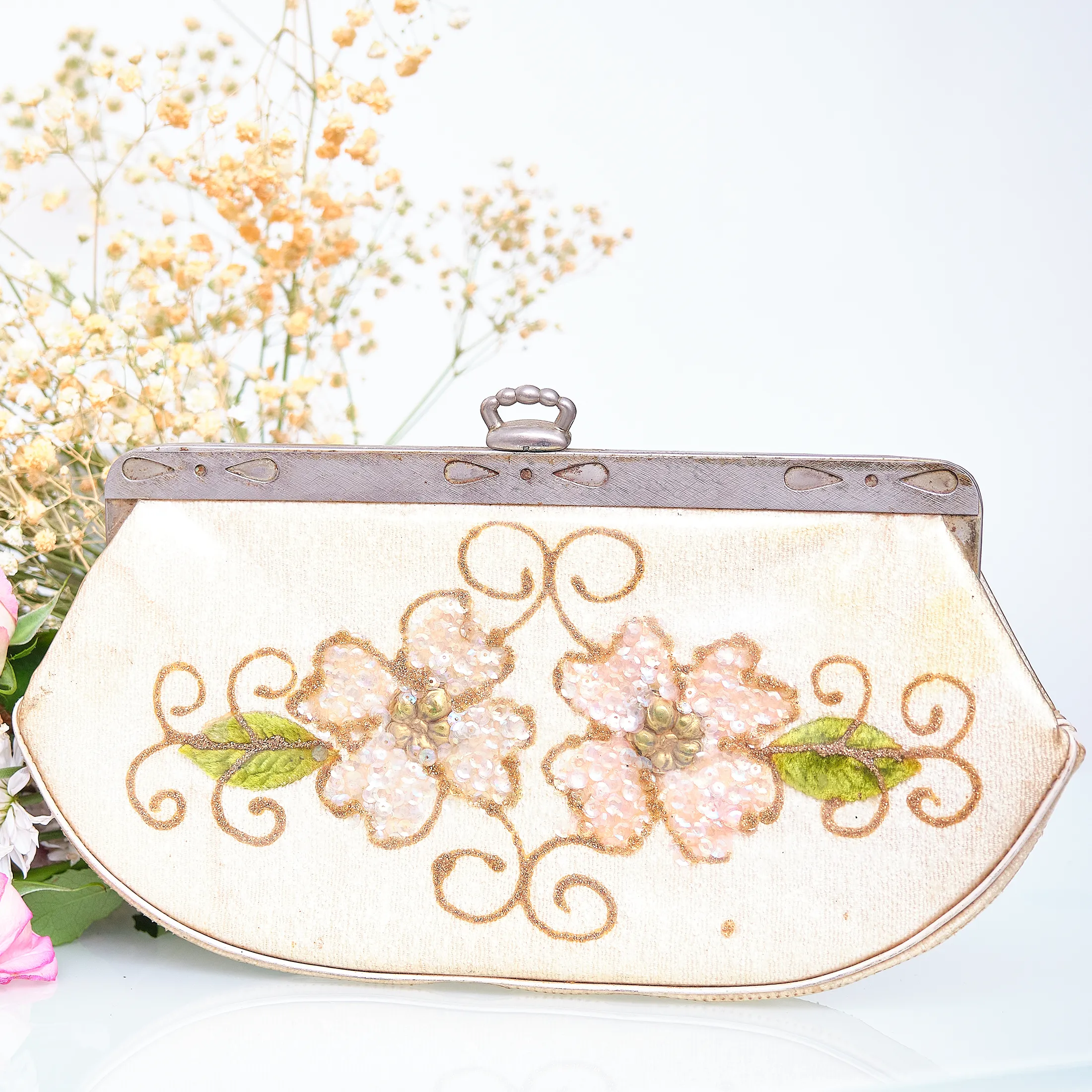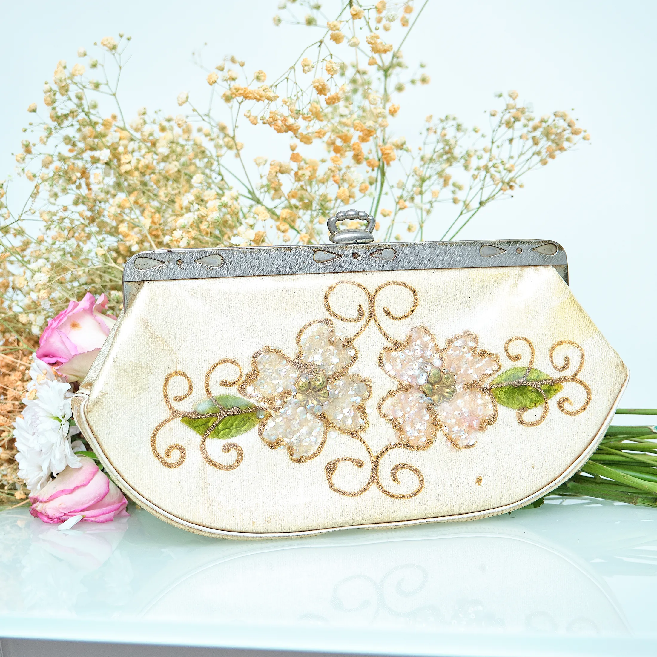 This early 1960s clutch embodies the era’s love of ornamentation and ladylike detail. Designed in a floral tapestry motif with pastel sequins and green velvet leaf accents, the exterior is protected by a clear vinyl overlay, giving it both shimmer and resilience. A silver-tone metal frame with bow-etched detail and a kiss-lock closure adds an extra touch of charm.