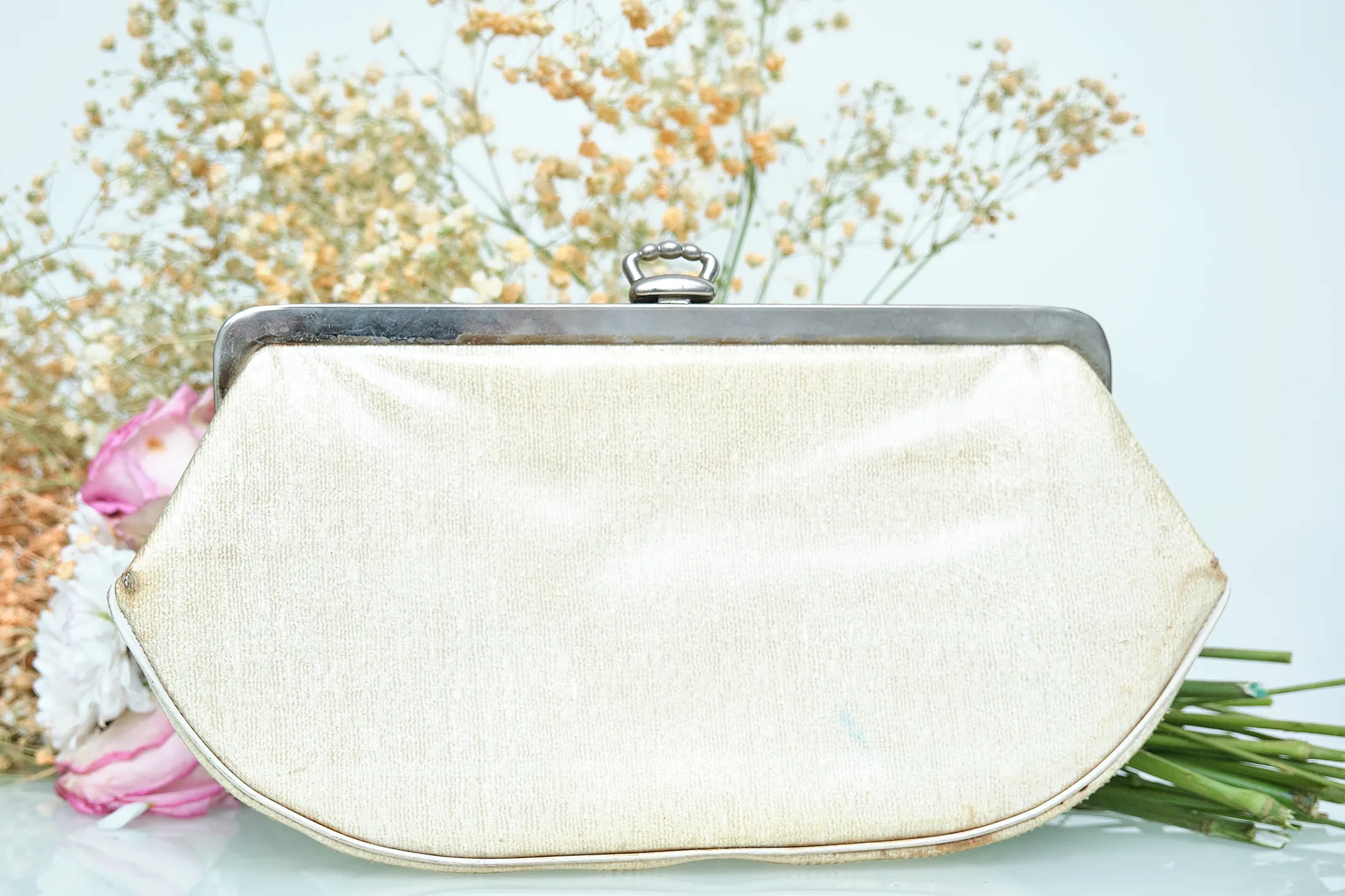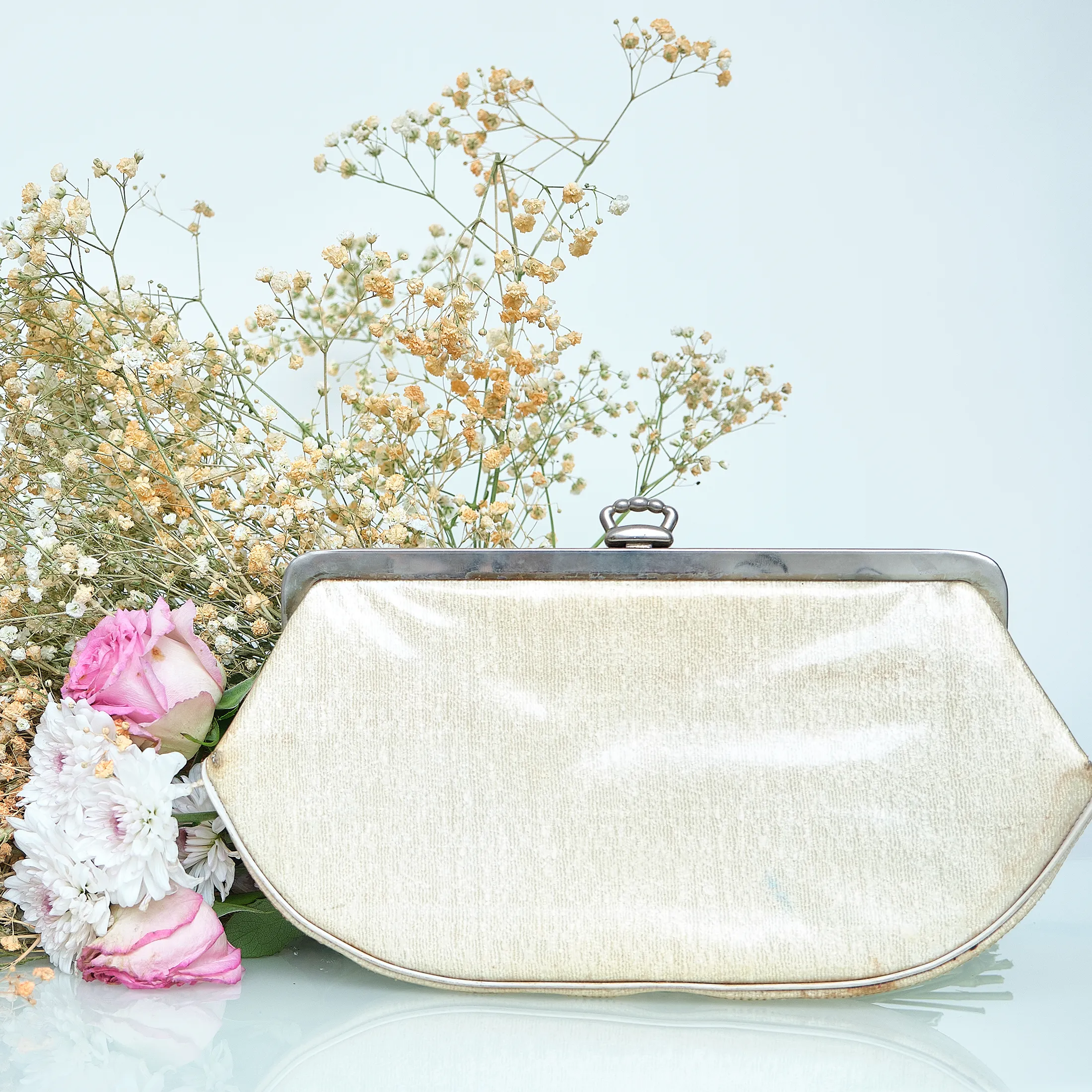 The softly structured silhouette is slightly wider at the base, offering more capacity than most midcentury clutches. Inside, a smooth satin lining keeps things elegant and timeless.