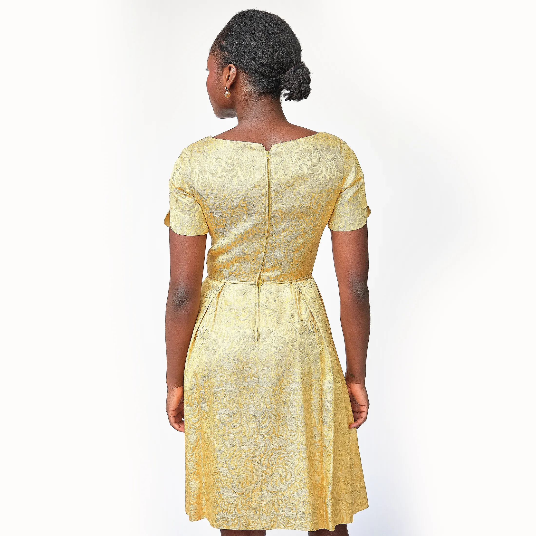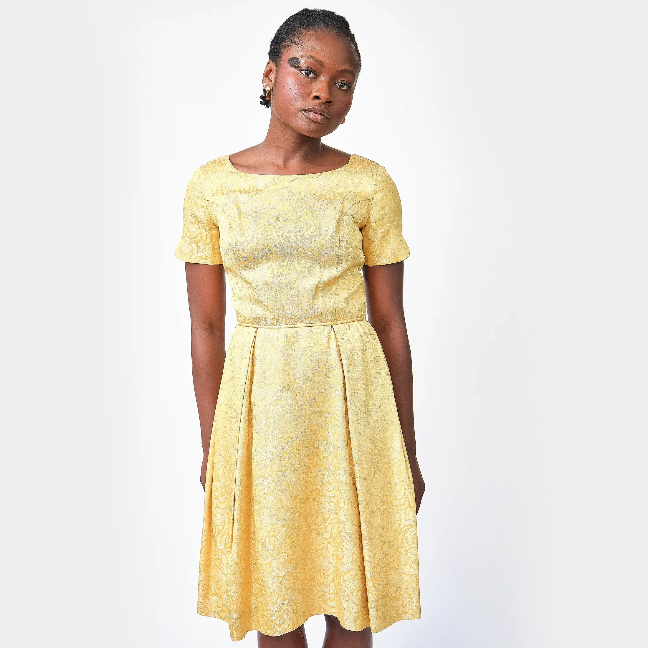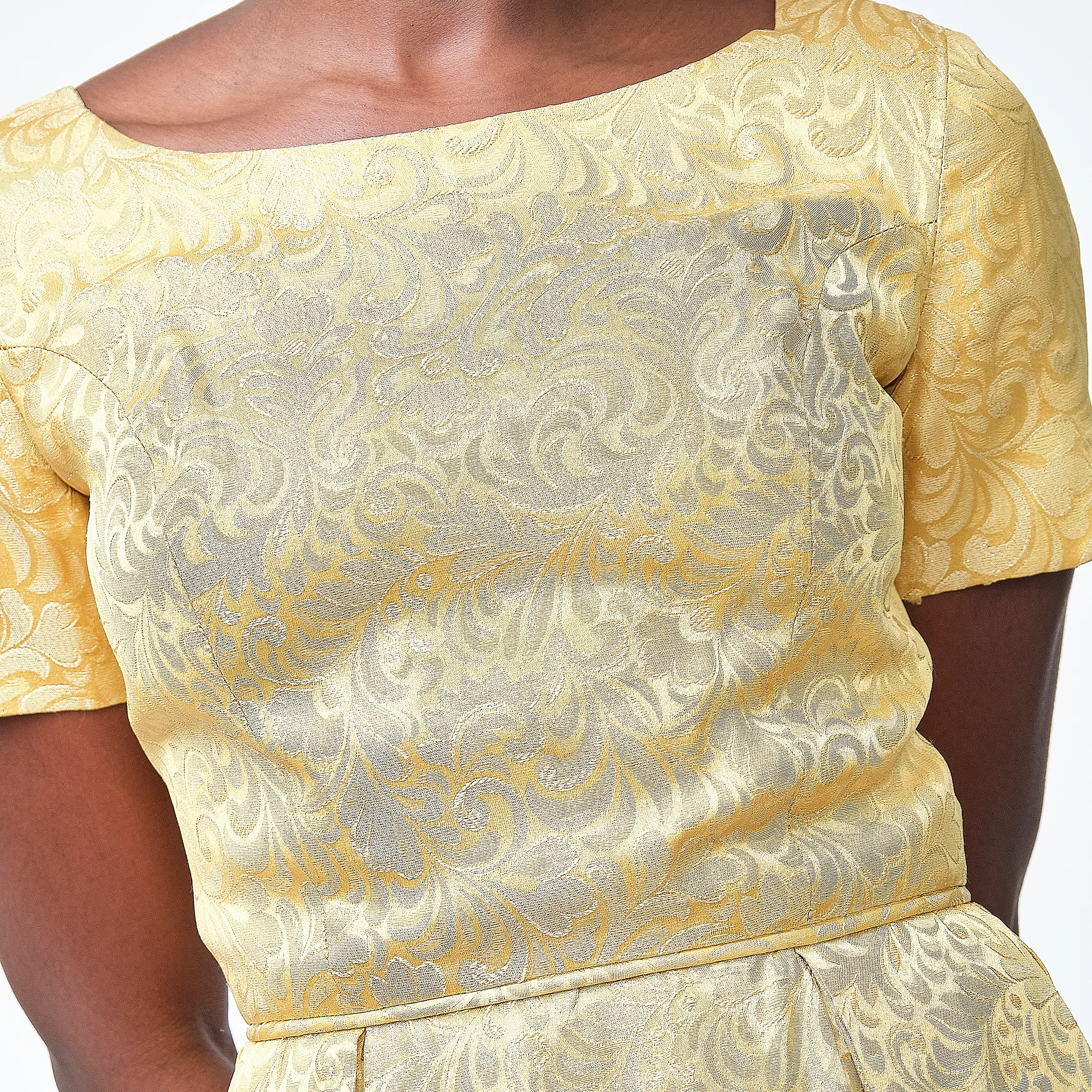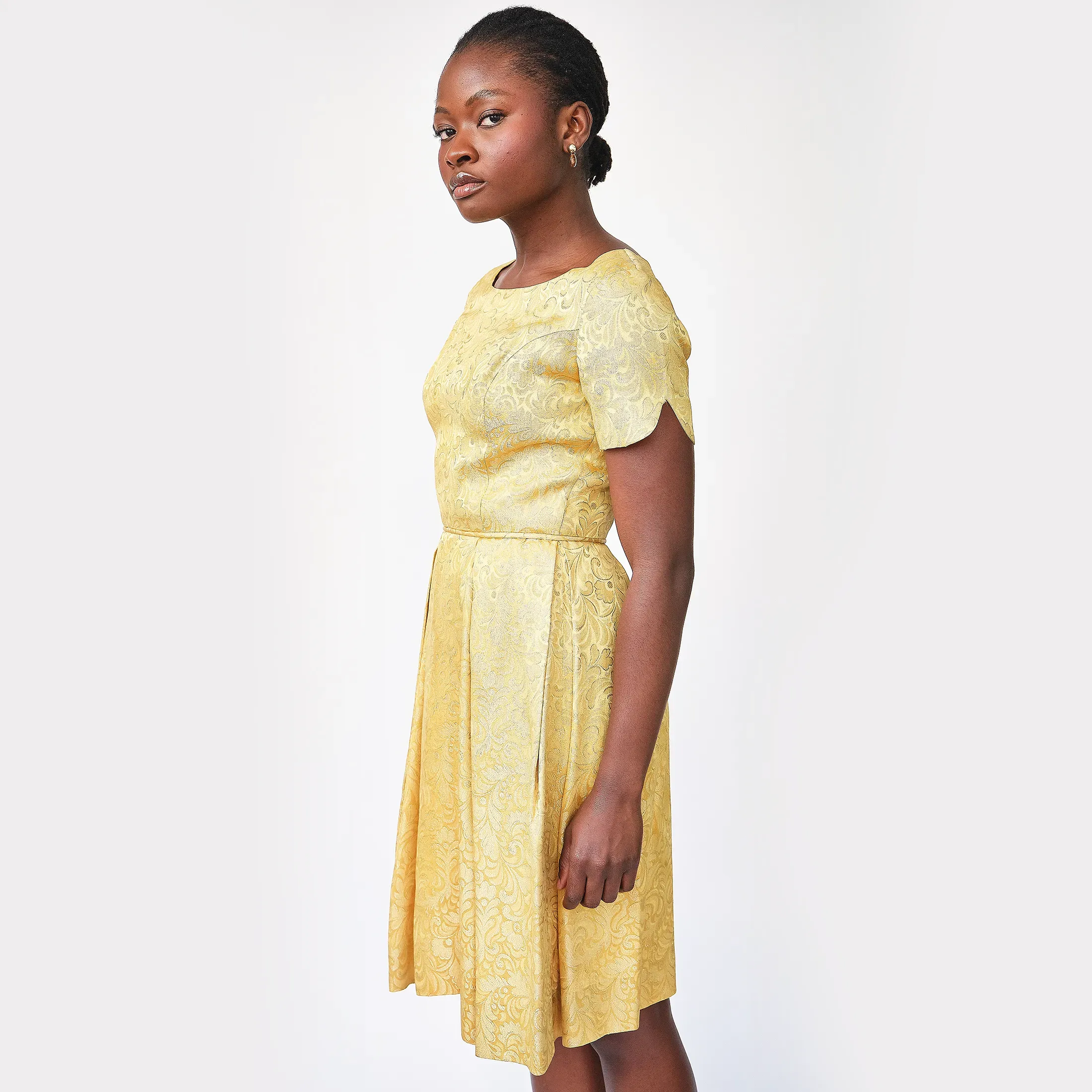 A total showstopper. This luminous gold brocade dress embodies mid-century sophistication with its tailored bodice, fit-and-flare silhouette, and pleated skirt that offers just the right amount of volume. The brocade has a regal baroque-inspired motif with glinting gold threadwork that catches the light, perfect for cocktail events, formal occasions, or modern bridal alternative wear. Subtle scalloped sleeve hems and a narrow matching waist tie add charming detail. Finished with a classic back zipper and clean interior seams.