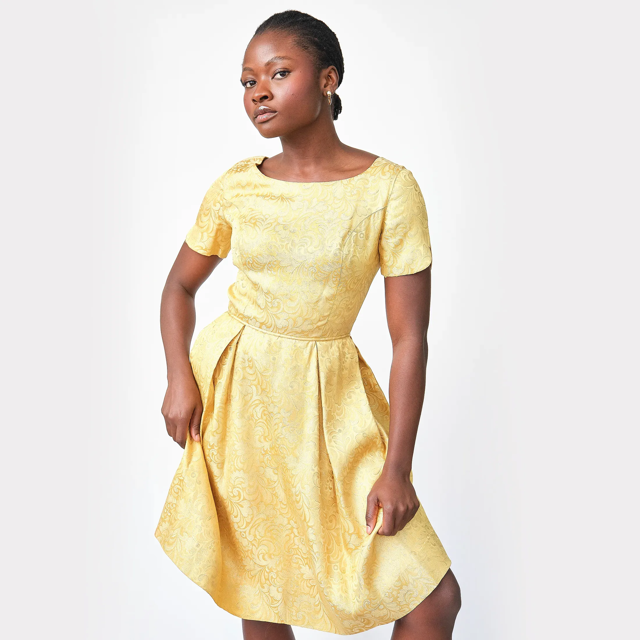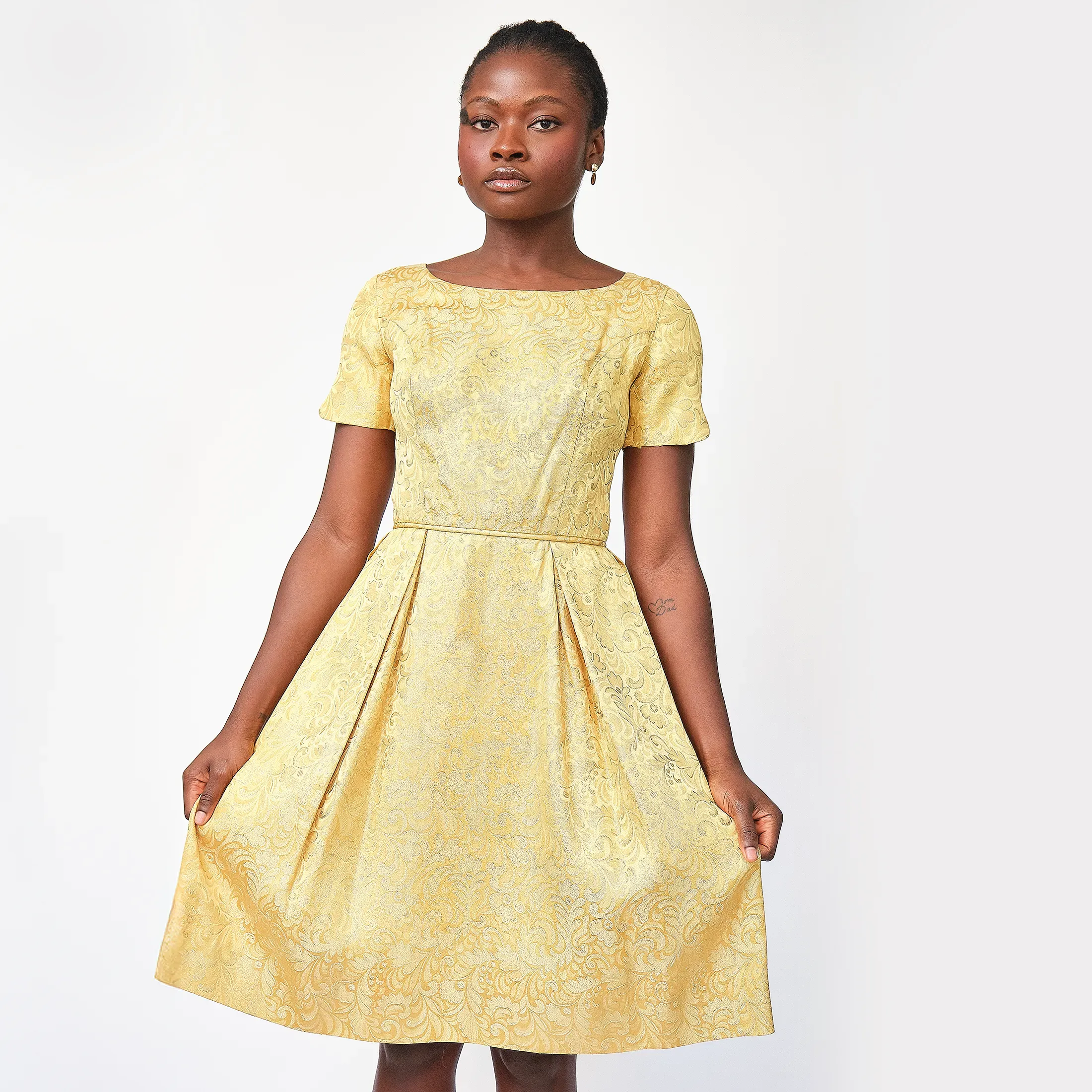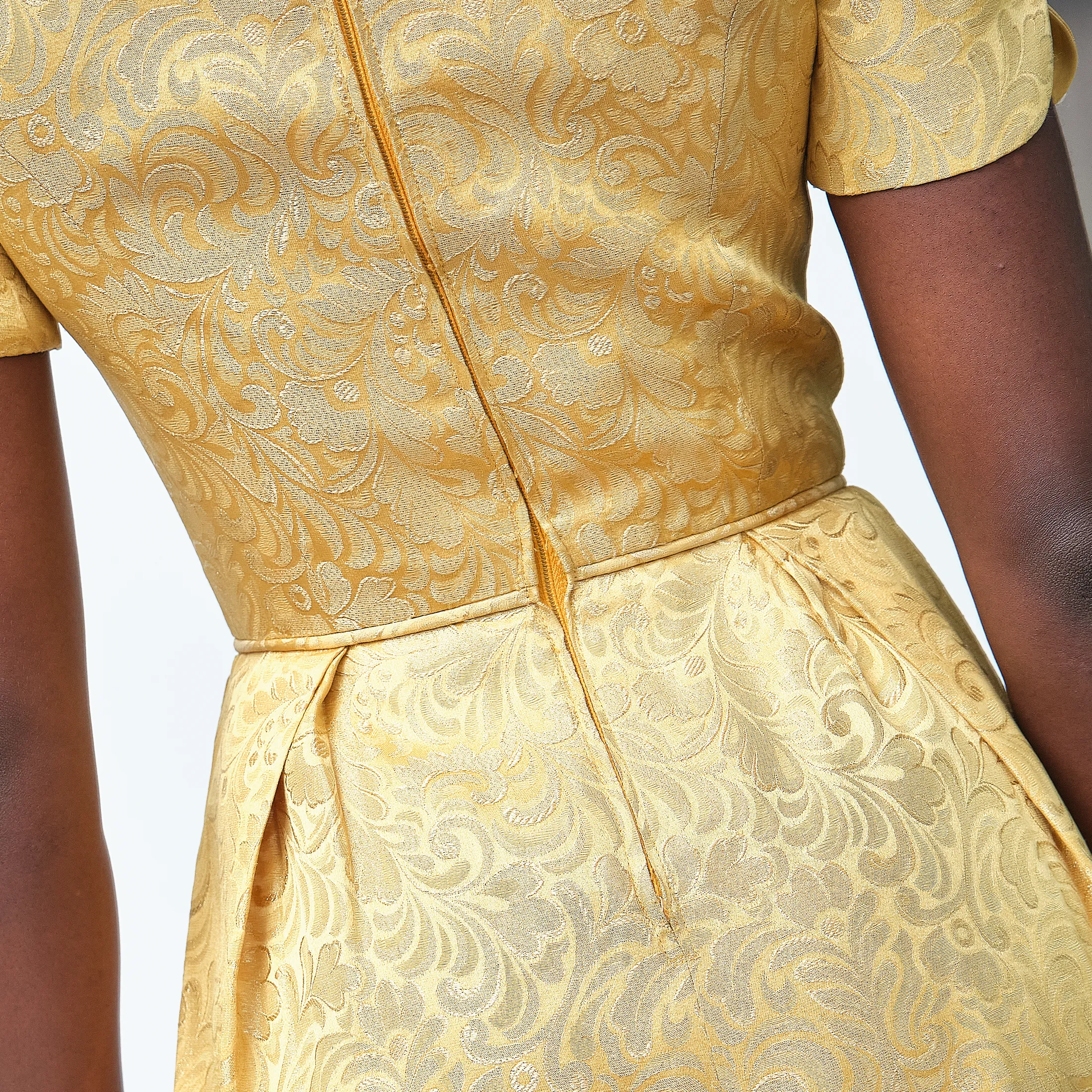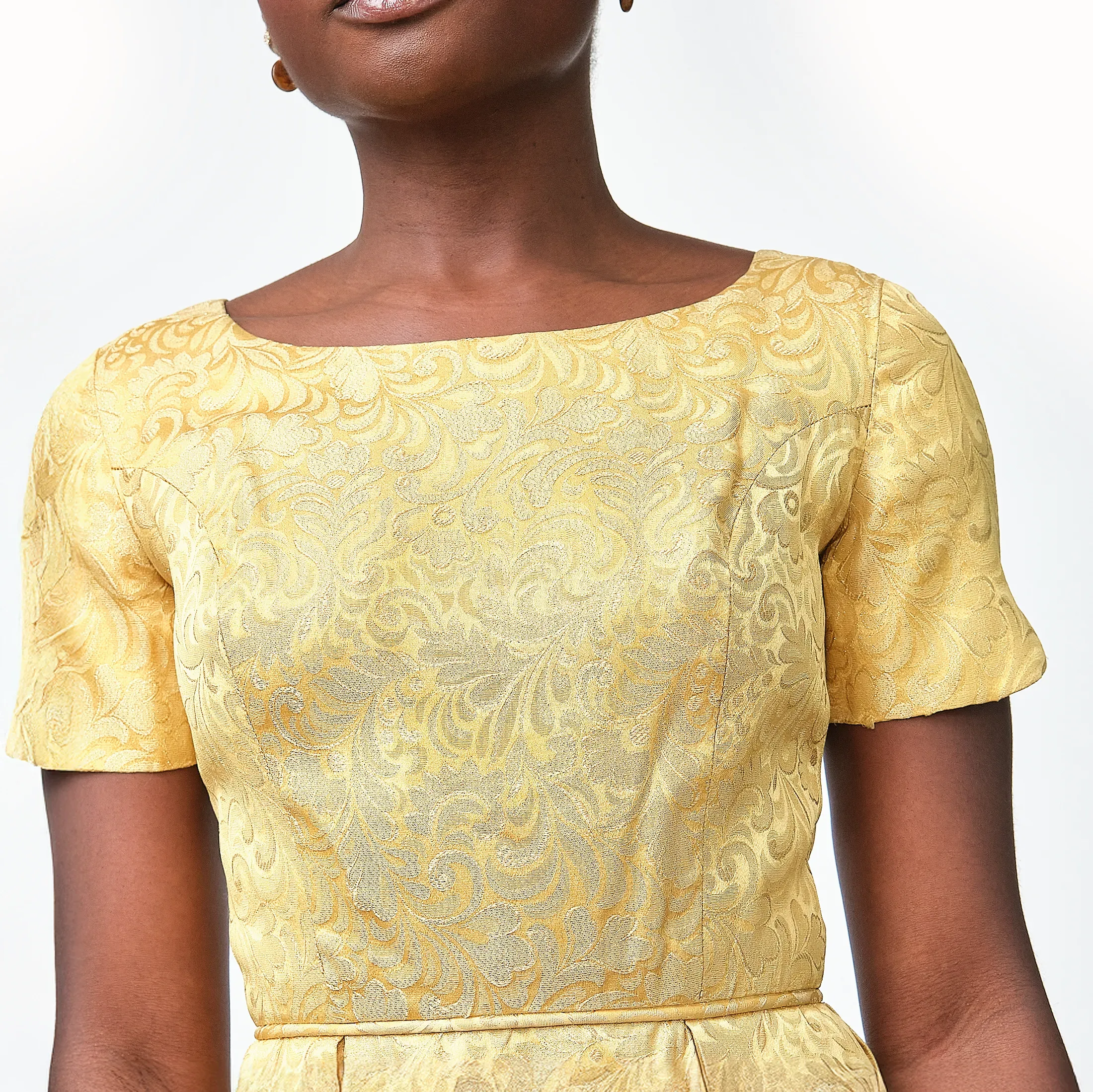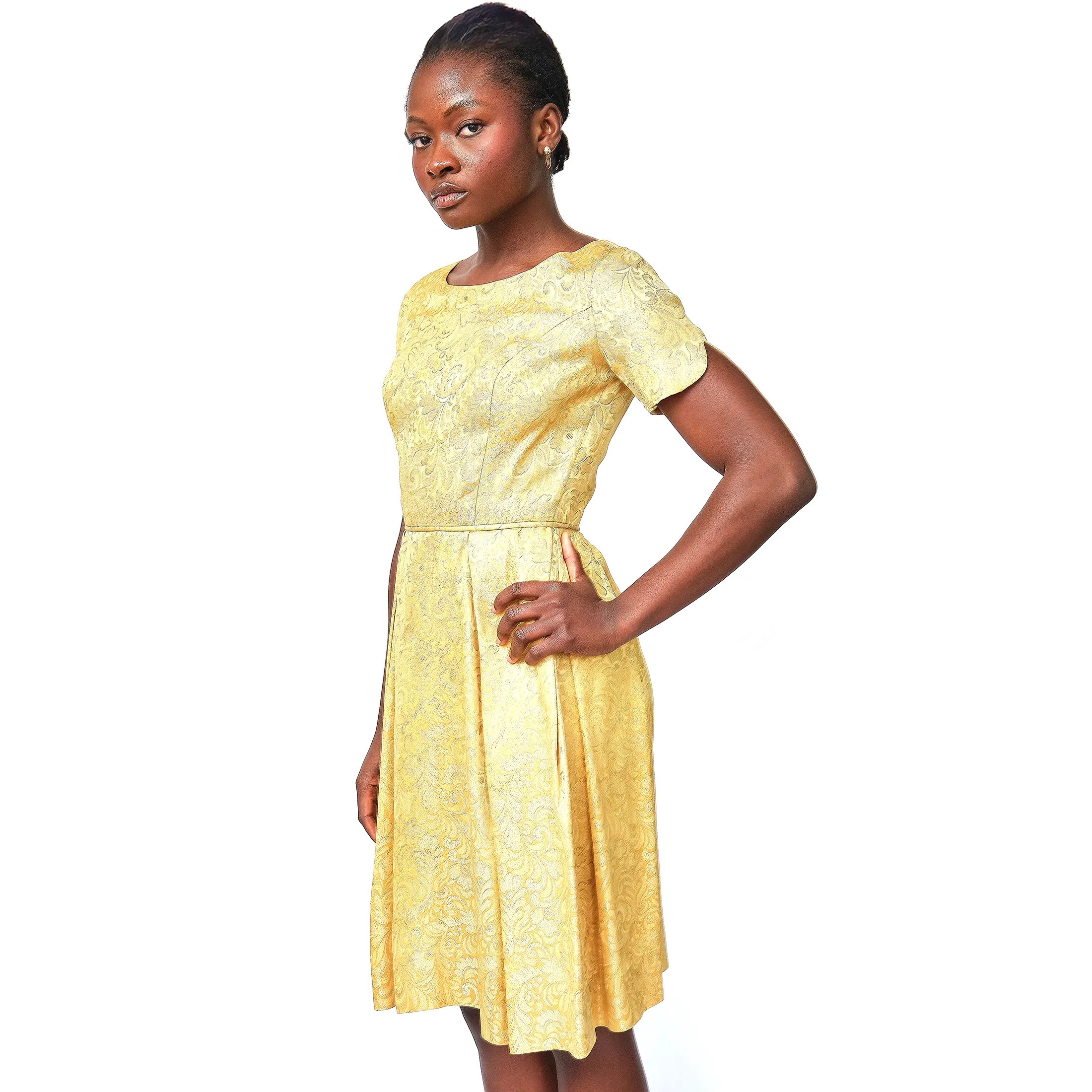 A total showstopper. This luminous gold brocade dress embodies mid-century sophistication with its tailored bodice, fit-and-flare silhouette, and pleated skirt that offers just the right amount of volume. The brocade has a regal baroque-inspired motif with glinting gold threadwork that catches the light, perfect for cocktail events, formal occasions, or modern bridal alternative wear. Subtle scalloped sleeve hems and a narrow matching waist tie add charming detail. Finished with a classic back zipper and clean interior seams.