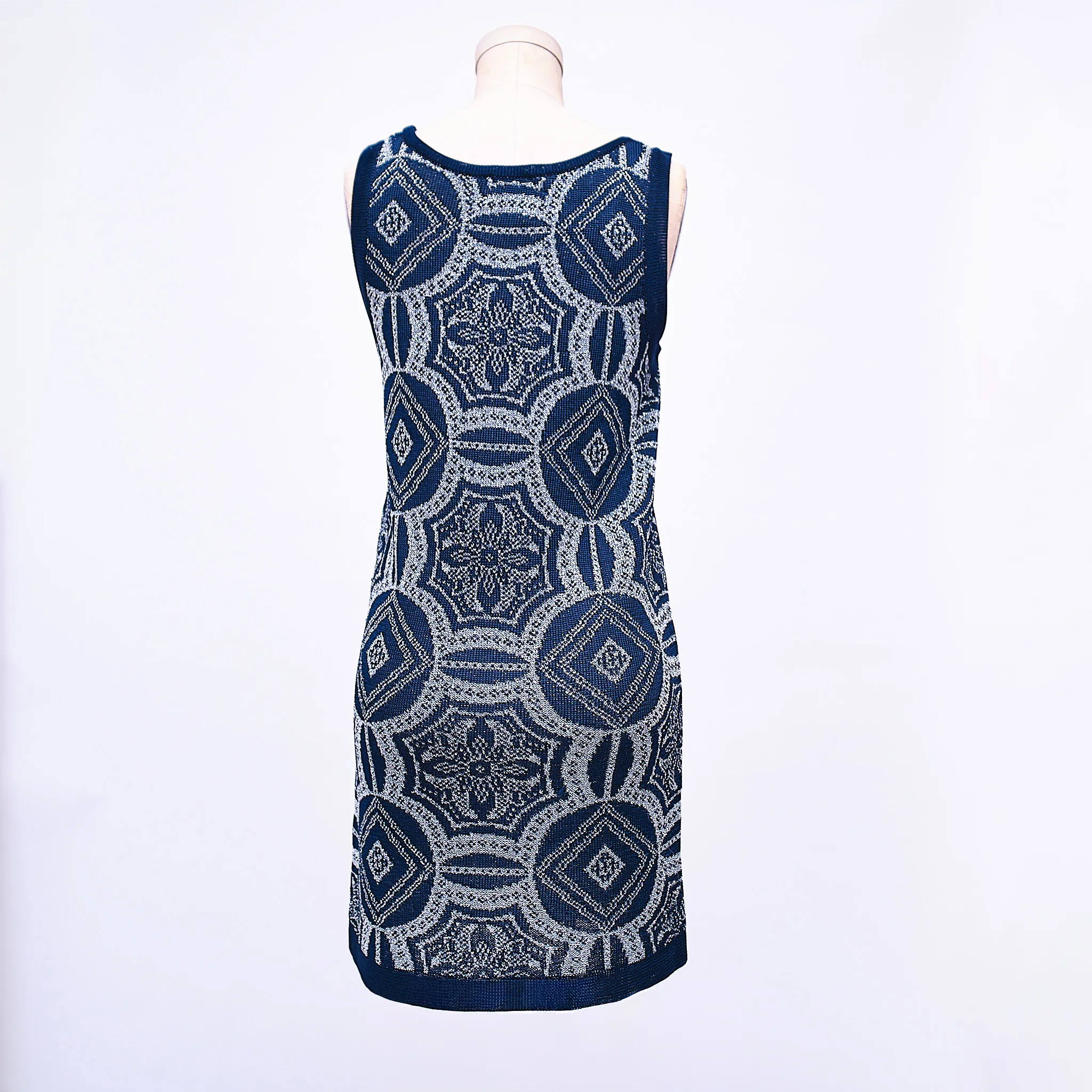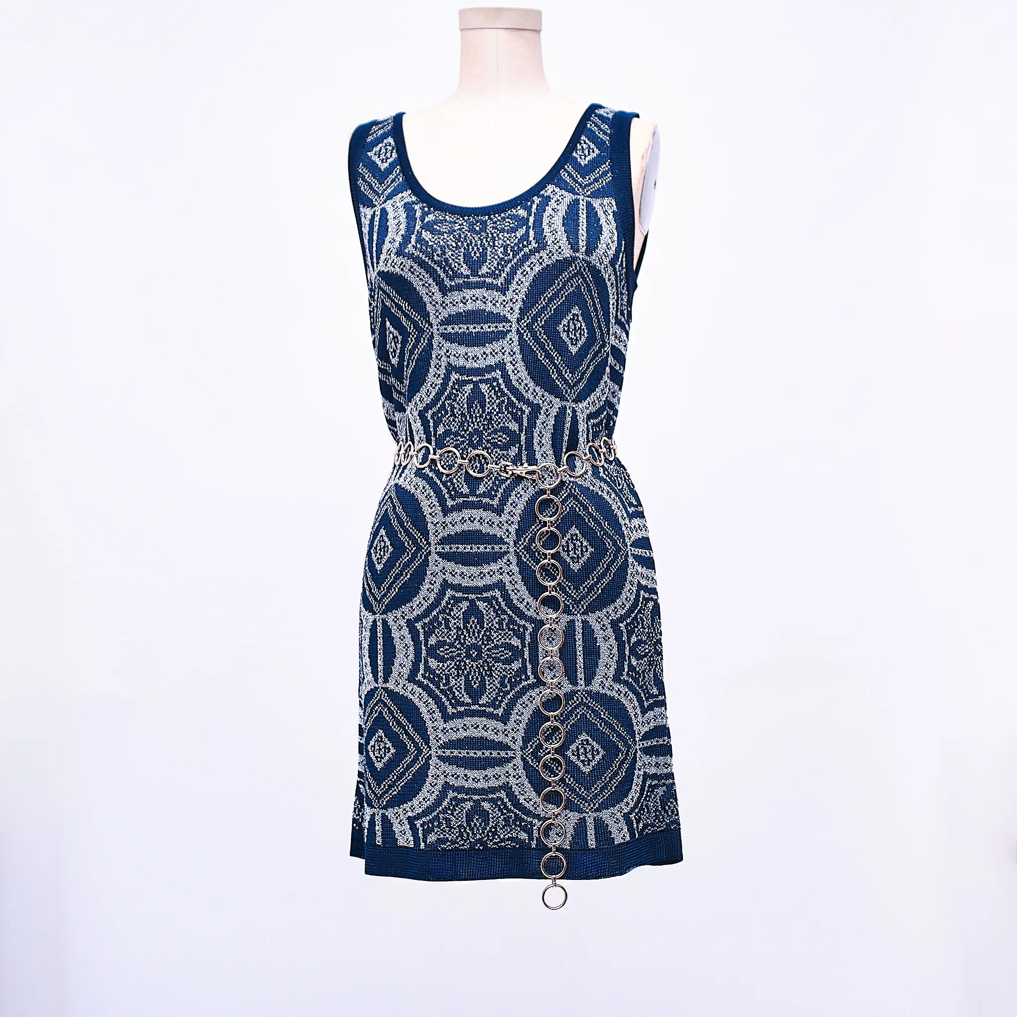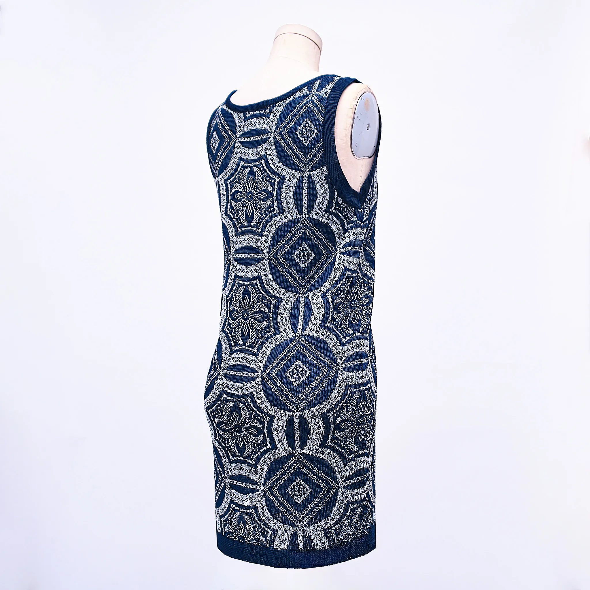 This rare Luciano Soprani Sport knit mini dress from the late 1980s to early 1990s captures the playful yet sophisticated energy of Italian fashion at the time. Designed in a sleeveless mini silhouette, it features a striking navy and grey geometric knit pattern that feels both timeless and contemporary. The body-skimming cut flatters the frame while offering just enough stretch for ease of movement.