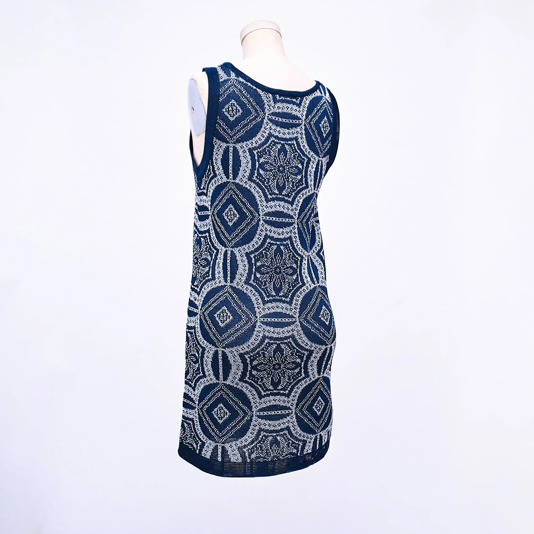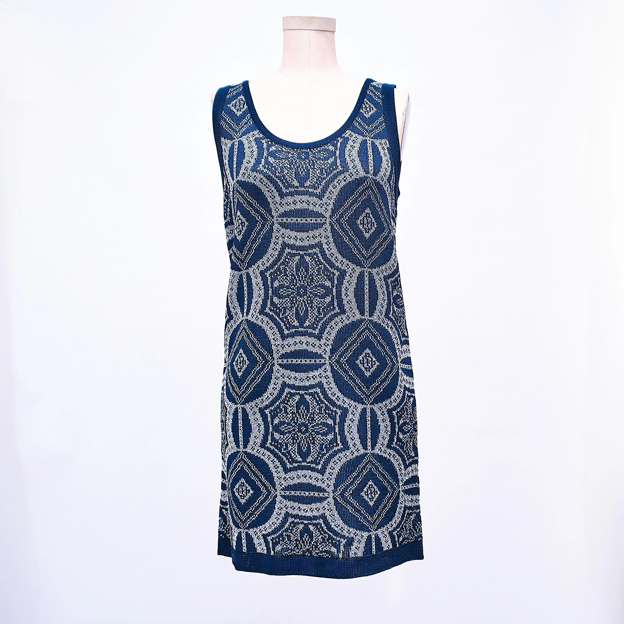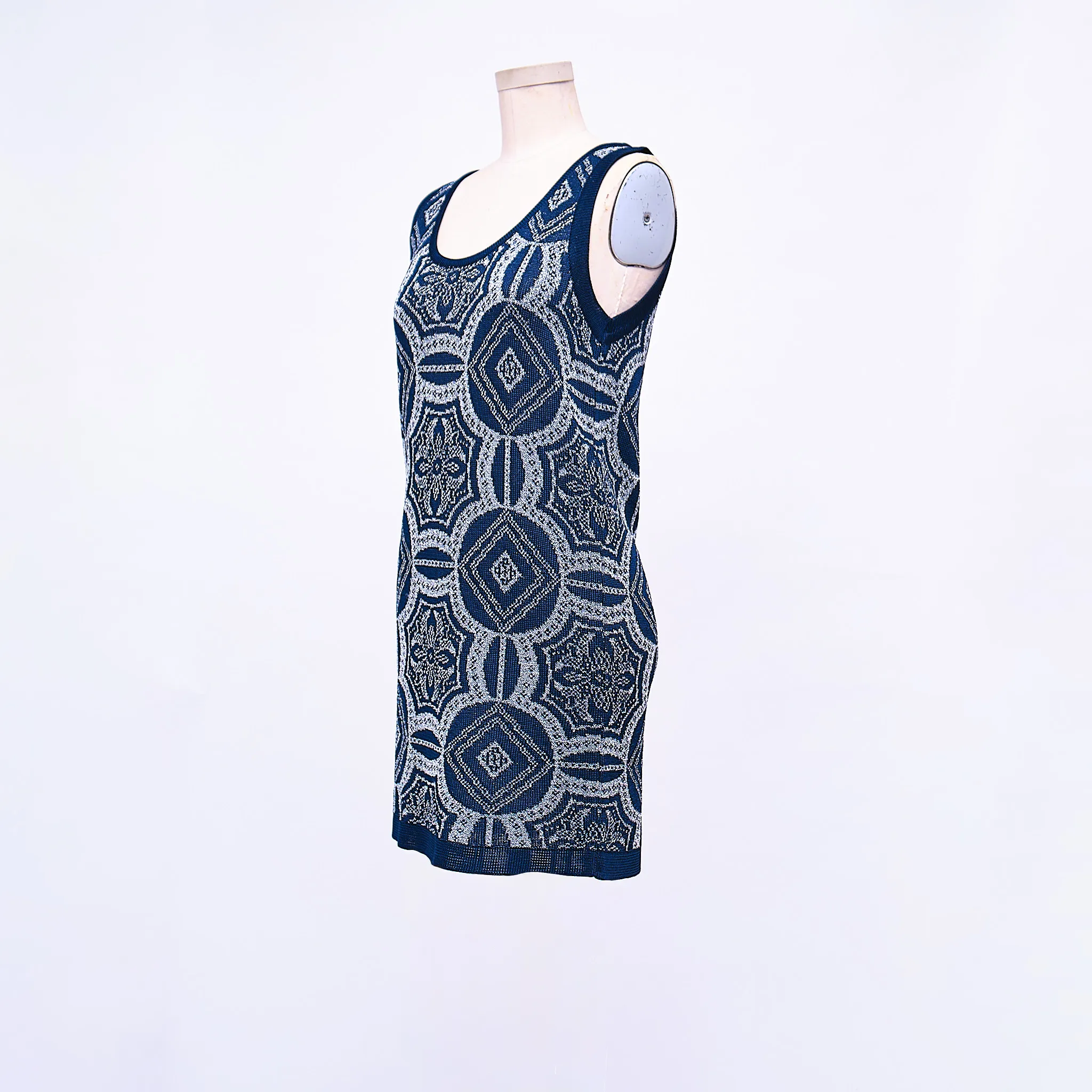 This rare Luciano Soprani Sport knit mini dress from the late 1980s to early 1990s captures the playful yet sophisticated energy of Italian fashion at the time. Designed in a sleeveless mini silhouette, it features a striking navy and grey geometric knit pattern that feels both timeless and contemporary. The body-skimming cut flatters the frame while offering just enough stretch for ease of movement.