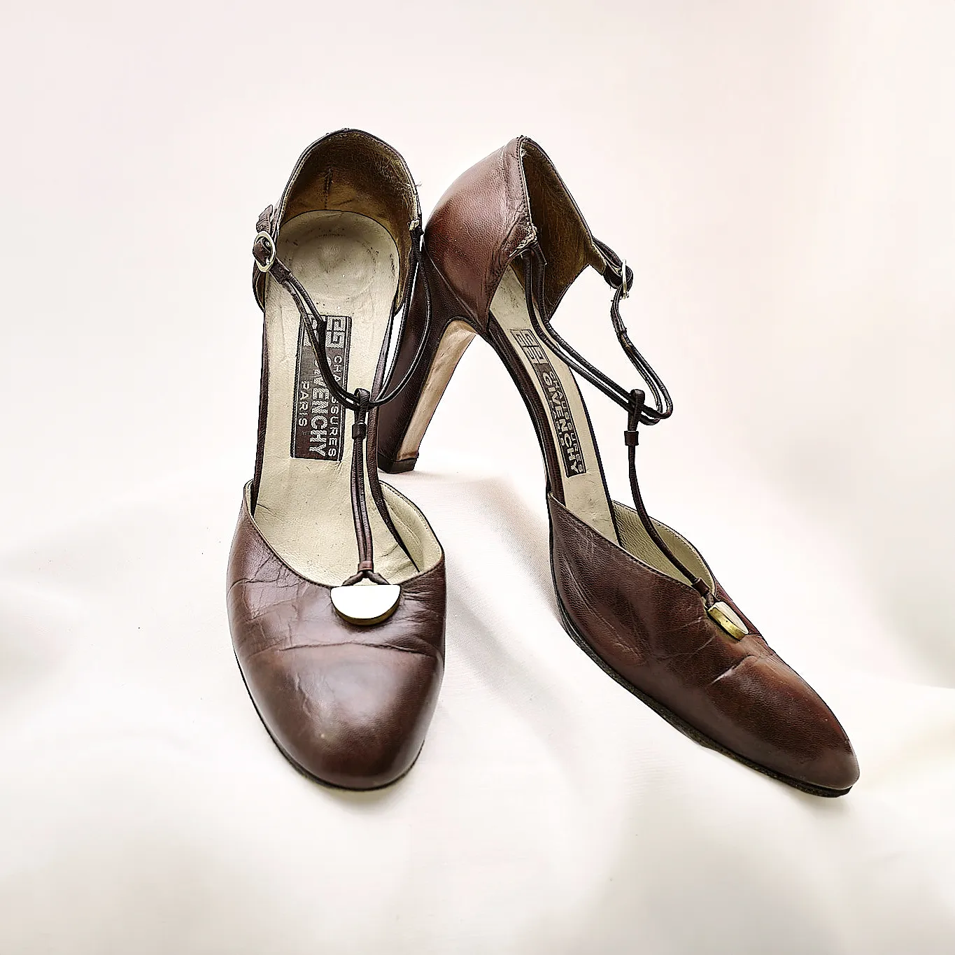 Crafted from rich brown leather, they feature a graceful T-strap silhouette with delicate ankle buckle fastening and a striking gold-tone medallion accent at the vamp. The rounded toe and structured block heel balance classic femininity with everyday wearability, making these a versatile collector’s piece.